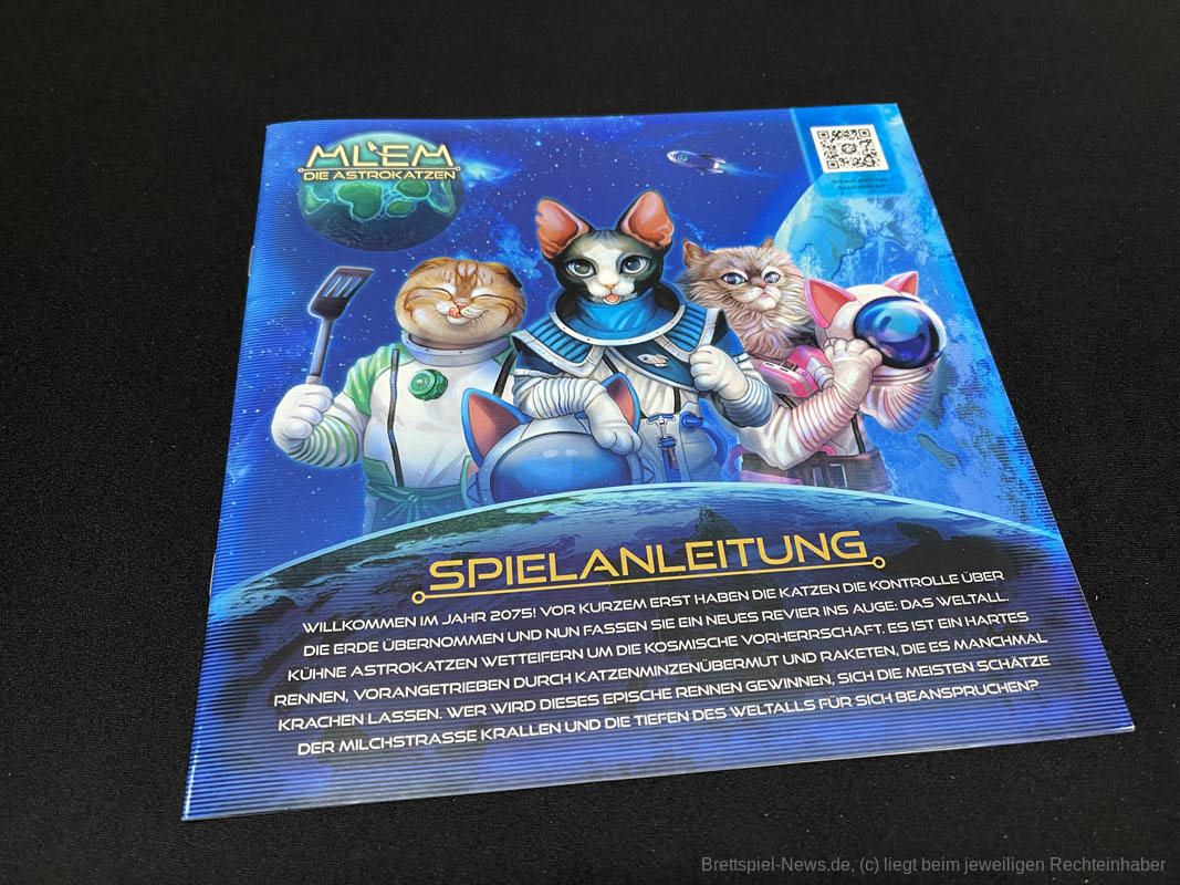 Das Regelwerk umfasst 16 Seiten. Es ist locker gestaltet, mit großer Schrift und vielen Beispielen, die die Regeln sehr gut erklären. Die Anleitung schließt auf der letzten Seite mit einer Symbolübersicht ab, sodass die Spezialfähigkeiten der Astronautenkatzen schnell nachgeschaut werden können. Abgesehen von den Regeln sind alle Spielkomponenten sprachneutral.