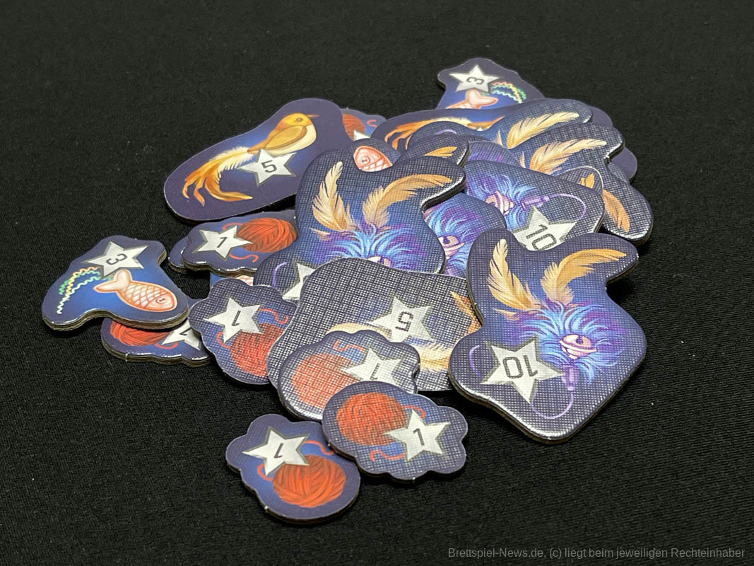 Den gewählten Illustrationsstil finde ich absolut passend zum Thema und die Symbolsprache ist schnell verinnerlicht. Schön finde ich auch, dass auf den Punktemarkern nicht nur Zahlen stehen, sondern auch Katzenspielzeug abgebildet ist. Eigentlich ist die gesamte Grafik herrlich “katzifiziert“.