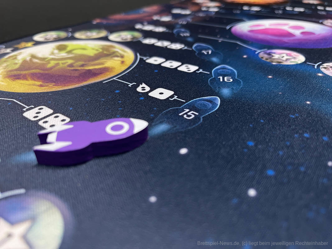 Die gesamte Qualität des Spielmaterials ist für den Preis von ca. 35 Euro top. Die Spielschachtel ist stabil, auf das Nötigste reduziert und mit einem Inlay versehen. Die Spielmatte ist wunderschön bedruckt, geruchsneutral und hat einen genähten Rand für eine lange Lebensdauer. Alle Marker haben eine vernünftige Kartonstärke und die Rakete und das Ufo sind sogar aus Holz.