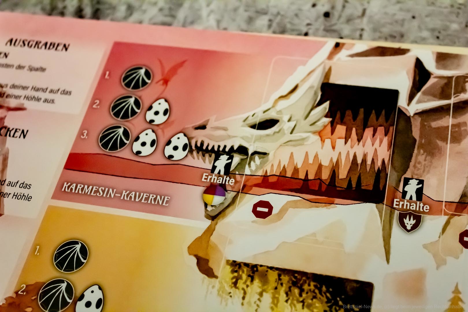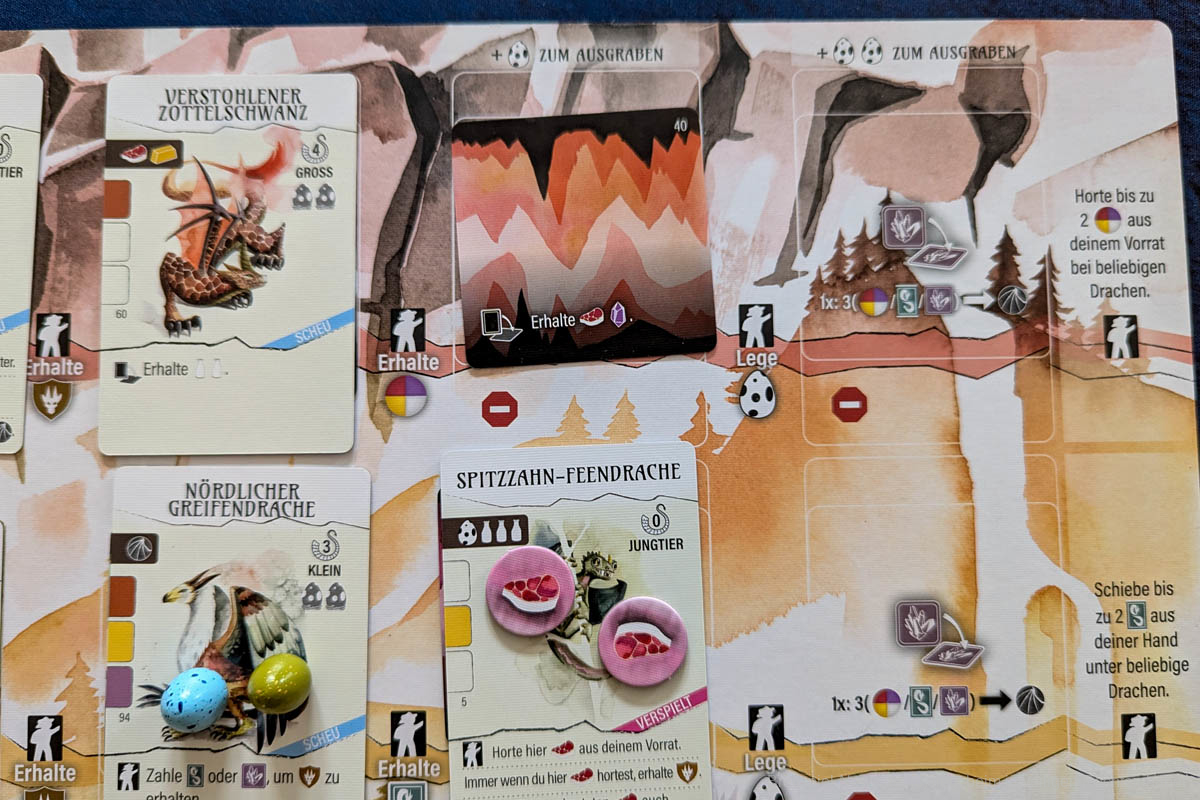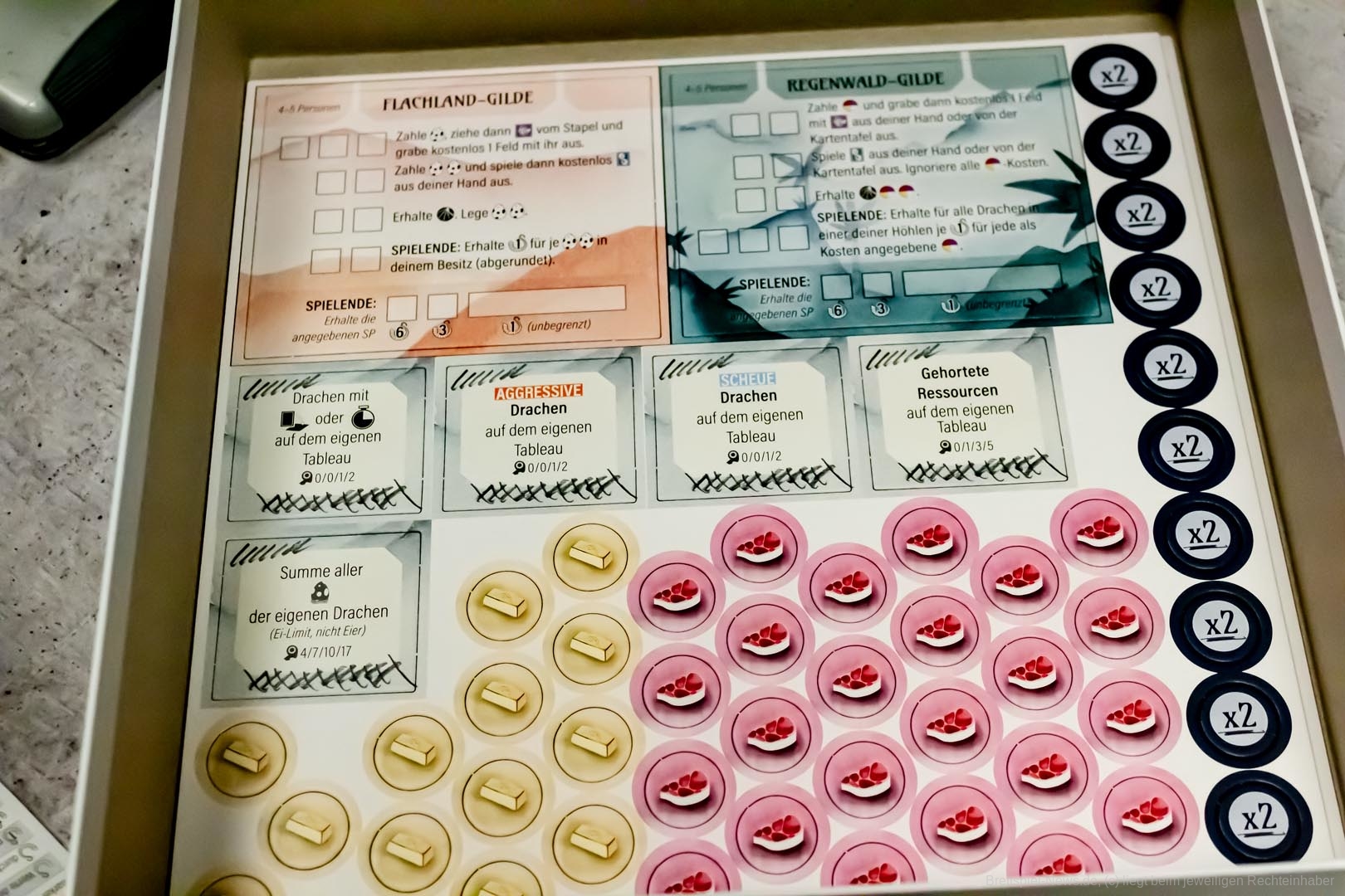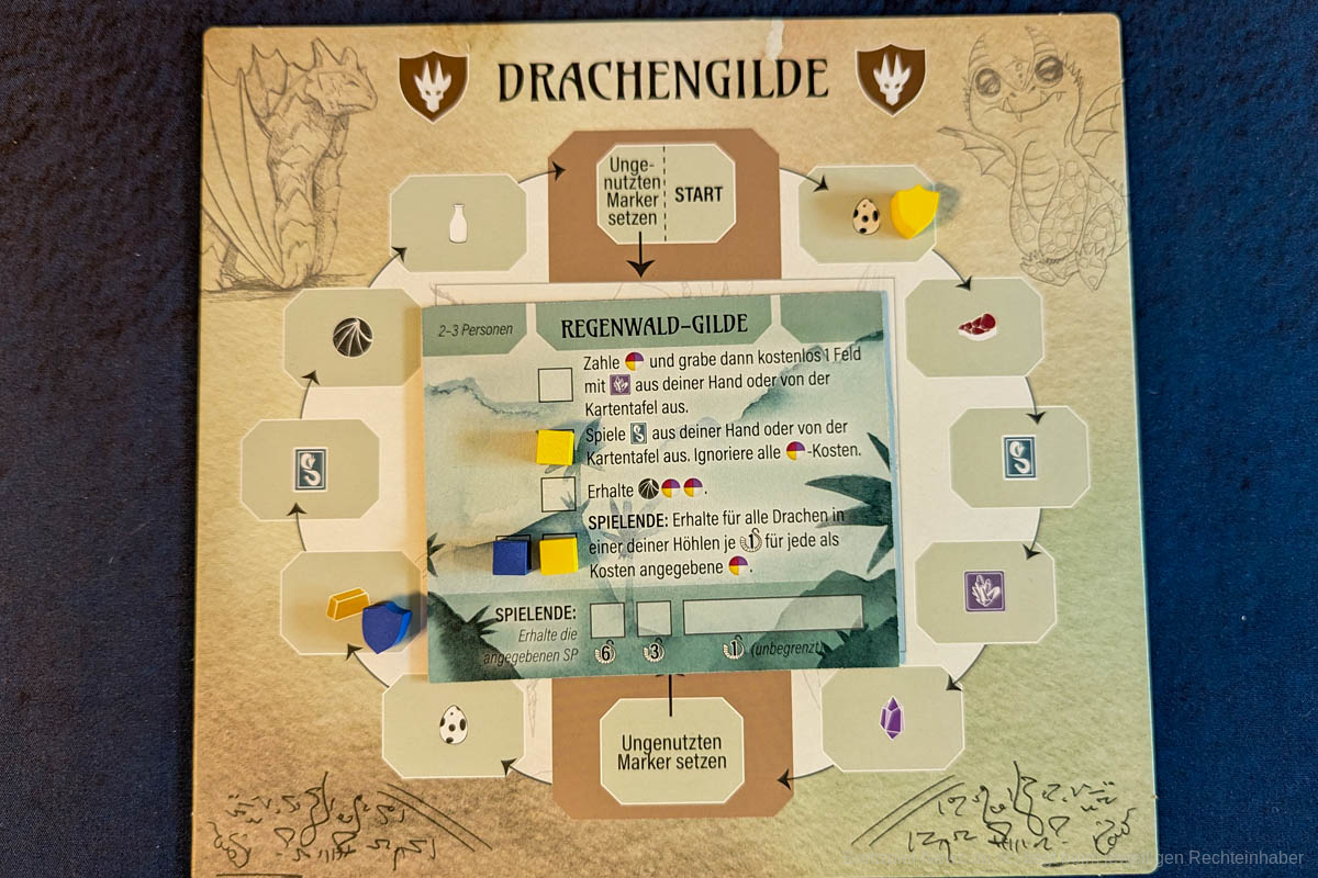 Neu sind hier die Jungtiere. Je öfter diese aktiviert werden, desto mehr Boni gewähren sie. Beispielsweise gewährt der Stumm-Wyrmling, jedes mal wenn er aktiviert wird, das eine Fleisch-Ressource aus dem eigenen Vorrat, auf ihm gelagert werden kann. Immer wenn dies getan wird, gibt es eine frei wählbare Ressource. Wenn die dritte Fleisch-Ressource gelagert wird, dann dürfen zusätzlich noch zwei Schritte auf dem Drachengilden-Board vorangeschritten werden. Das Drachengilde-Board ist ein zusätzliche Board auf dem sich mit den Gildensteinen bewegt wird. Darf der eigene Gildenstein durch eine Aktion bewegt werden, gibt es meist einen Boni in Form von Ressourcen, Karten, Eiern oder einer Aktionsmünze. Zudem gibt es die Möglichkeit Felder auf dem Drachengilden-Board mit eigenen Aktionssteinen zu besetzen. Die Anzahl hier ist begrenzt. Die Drachengilden gewähren sofortige Vorteile oder weitere Spielende Belohnungen. Hier kann aus vier verschiedenen Gilden gewählt werden die unterschiedliche Vorteile bringen.