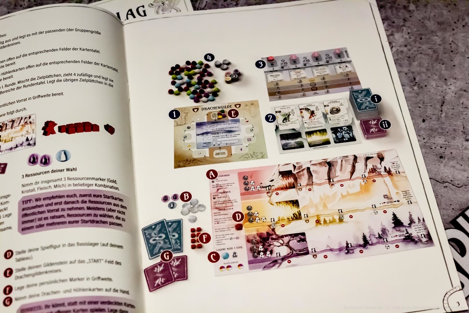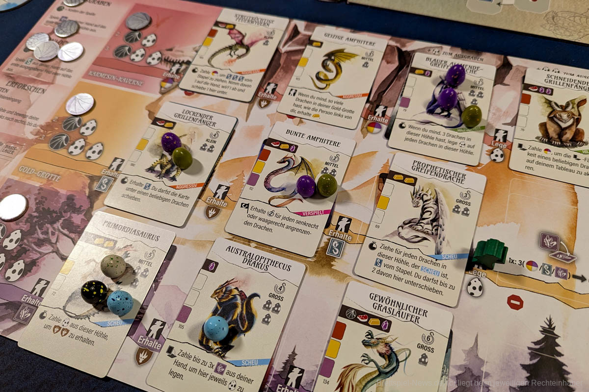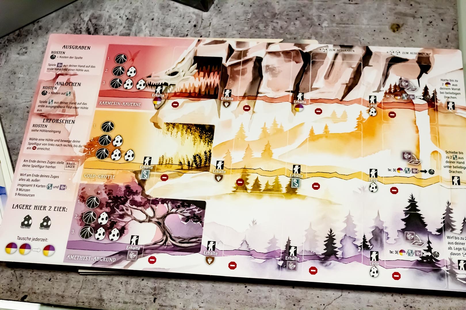 Neu sind hier die Jungtiere. Je öfter diese aktiviert werden, desto mehr Boni gewähren sie. Beispielsweise gewährt der Stumm-Wyrmling, jedes mal wenn er aktiviert wird, das eine Fleisch-Ressource aus dem eigenen Vorrat, auf ihm gelagert werden kann. Immer wenn dies getan wird, gibt es eine frei wählbare Ressource. Wenn die dritte Fleisch-Ressource gelagert wird, dann dürfen zusätzlich noch zwei Schritte auf dem Drachengilden-Board vorangeschritten werden. Das Drachengilde-Board ist ein zusätzliche Board auf dem sich mit den Gildensteinen bewegt wird. Darf der eigene Gildenstein durch eine Aktion bewegt werden, gibt es meist einen Boni in Form von Ressourcen, Karten, Eiern oder einer Aktionsmünze. Zudem gibt es die Möglichkeit Felder auf dem Drachengilden-Board mit eigenen Aktionssteinen zu besetzen. Die Anzahl hier ist begrenzt. Die Drachengilden gewähren sofortige Vorteile oder weitere Spielende Belohnungen. Hier kann aus vier verschiedenen Gilden gewählt werden die unterschiedliche Vorteile bringen.