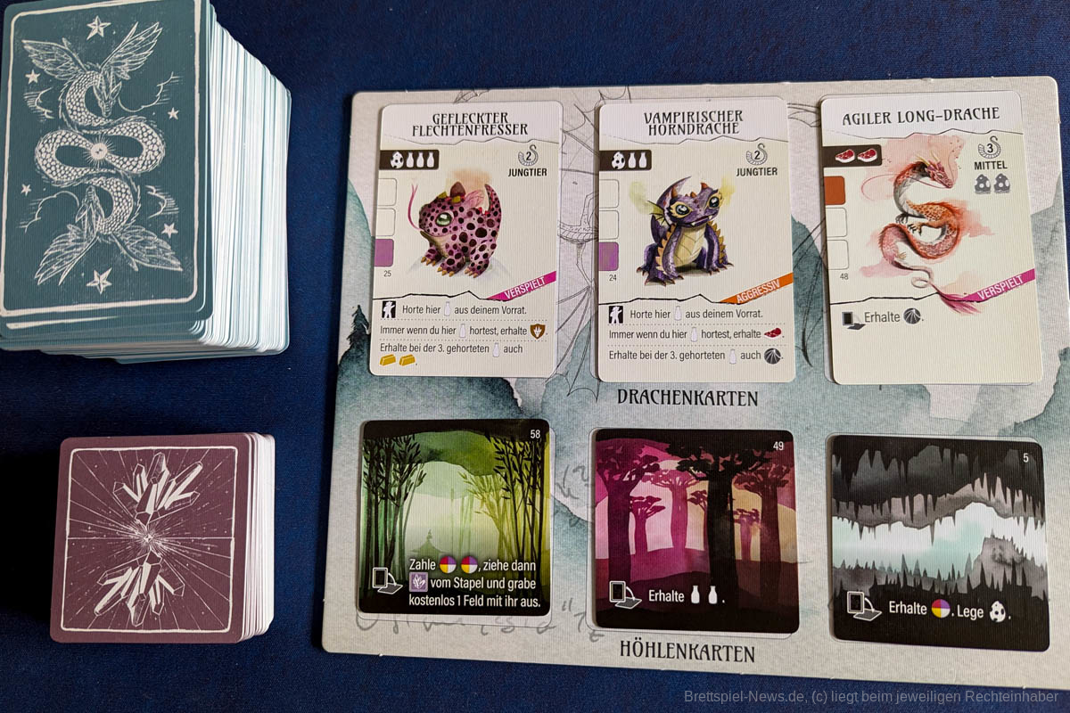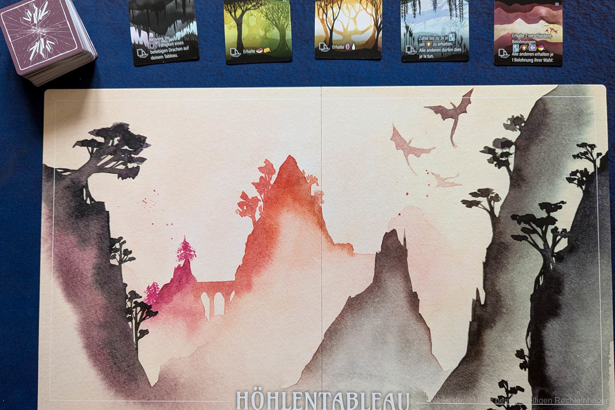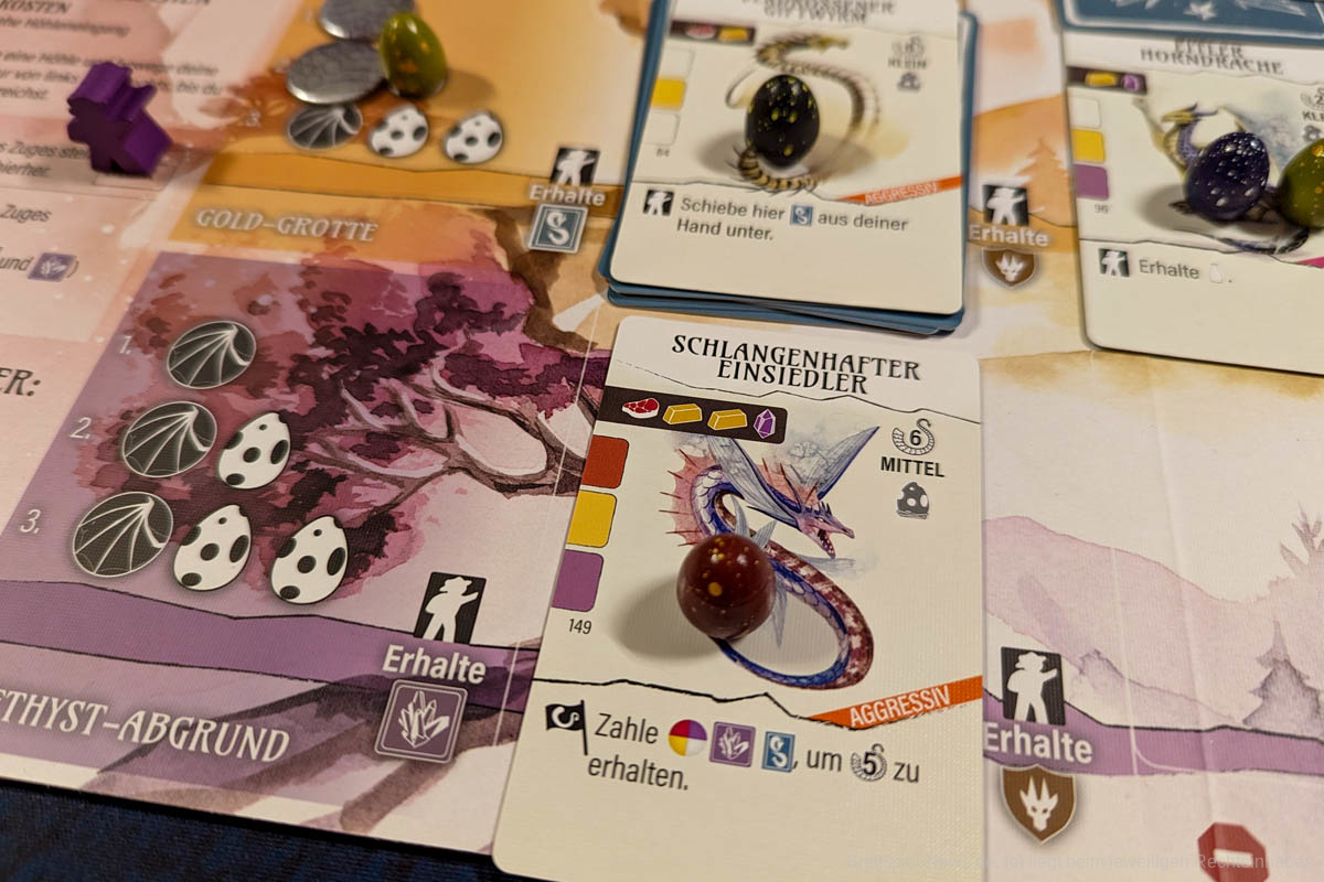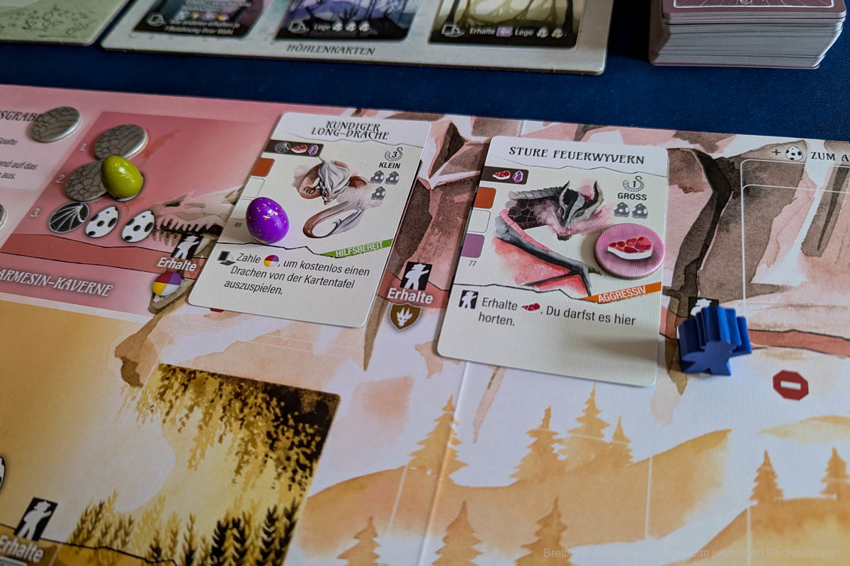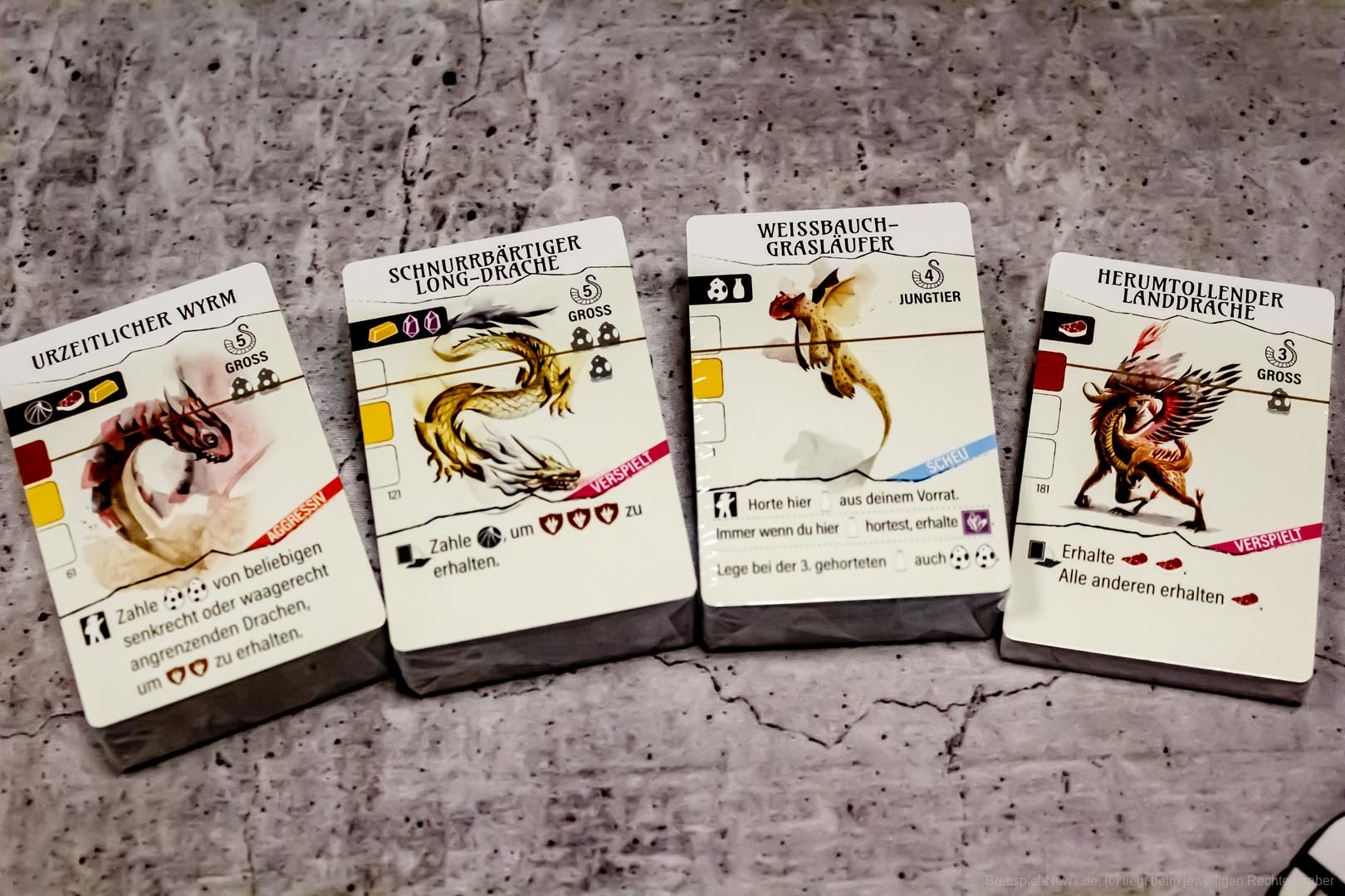 Die Drachen haben verschiedene Drachenfähigkeiten und Eigenschaften, welche auf jeder Drachenkarte vermerkt sind. Es gibt Effekte, die beim Ausspielen aktiviert werden, beim Erforschen der Höhle, am Rundenende oder am Spielende. Beispielsweise gewährt mir die hochmütige Wyvern am Spielende für jeden anderen Drachen in ihrer Höhle, der die Eigenschaft scheu hat, zwei weitere Siegpunkte. Außerdem ist angegeben, in welcher der drei Höhlenarten sie sich wohl fühlen und somit auch nur dort ausgespielt werden können.