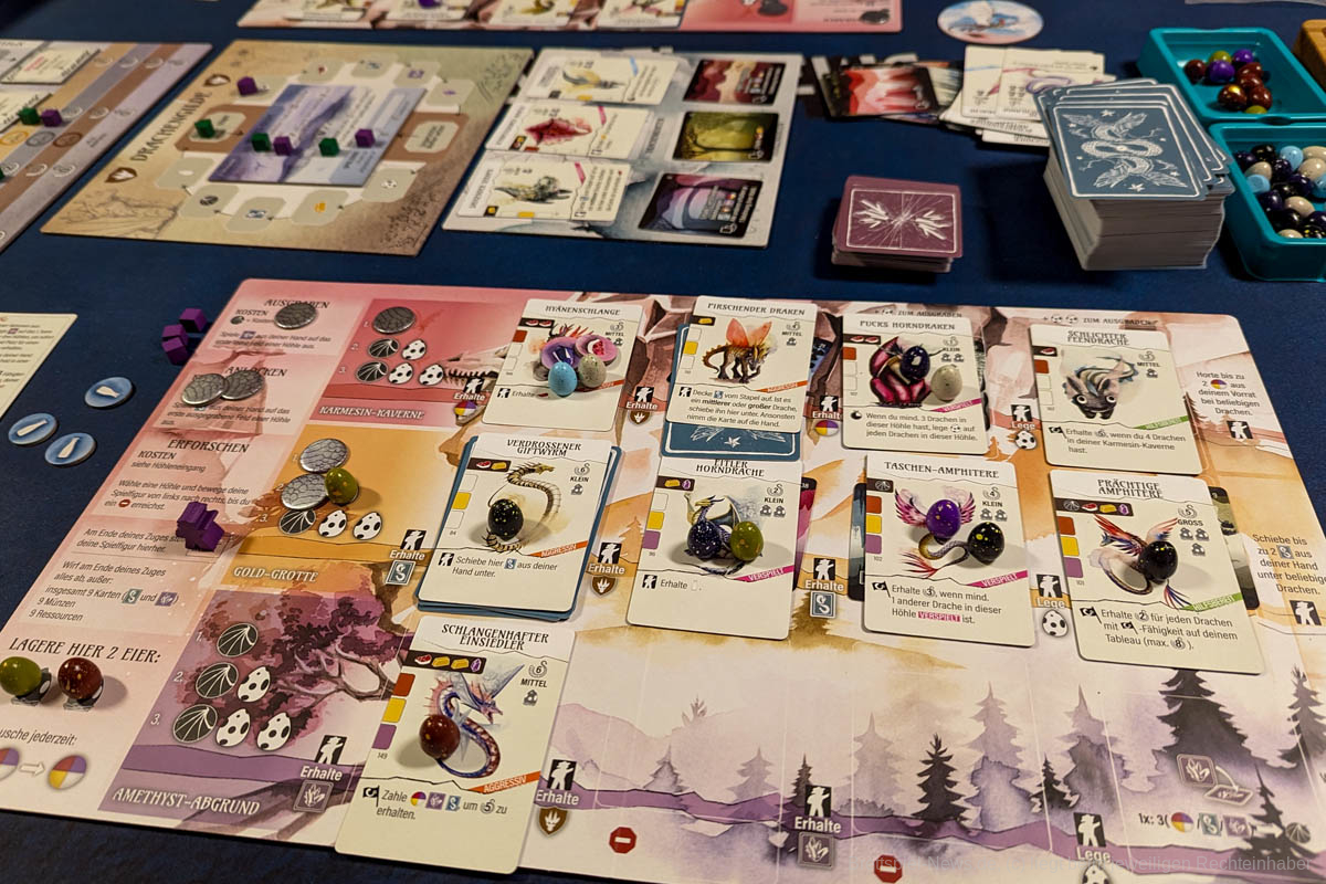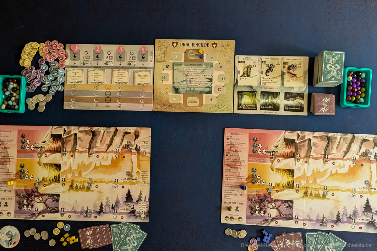 Durch das Drachengilde-Board werden Aktionsketten unterstützt, was bei besonders gelungenen Zügen sehr belohnend wirkt. Außerdem bringt es etwas mehr Konkurrenz und Interaktion ins Spiel. Die Plätze sind begehrt, da sie starke Spielvorteile oder Endwertungsboni bringen. Dennoch bleibt die Interaktion eher auf niedrigem Niveau, da das Meiste sich auf den Player-Boards abspielt und diese auf der anderen Seite des Tischs kaum einsehbar sind.