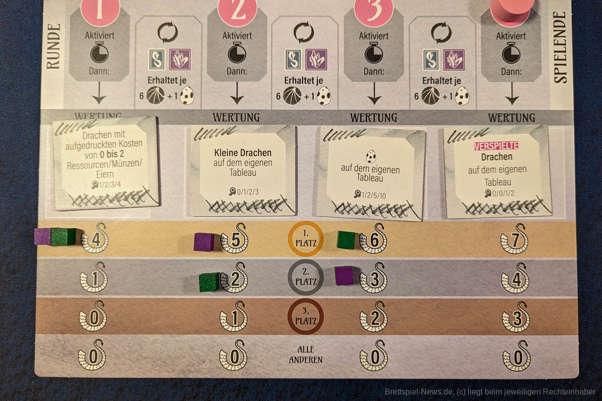 Haben alle gepasst, wird das Rundenende gewertet. Zuerst werden Drachen mit Rundenende-Symbol aktiviert. Dann wird geprüft, wer das aktuelle Rundenziel erreicht hat, beispielsweise wer wie viele scheue Drachen auf dem eigenen Tableau hat, wofür es absteigend Siegpunkte gibt.