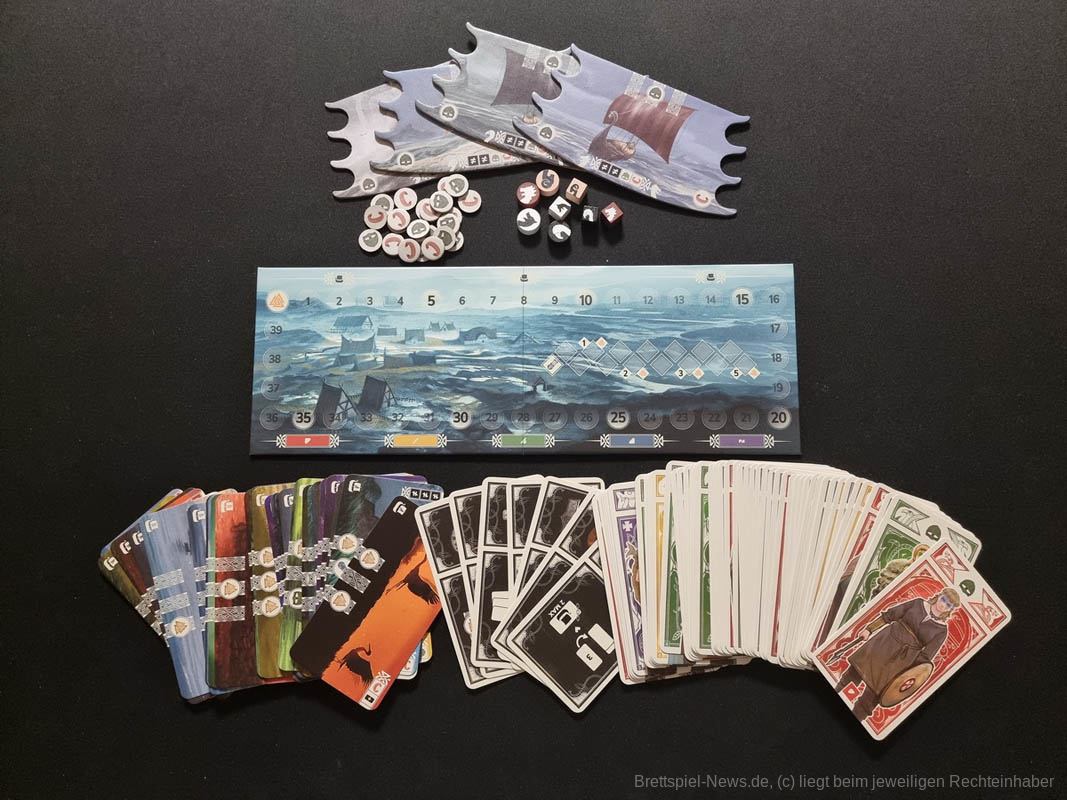 Das Spielmaterial ist von durchweg guter Qualität, weist jedoch einige Schwächen im Design auf. Die mitgelieferten Deckboxen zum Beispiel sind schick, aber viel zu eng, sodass sich die Karten nur unter hohem Kraftaufwand entnehmen und nur mit größter Vorsicht wieder unbeschädigt zurückpacken lassen. Weiterhin sind die verschiedenen Spielerfarben zwar passend, aber recht eintönig gewählt und lassen sich gerade von Erstspielern nicht instinktiv den Playerboards zuordnen. Die zur besseren Unterscheidbarkeit aufgedruckten Symbole wurden ebenfalls so gut in das Artwork integiert, dass man sie leicht übersehen kann. Das größte Problem jedoch stellt die auf dem Hauptspielplan aufgedruckte Ansehensleiste dar, die trotz des verfügbaren Platzes sehr minimalistisch ausgelegt wurde und deshalb während des Spiels regelmäßig zu Fragen bezüglich der Positionen der einzelnen Markierungssteine führt. Dieser Punkt soll jedoch in der zweiten Auflage durch eine angepasste Ansehensleiste verbessert werden.