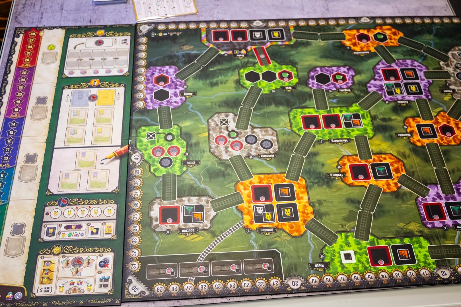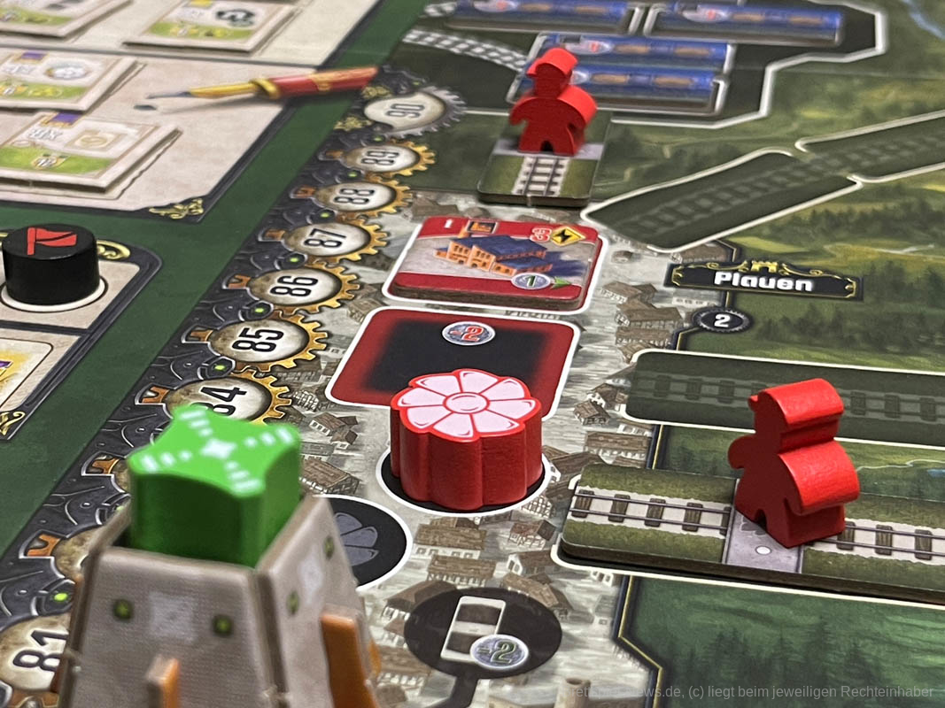 Sehr gut hat mir der Aktions-Mechanismus-Kniff gefallen. Er macht die Aktionsplättchen als Aktion auf dem eigenen Tableau und als Schiene auf dem Spielbrett nutzbar. Das Timing - also wann und wie eine Aktion gemacht wird - ist sehr wichtig und fordert viel Planung. Zum Beispiel kann eine Gleisbau-Aktion die Möglichkeit bieten, sowohl Gleise zu verlegen als auch ein Netzwerk zu erweitern und beide Aktionen des Plättchens durchzuführen. Diese Kombination kann weitere Effekte auslösen, wie das Freischalten einer Technologie, die wiederum eine freie Aktion bringt.