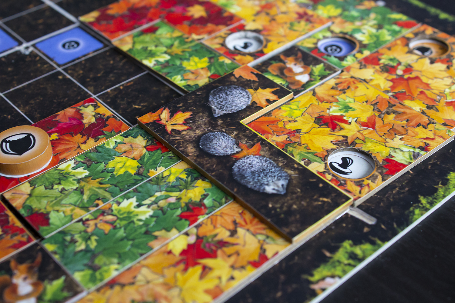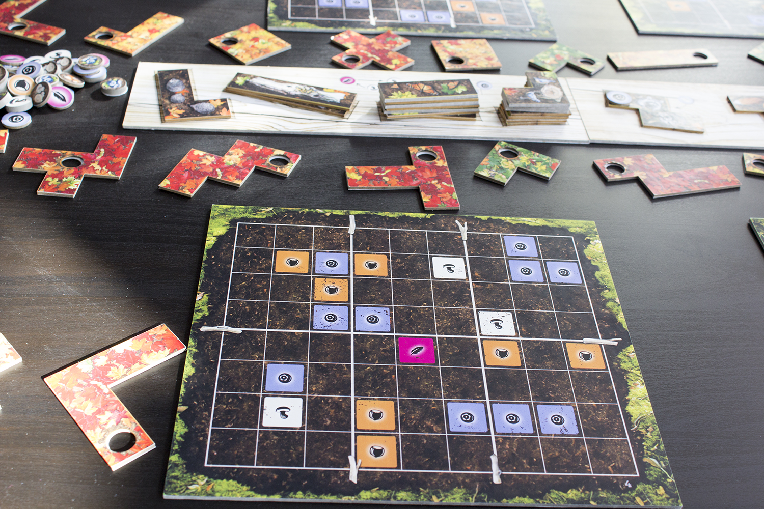 Jeder Spieler hat eine große Fläche vor sich ausliegen. Daneben befinden sich bis zu sechs zufällige Waldplättchen. Diese werden nach und nach auf das Spielfeld gepuzzelt. Jedes Bauteil hat runde Aussparungen. Diese sollten möglichst auf Ertragsfelder platziert werden, denn nur so kommen die Spieler an neue Bonusaktionen oder hochwertige Aktionen. Wird ein Teil geschickt gepuzzelt und bringt Ertrag, werden kleine runde Marker darauf gelegt. Das Spielfeld ist in Quadranten unterteilt. Wird ein Quadrant komplett bebaut, darf sich der Bonus genommen werden. Wer es schafft die runden Aussparungen aneinanderhängend zu platzieren darf aus der mittigen Auslage ein passendes Tier wählen und damit für “abgeernteten” Rohstoffe ein zweites mal den Ertrag einfahren.