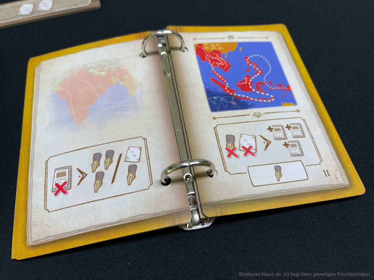 Das Kennerspiel "Bücher der Zeit" ist ein Spiel mit hoher Tischpräsenz, denn jeder baut aus Pappseiten und einem Ringbinder echte Bücher. Die Chronik des Spiels wird auf ein Papppult gestellt und rundet zusammen mit dem Zivilisationstableau die tolle Optik ab. Optisch, zumindest haptisch, kann "Bücher der Zeit" punkten. Beim Artwork schwächelt das Spiel allerdings. Ich hätte mir ansprechende Illustrationen auf den Buchseiten mit Flavourtexten gewünscht. Ich verstehe, dass solche Maßnahmen aus Gründen der Sprachneutralität gerne vermieden werden. Aber genau hier trennt sich die Spreu vom Weizen. Die Symbolsprache ist relativ leicht zu verstehen. Menschen mit einer Farbschwäche werden sich mit den ähnlichen Grün- und Rottönen schwertun. Andere Verlage haben bereits gezeigt, wie mit kleinen Symbolen oder Mustern solche Probleme überwunden werden können.