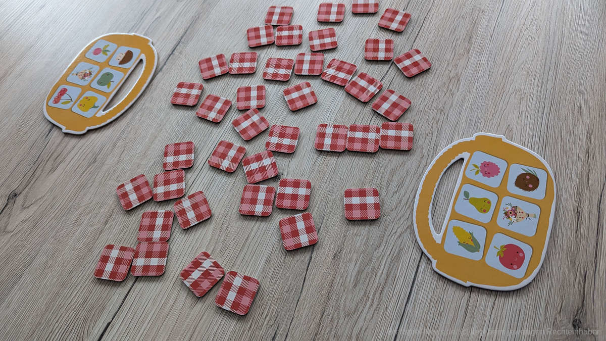 Aus 40 verdeckten Plättchen wird eines umgedreht und betrachtet. Passt es zu einem eigenen Symbol, darf es in das Körbchen gelegt werden. Ansonsten wird es wieder verdeckt und bleibt für eine Runde „gesperrt“ (erst in der nächsten Runde darf es erneut von einem Kind aufgedeckt werden).