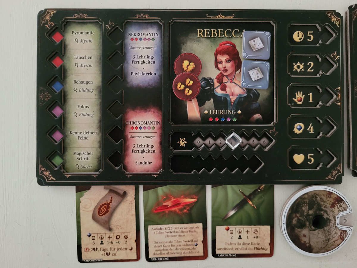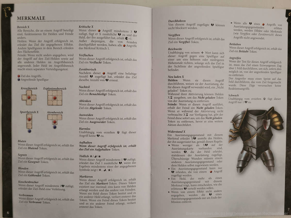 Leider müsst ihr jetzt ständig, wenn sich die Anweisungen auf die Karten beziehen, im Heft blättern, um die Eigenschaften der Feinde nachzuschlagen. Nachdem ihr also einige Rechtschreibfehler gekonnt weggeschmunzelt habt, fällt euch auf, dass ihr doch bereits viele Spezialbegriffe im richtigen Regelwerk nachschlagen müsst. Diese zu finden ist bedauerlicherweise alles andere als einfach, da sie häufig nicht an den entsprechenden Stellen beschrieben sind. Glücklicherweise kann ein Heft zur Spielhilfe zurate gezogen werden. „Habt ich etwas an den Augen oder sind alle Begriffe einfach übersetzt und anschließend nicht alphabetisch geordnet worden?“, denkt ihr euch verärgert. Es ist schon einiges an Zeit vergangen, da stolpert ihr über eine Abbildung, in der das Horologium anders abgebildet ist als auf eurem Tisch. Ihr schlagt wieder nach, könnt allerdings keine Erklärung finden. Ihr fahrt dementsprechend auf die Messe nach Essen, um von den Entwicklern persönlich zu erfahren, dass es sich hierbei um einen Fehler in der Abbildung handelt.