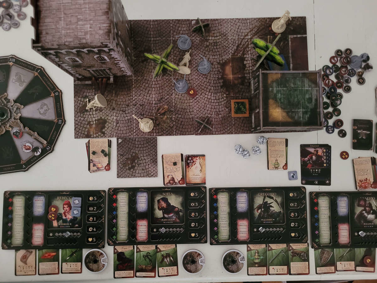 Das alles ist sehr bedauerlich, da „Nova Aetas: Renaissance“ keineswegs ein schlechtes Spiel ist. Im Gegenteil, wenn wir die Regeln erstmal durchblickt haben, konnte ich viel Spaß damit haben. Das Thema ist absolut unverbraucht und spannend. Die Spielkomponenten sind hochwertig produziert und die Tischpräsenz ist beeindruckend. Die 3D-Elemente des Spiels verleihen „Nova Aetas: Renaissance“ unheimlich viel Immersionspotential. Das Horologium ist ein spannendes System zur Ermittlung der Initiative. Das Artwork ist hervorragend. Der Spielablauf wird nach und nach flüssiger. Zusätzlich sind Karten vorhanden, die eine Szene zeigen und genutzt werden können von Charakteren, um diese während einer laufenden Mission zu erkunden. Außerdem erhöhen abzweigende Handlungsstränge und Nebenmissionen den Wiederspielreiz.
