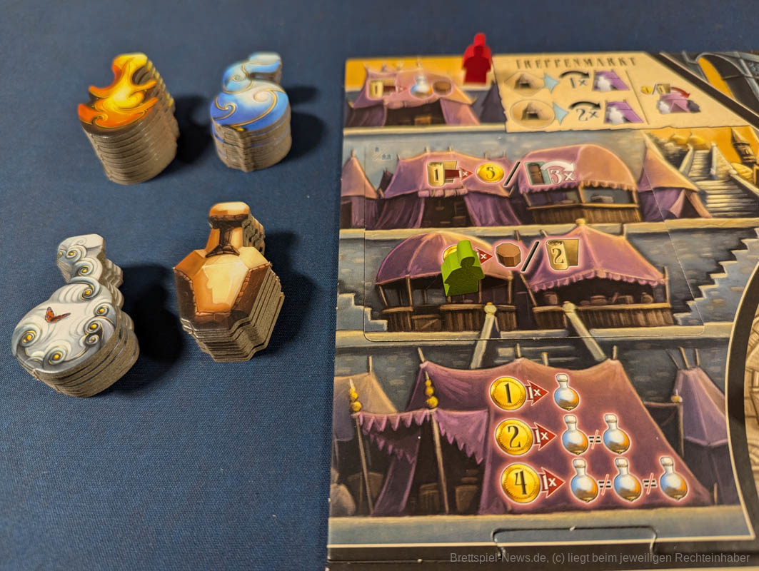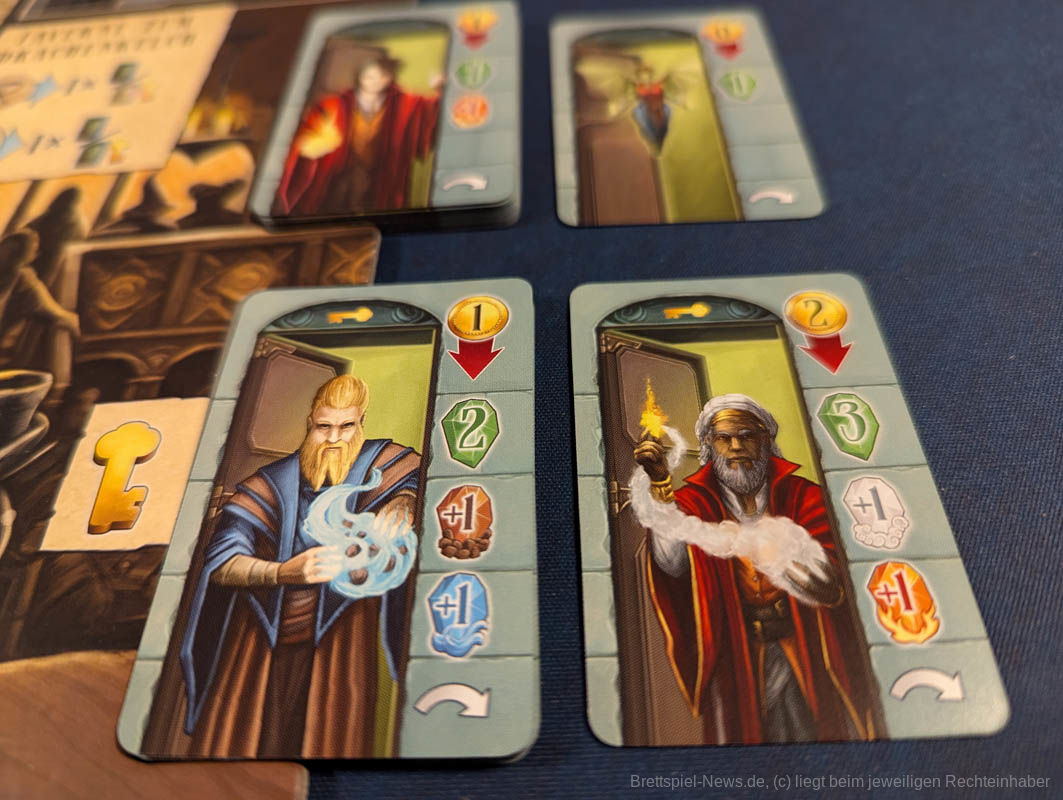 Magiestärke ist entsprechend eine der wesentlichen Ressourcen, die im Spiel verwaltet werden müssen. Sie wird auf einer Leiste auf dem Player Board getrackt, wobei es einen Höchst- und einen Mindestwert gibt. Beides kann im Laufe des Spiels erhöht werden. Für Geld angeheuerte Magier bieten im Kampf Ihre Dienste mit zusätzlicher Magiestärke an.