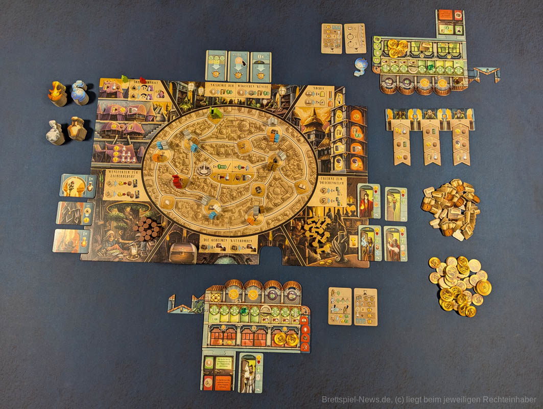 Beim Spielaufbau machen bereits die aus verschiedenen Einzel-Elementen zusammengesetzten Player Tableaus, die sich im Laufe des Spiels auch ein wenig verändern, neugierig. Das hat uns bereits bei „Tavernen im Tiefen Thal“ gefallen und wertet auch hier die Spielerfahrung auf.