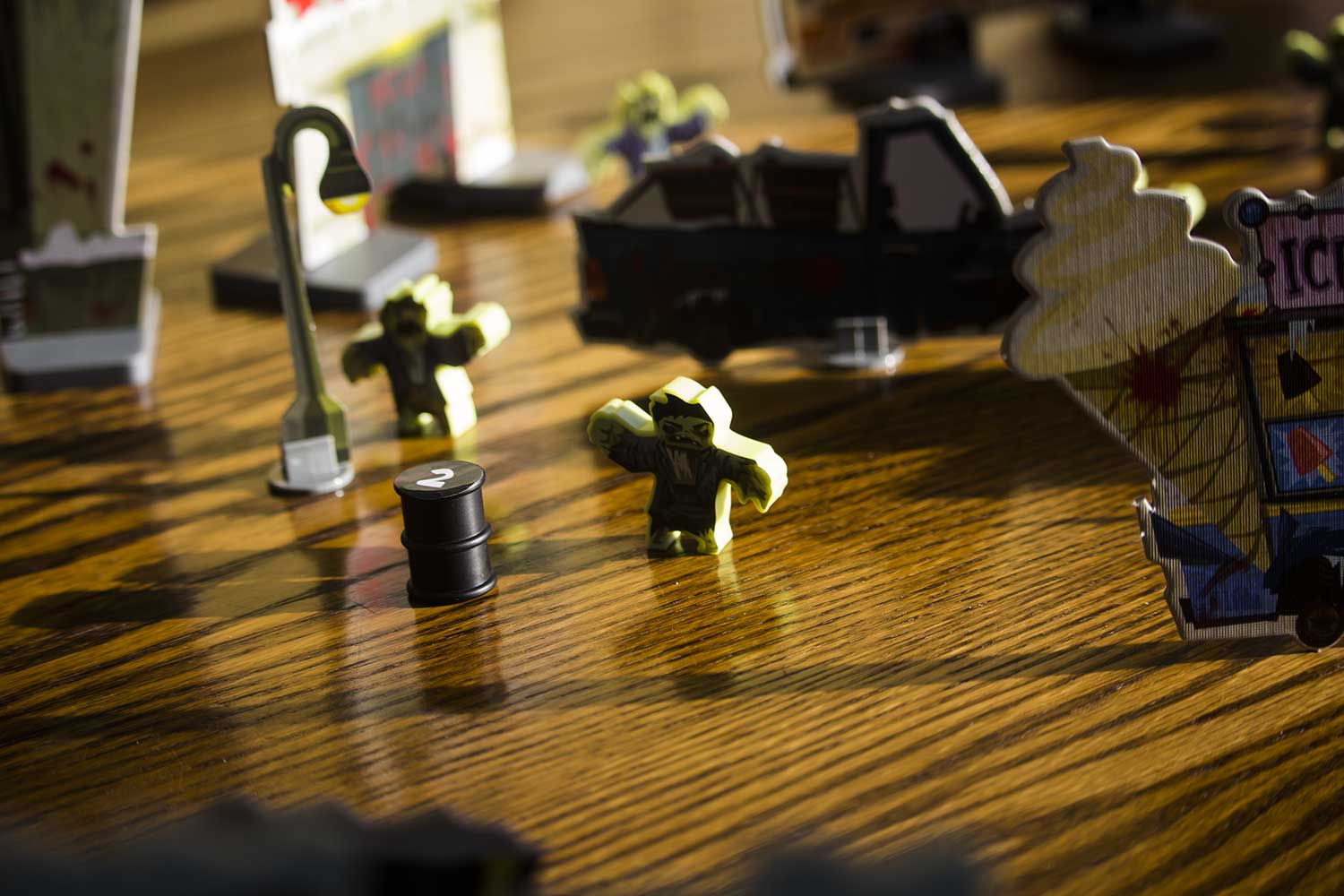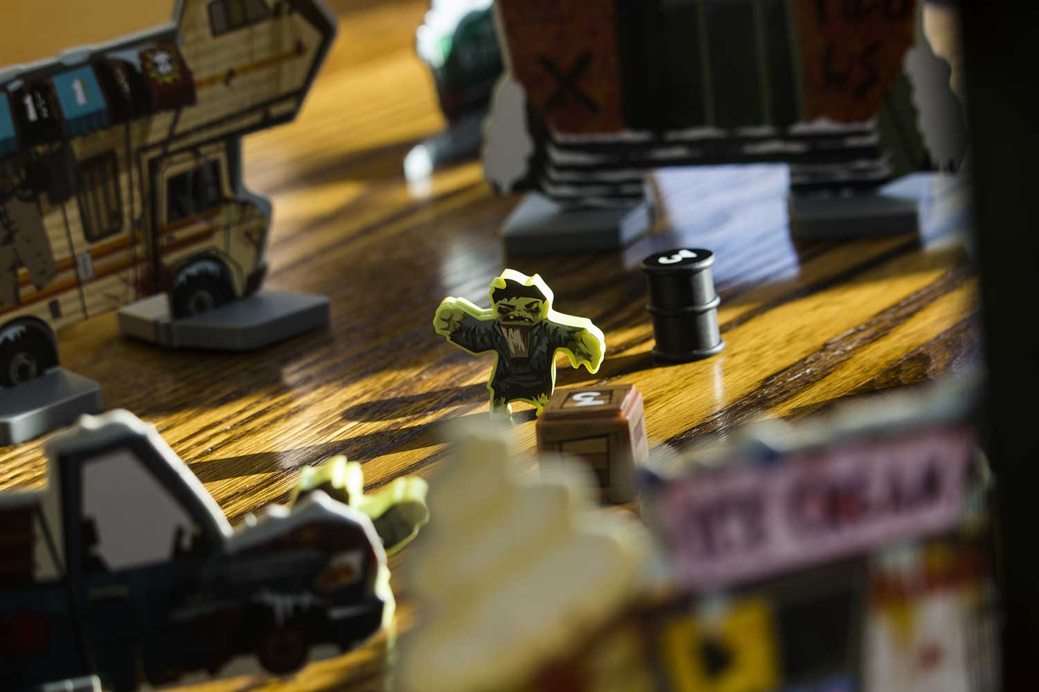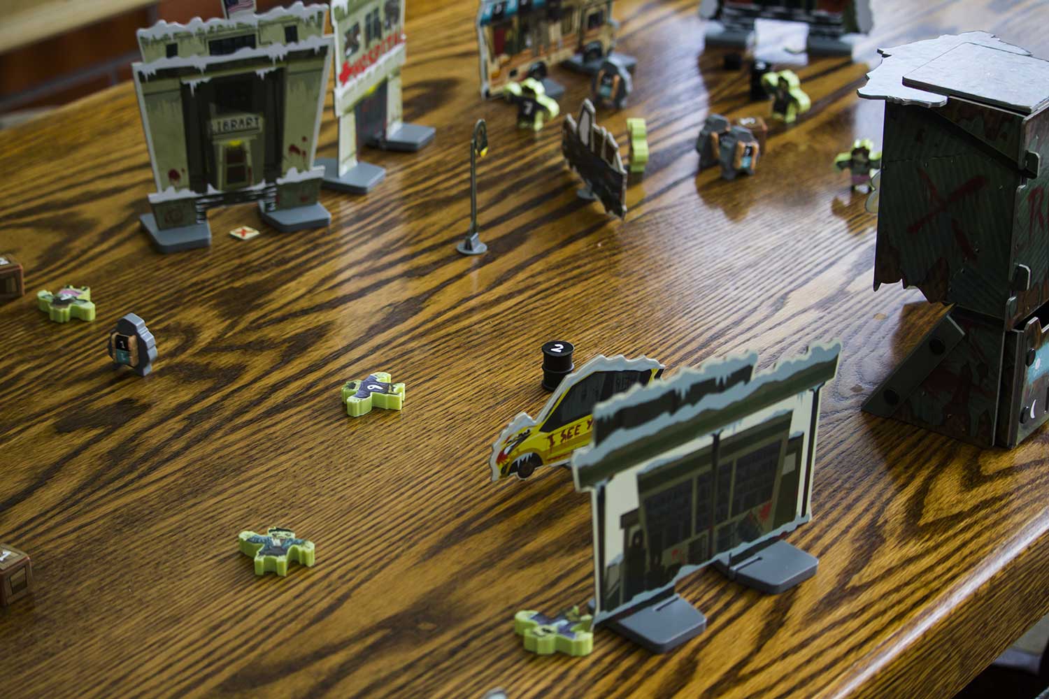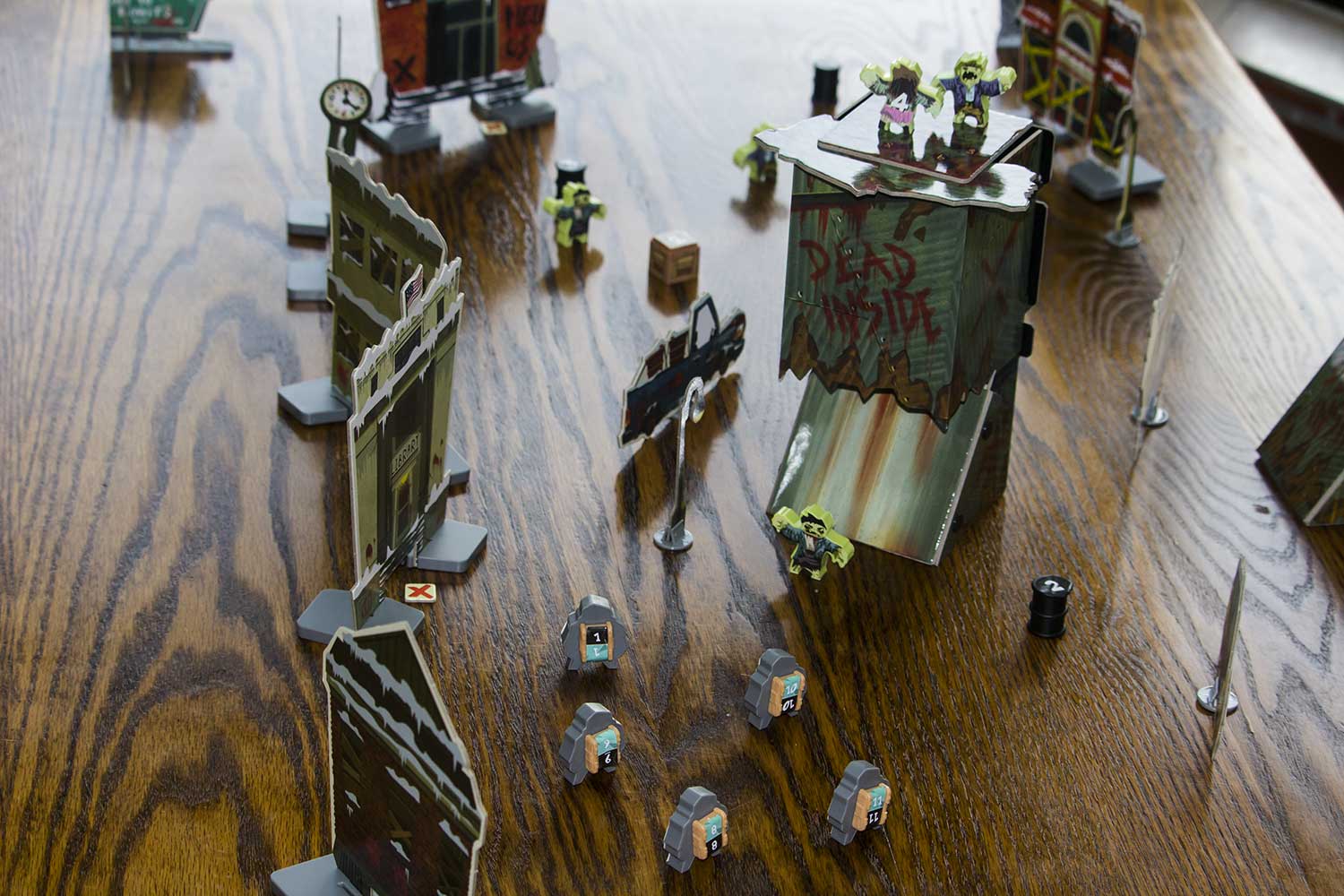 Jedes Szenario hat einen eigenen Aufbauplan. Die Gebäude, Zombies, der Zombieturm die Fahrzeuge und auch die Helden werden entsprechend aufgestellt. Für das Spiel benötigt man einen großen Tisch, der im Idealfall komplett zu umrunden ist. Es dauert sicherlich 5-10 Minuten, bis alles an seinem Platz ist. Das Spiel kann beginnen.