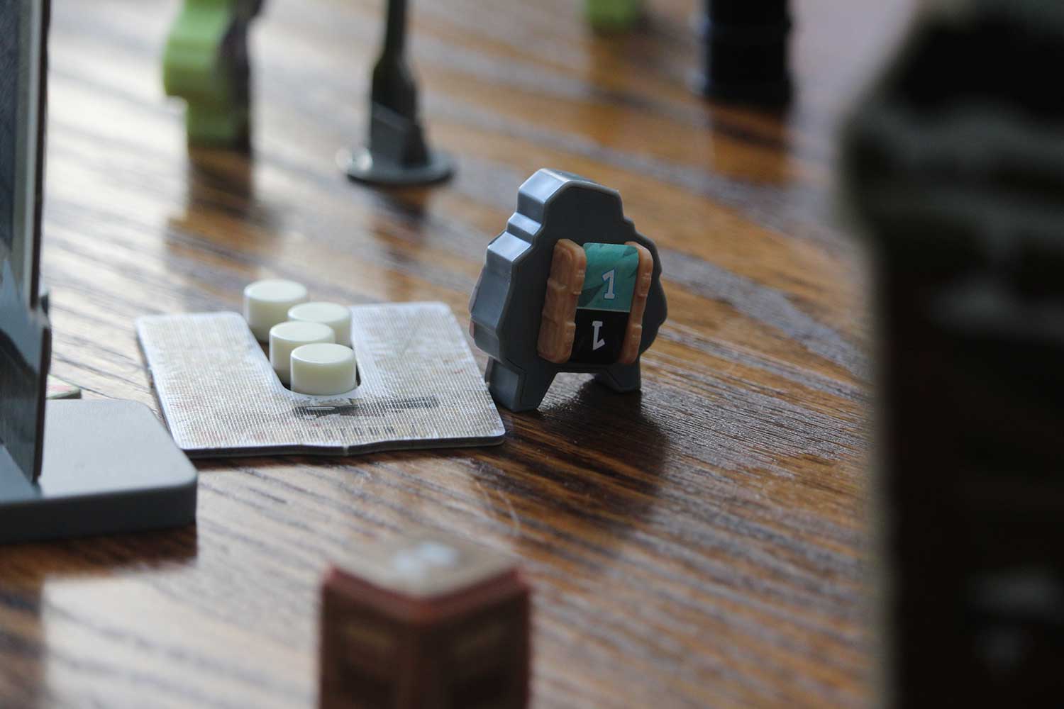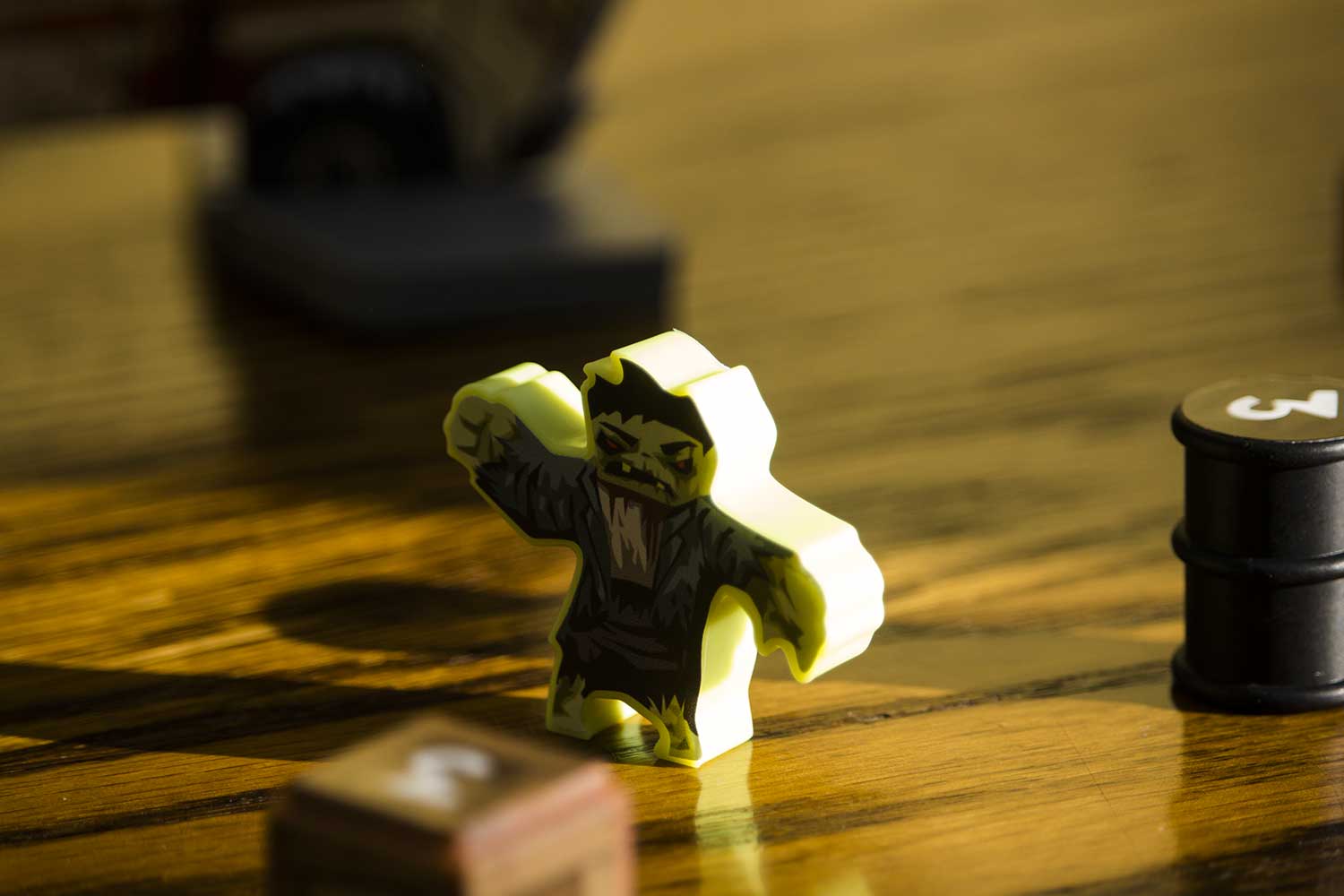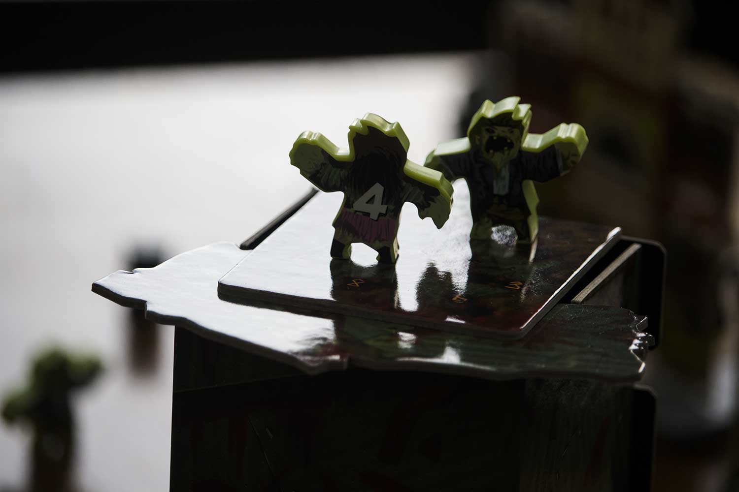 Das “Verhalten” der Zombies wird durch die “Rutsche” hervorragend umgesetzt und es ist immer wieder lustig zu sehen, wie die grünen Biester auf das Spielfeld purzeln. Es motiviert ungemein sehr gut zu zielen, damit der Turm erst gar nicht zum Einsatz kommt.