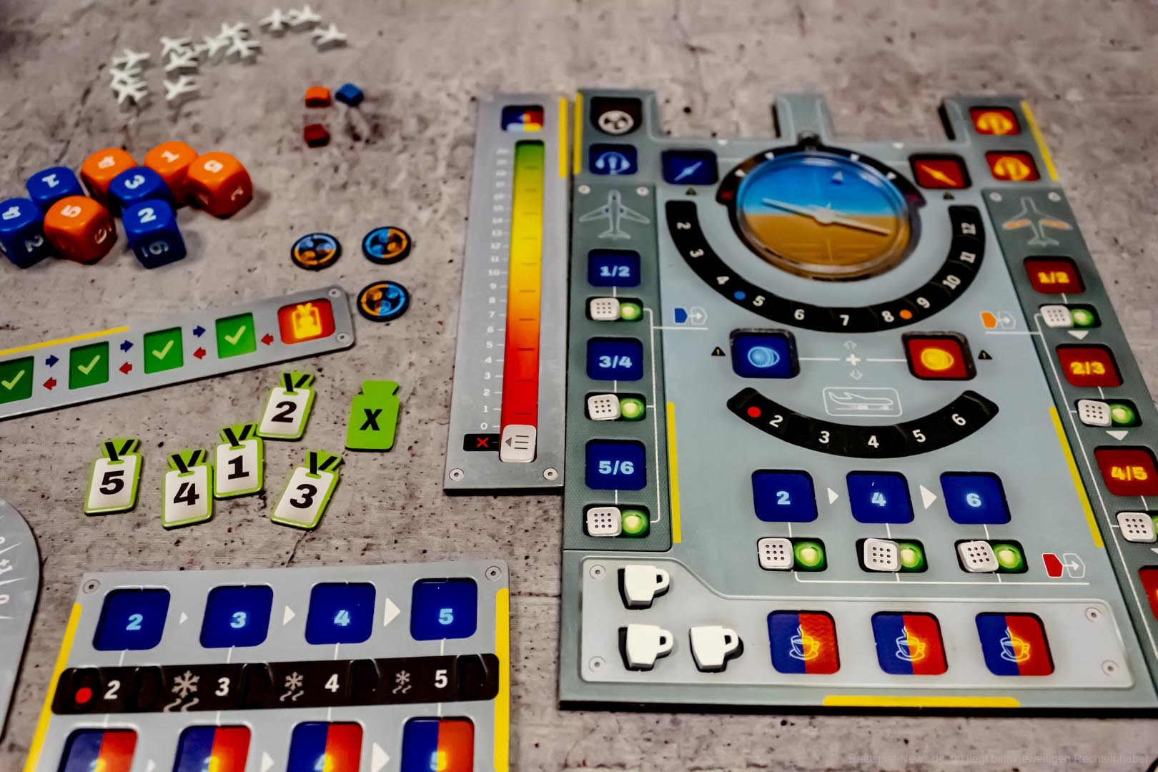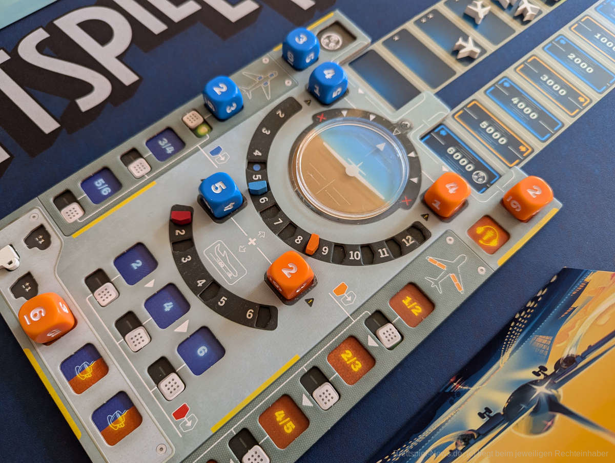 Brettspiele nach dem Prinzip „Würfel einsetzen, um Aktionen auszuführen“ gibt es viele, doch selten ist dies so wunderbar thematisch gelungen wie in „Sky Team“. Die Aktionen sind logisch nachvollziehbar und wir fühlen uns tatsächlich ein wenig wie in einem Cockpit, was auch wunderbar durch das gelungene Spielbrett unterstützt wird.