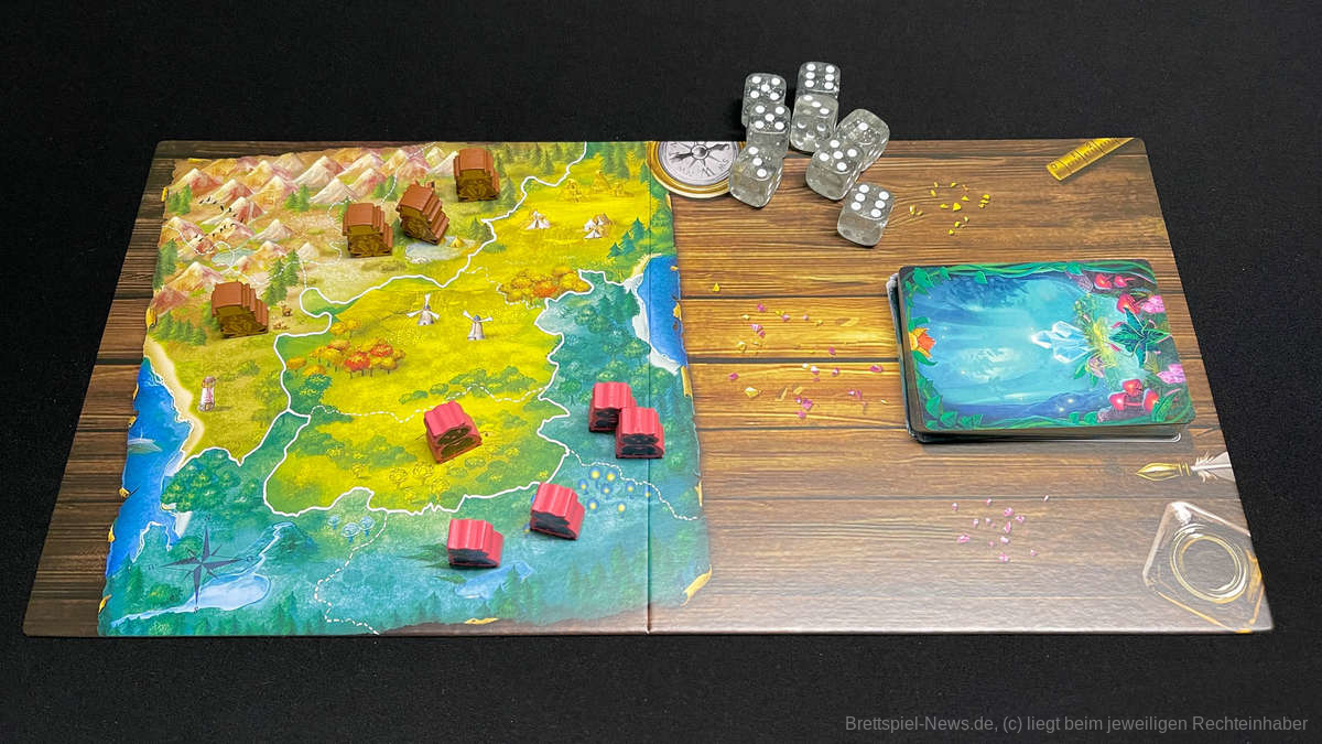 Was sofort auffällt, noch bevor wir Lost Lights öffnen, ist die besonders schöne Aufmachung des Spiels. Dieser Eindruck setzt sich auch deutlich fort, wenn wir den Karton öffnen und uns Anleitung, Karten, Spielbrett und Würfel anschauen. Das gesamte Material von Lost Lights lädt zum Träumen ein. Von einer magischen Welt, in der Tierwesen zaubern und kämpfen.