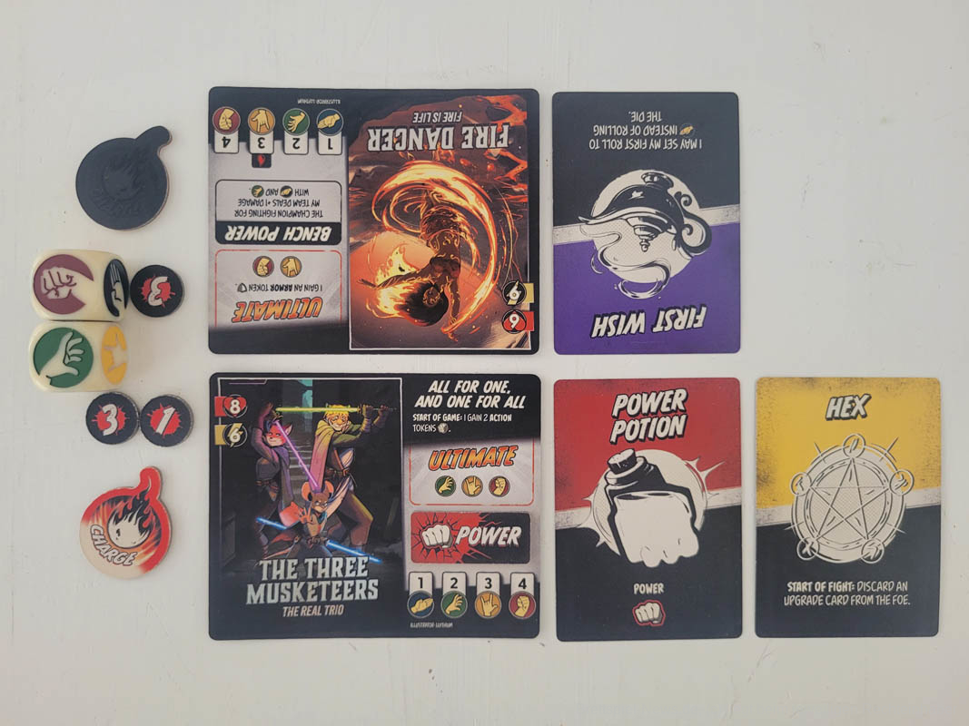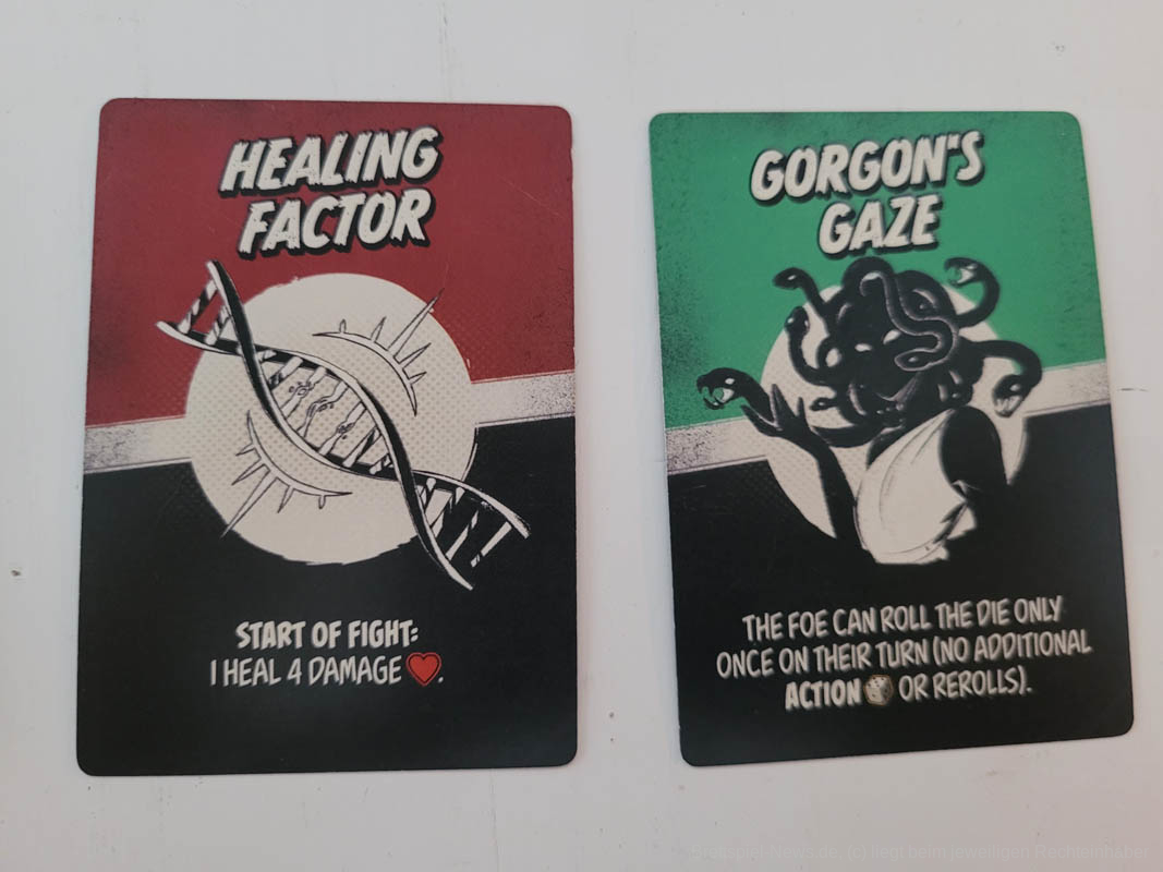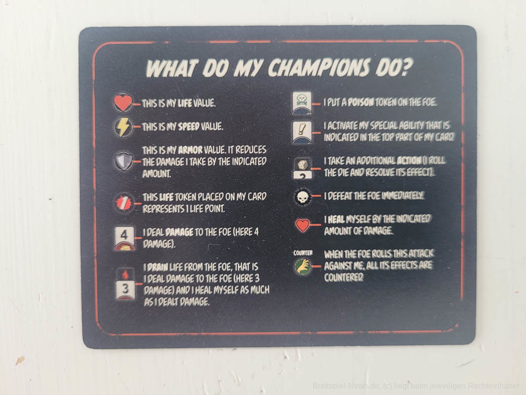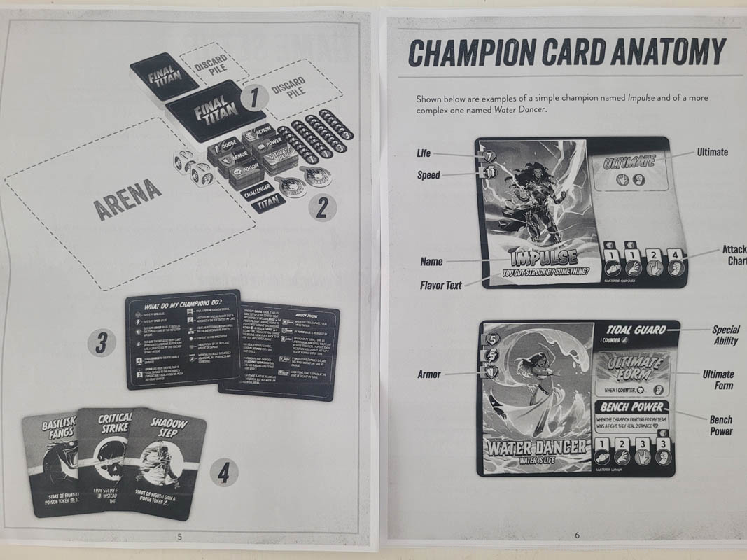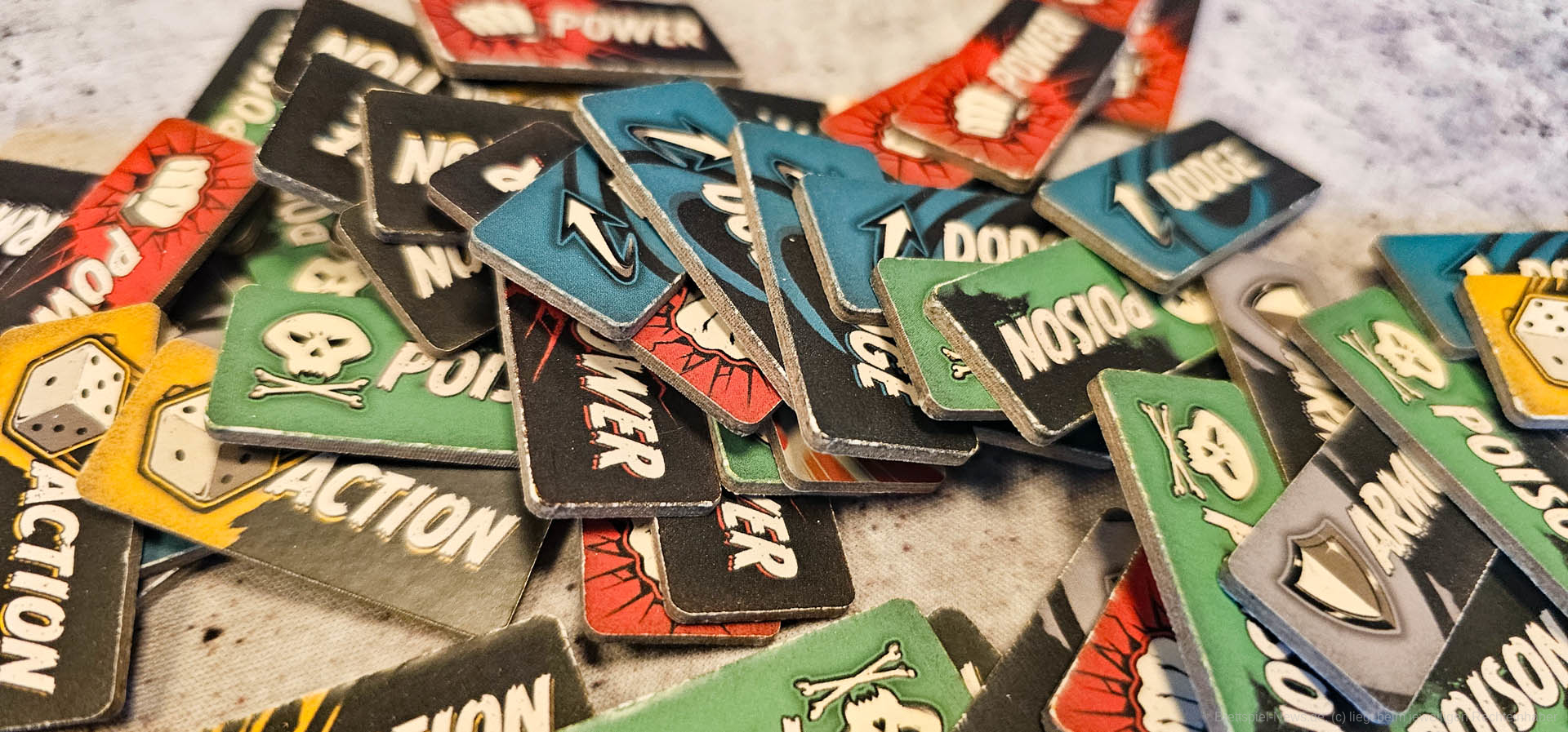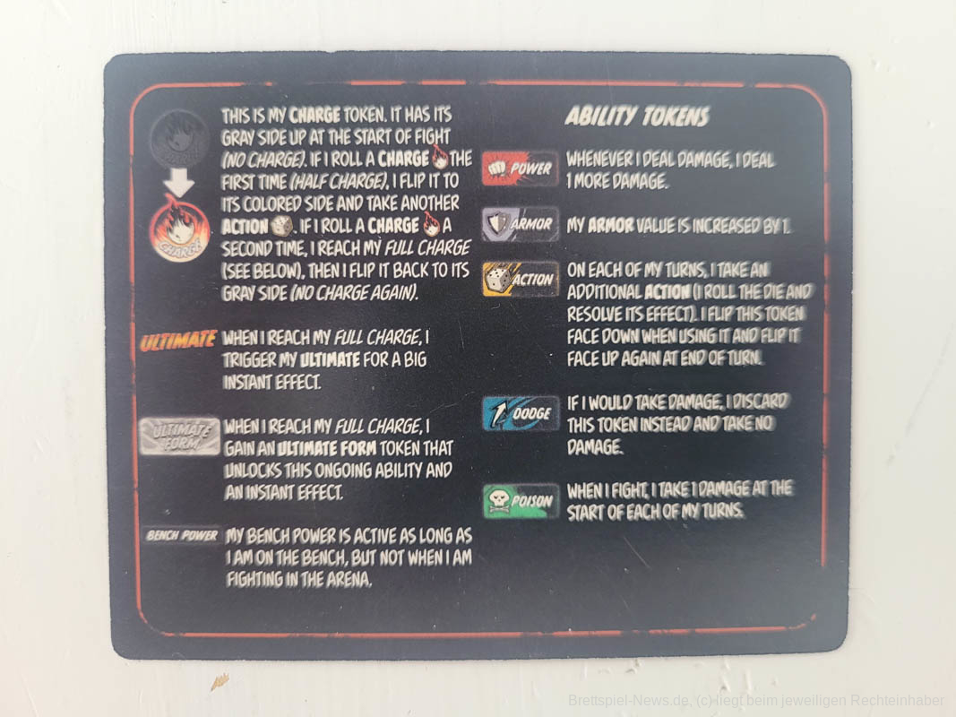 Die Regeln sind angenehm verständlich und mit einem Augenzwinkern formuliert – inklusive zahlreicher Beispiele. Humor in Regeltexten ist nicht ungefährlich, funktioniert hier aber gut. Der lockere Ton passt hervorragend zum trashig-emotionalen Arena-Feeling, das das Spiel vermitteln möchte.