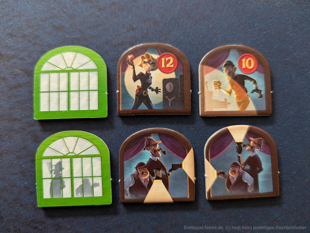 Zuletzt gibt es noch Plättchen mit Detektiven, die mit Ihren Taschenlampen immer in verschiedene Richtungen strahlen und so platziert werden sollten, dass sie möglichst Diebe mit hohem Punktewert aus der richtigen Richtung anstrahlen. Räume frei von Dieben gelten auch als valides Ziel und sind zum Spielende ebenfalls Punkte wert, wenn sie angestrahlt werden.