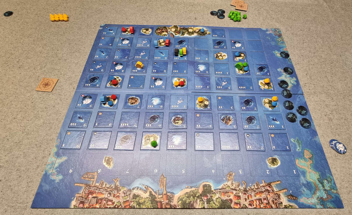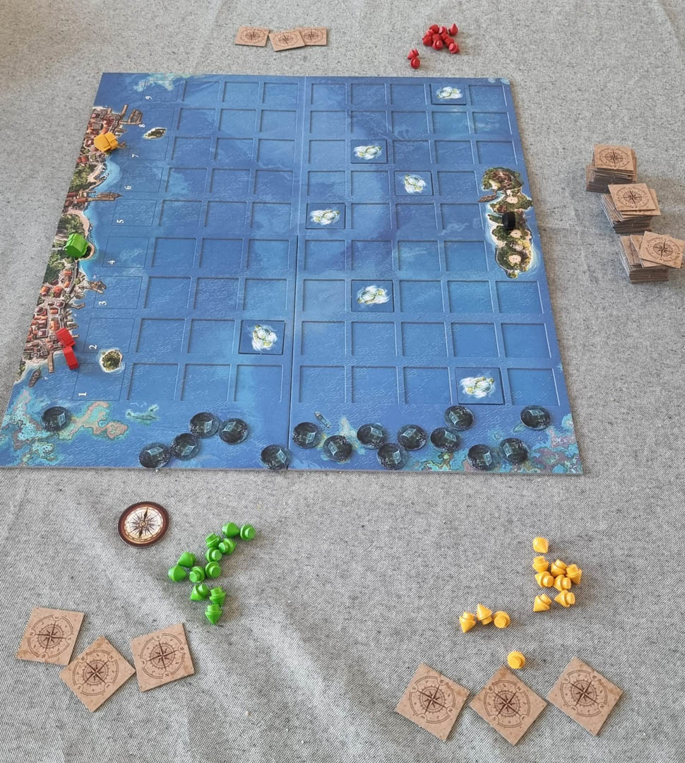 Das Spielfeld besteht aus 9 Spalten, die jeweils 8 freie Reihen für Plättchen bieten. Zum Spielstart verteilen die Spielenden zufällig einige Inseln über die verschiedenen Spalten und ziehen jeweils drei Plättchen. Die zwei Schiffe pro Person starten am oberen Land-Rand , das Piratenschiff auf der gegenüberliegenden Pirateninsel.