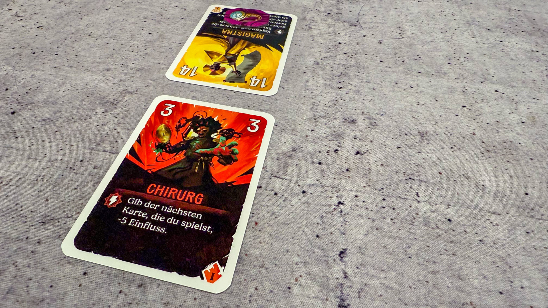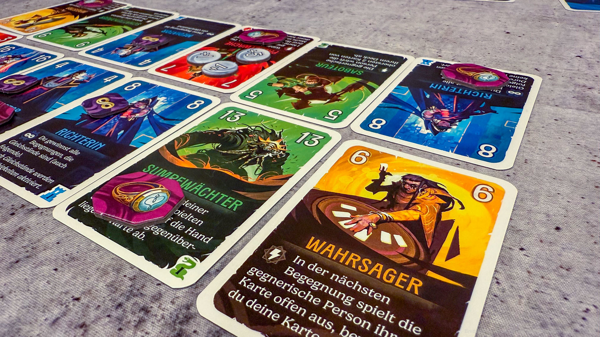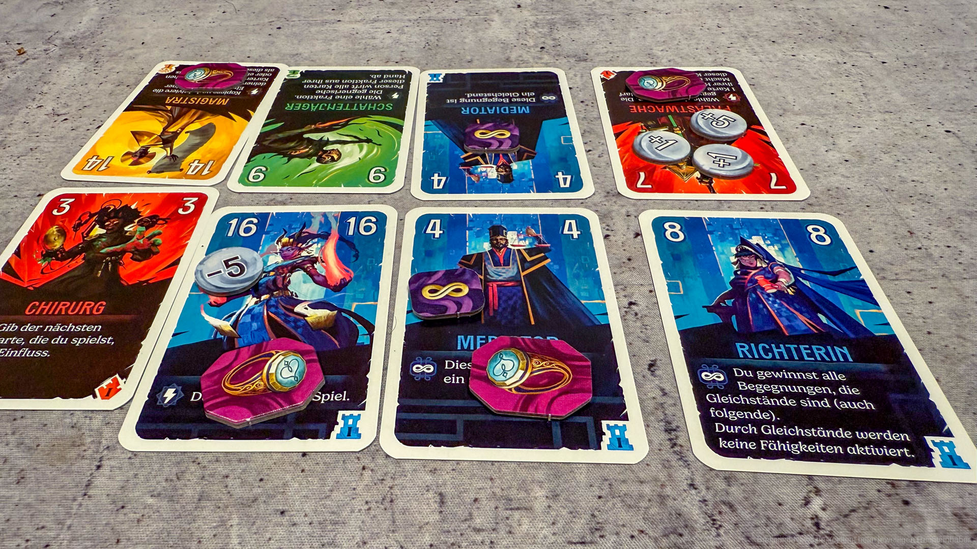 Auf der anderen Seite merkt man dem Spiel an, dass das Thema eher schwach aufgesetzt ist. Die Fraktionen von Cardia dienen nur als grober Rahmen, ohne dass man wirklich in eine Welt eintaucht. Wer hier eine dichte Story erwartet, wird eher enttäuscht. Außerdem entsteht ein kleiner Erfahrungsvorteil, wenn eine Person das Spiel bereits kennt. Wer die Fähigkeiten der Karten verinnerlicht hat, kann deutlich besser planen und einschätzen, wie Züge des Gegners zu kontern sind. Für Neueinsteiger kann das anfangs etwas frustrierend sein.