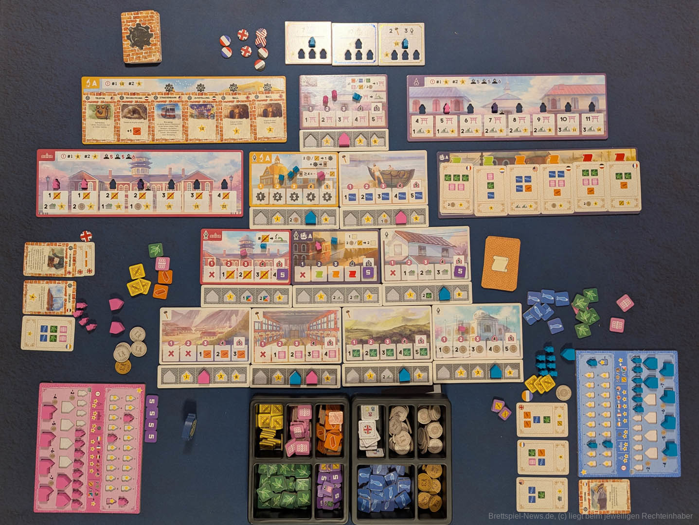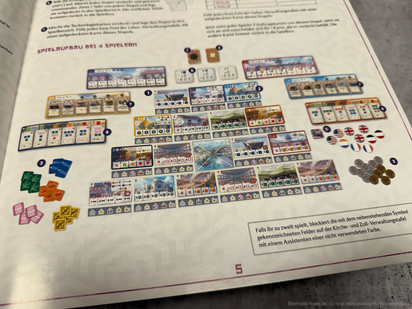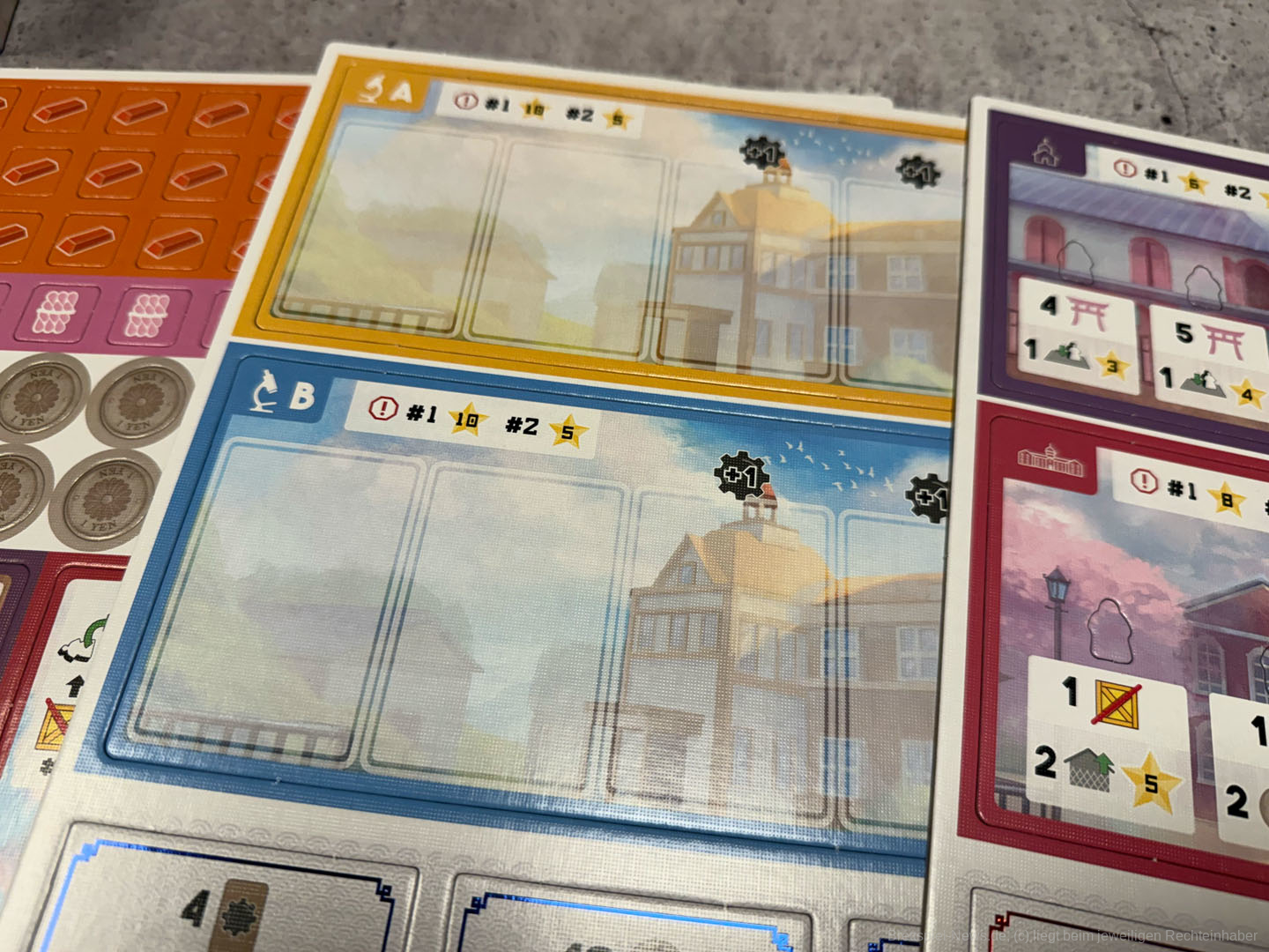 Zum Spielaufbau werden in "Yokohama" Gebietstafeln pyramidenförmig ausgelegt. Alle erhalten einen Präsidenten-Meeple, eine Anzahl Assistenten und zwei Läden.