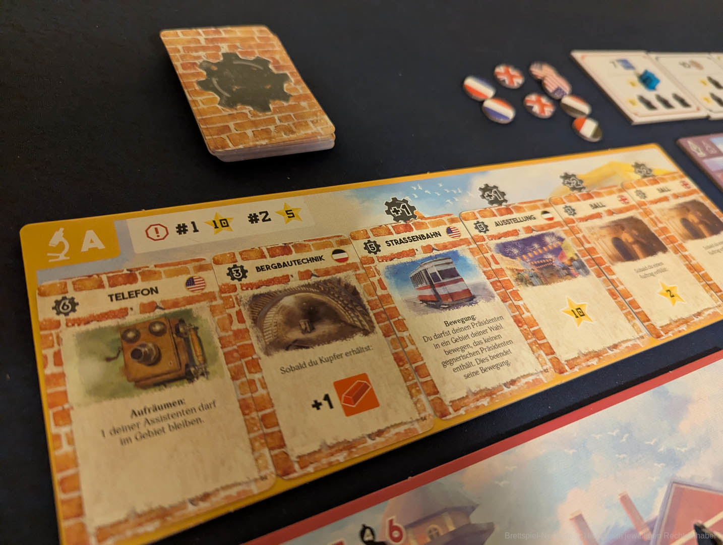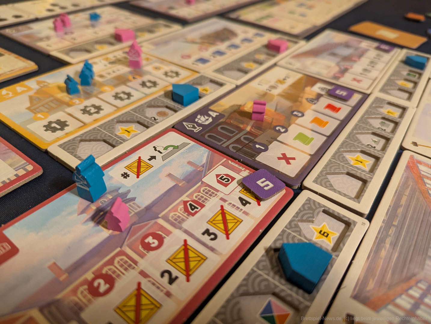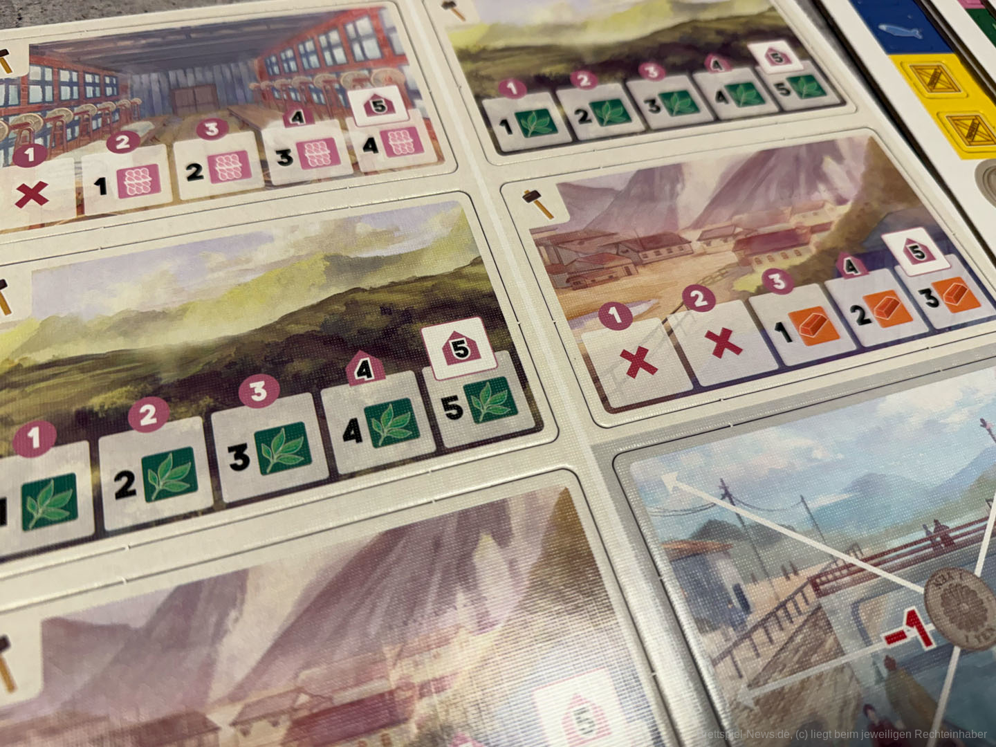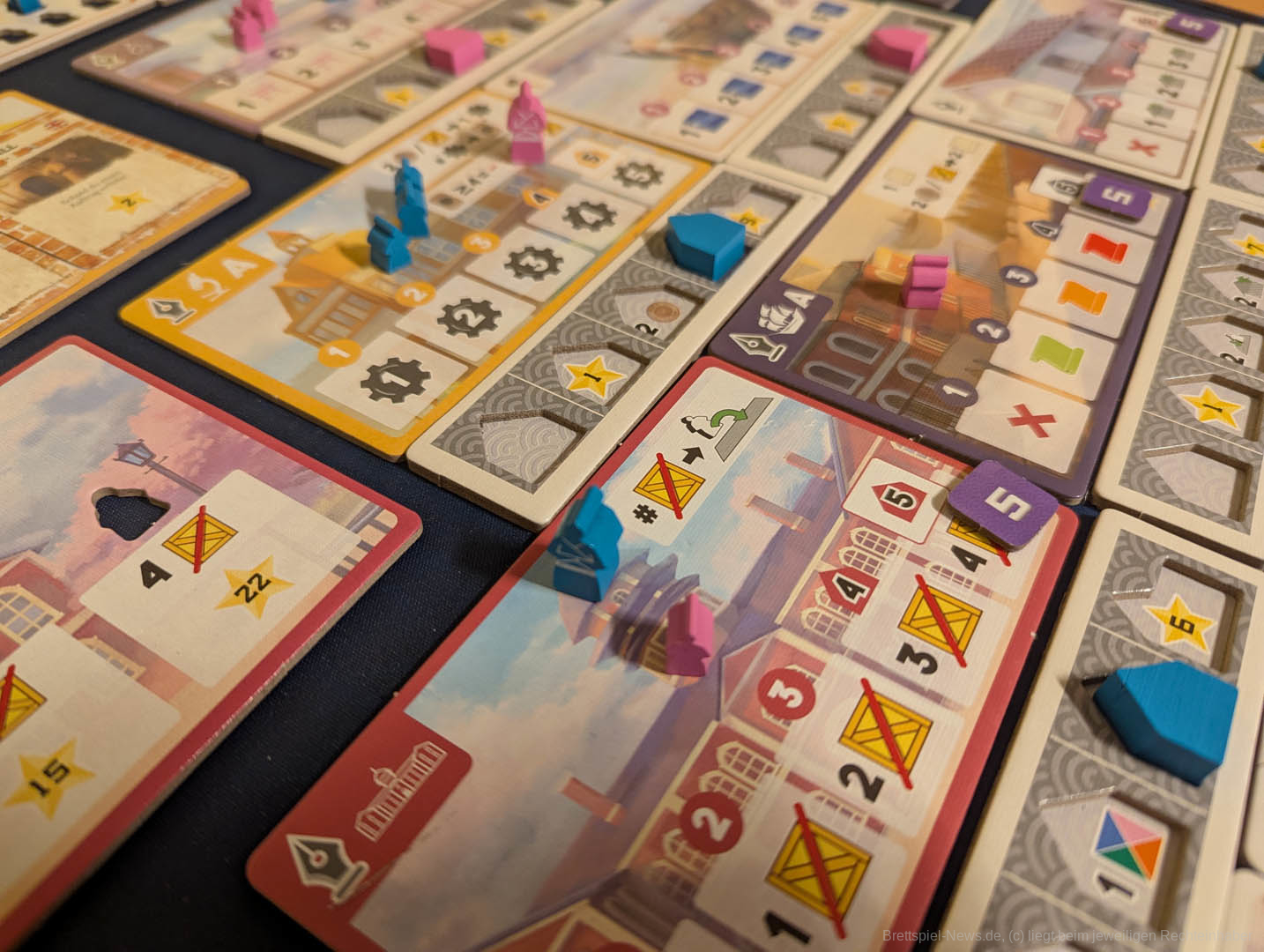 Zum Spielaufbau werden in "Yokohama" Gebietstafeln pyramidenförmig ausgelegt. Alle erhalten einen Präsidenten-Meeple, eine Anzahl Assistenten und zwei Läden.