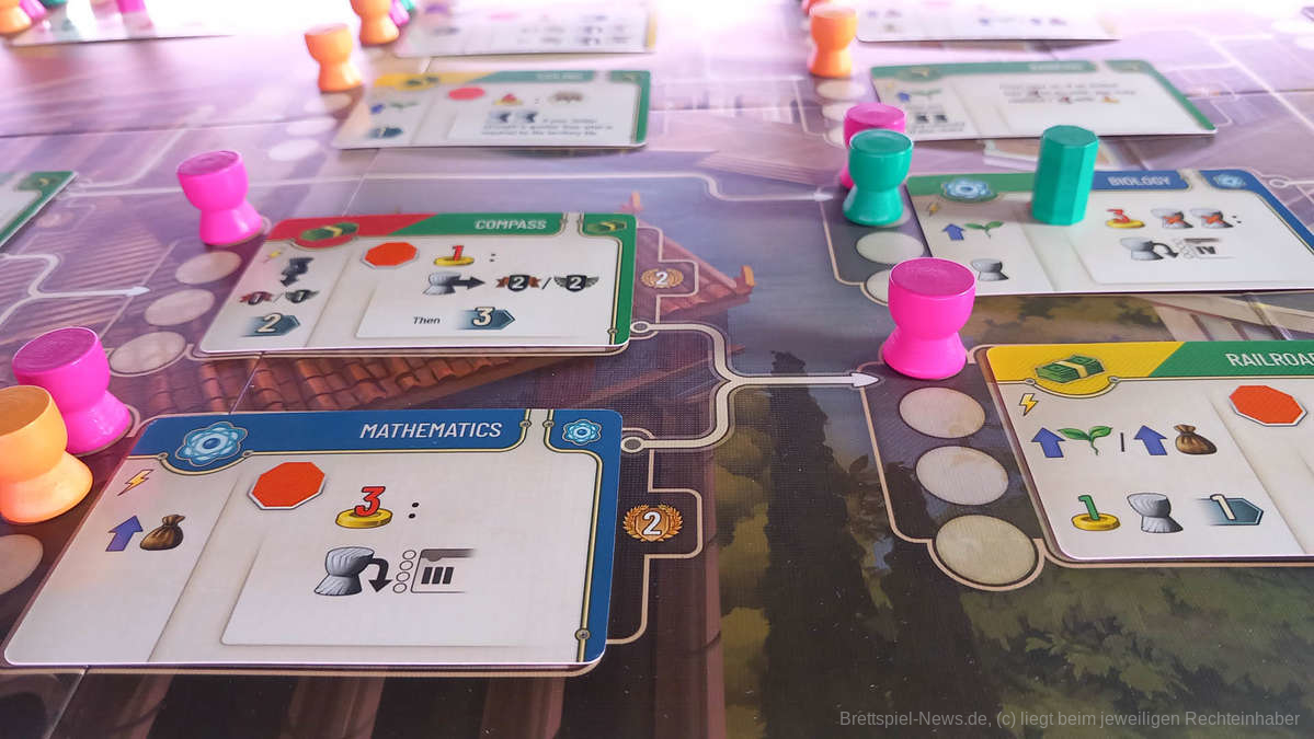 Auch die Regierungs-Karten, die den Spielenden asymmetrische Fähigkeiten verleihen, laden dazu ein, alle mindestens einmal auszuprobieren. Das bedeutet leider nicht, dass sich alle Regierungen sehr unterschiedlich spielen. Sie belohnen zwar verschiedene Aspekte des Spiels, wie die Errichtung von Siedlungen und die Befestigung von Städten, es wäre aber fatal, wenn man dafür die Erforschung von Technologien vernachlässigt. Es ist kein Zufall, dass der Technologie-Baum einen Großteil der Spielfläche einnimmt. Meist ist die beste verfügbare Aktion, mit einem Gelehrten eine neue Technologie freizuschalten. Hier erhältst du Siegpunkte, Ressourcen und neue effiziente Aktionen in einem Paket. Alle anderen Elemente des Spiels stehen im Hintergrund. Wer bei den Technologien einen Vorsprung hat, droht mit dem Sieg davonzulaufen, noch bevor die ersten Zielkarten erfüllt sind.