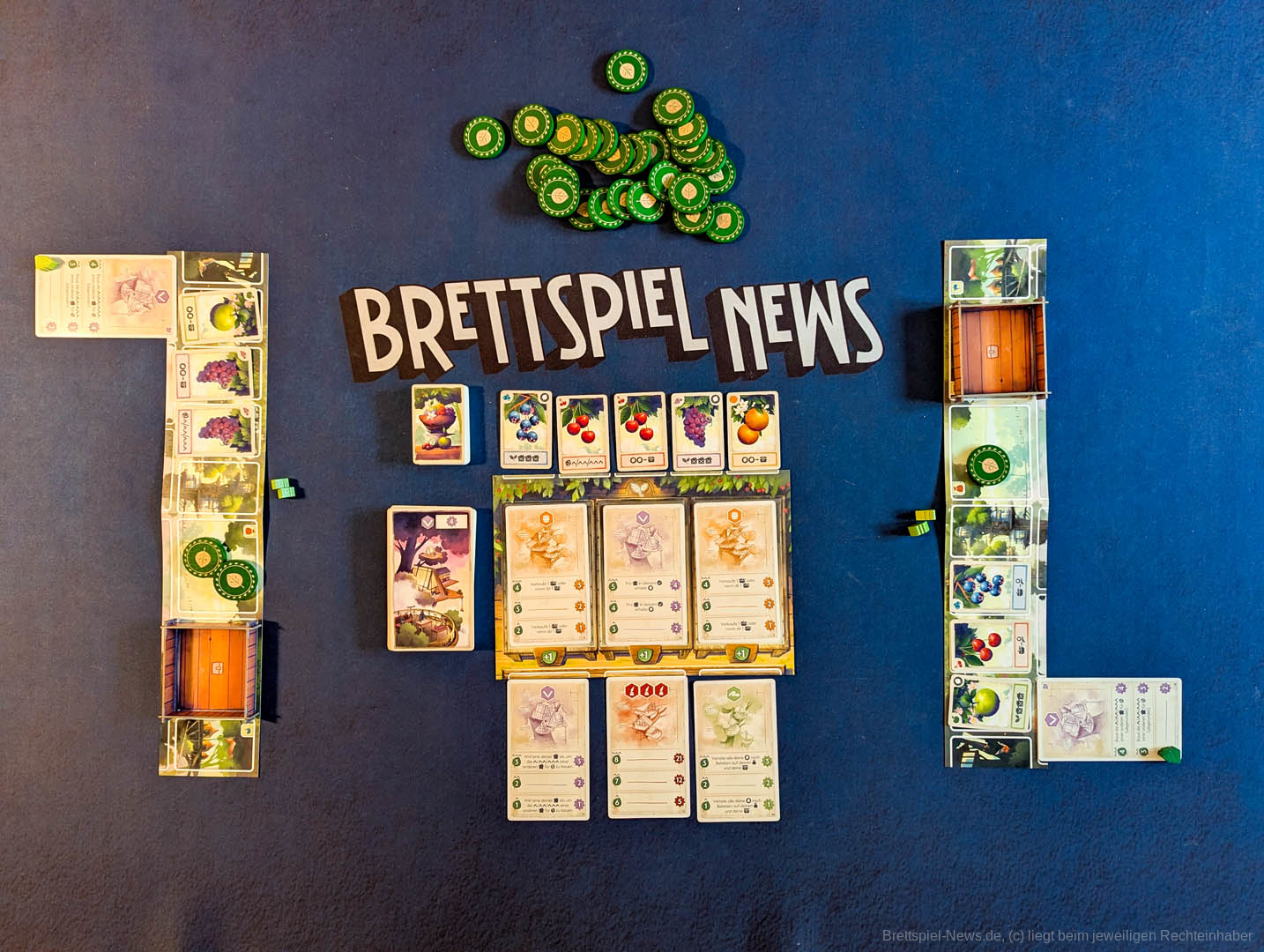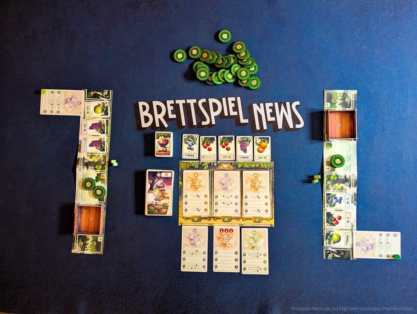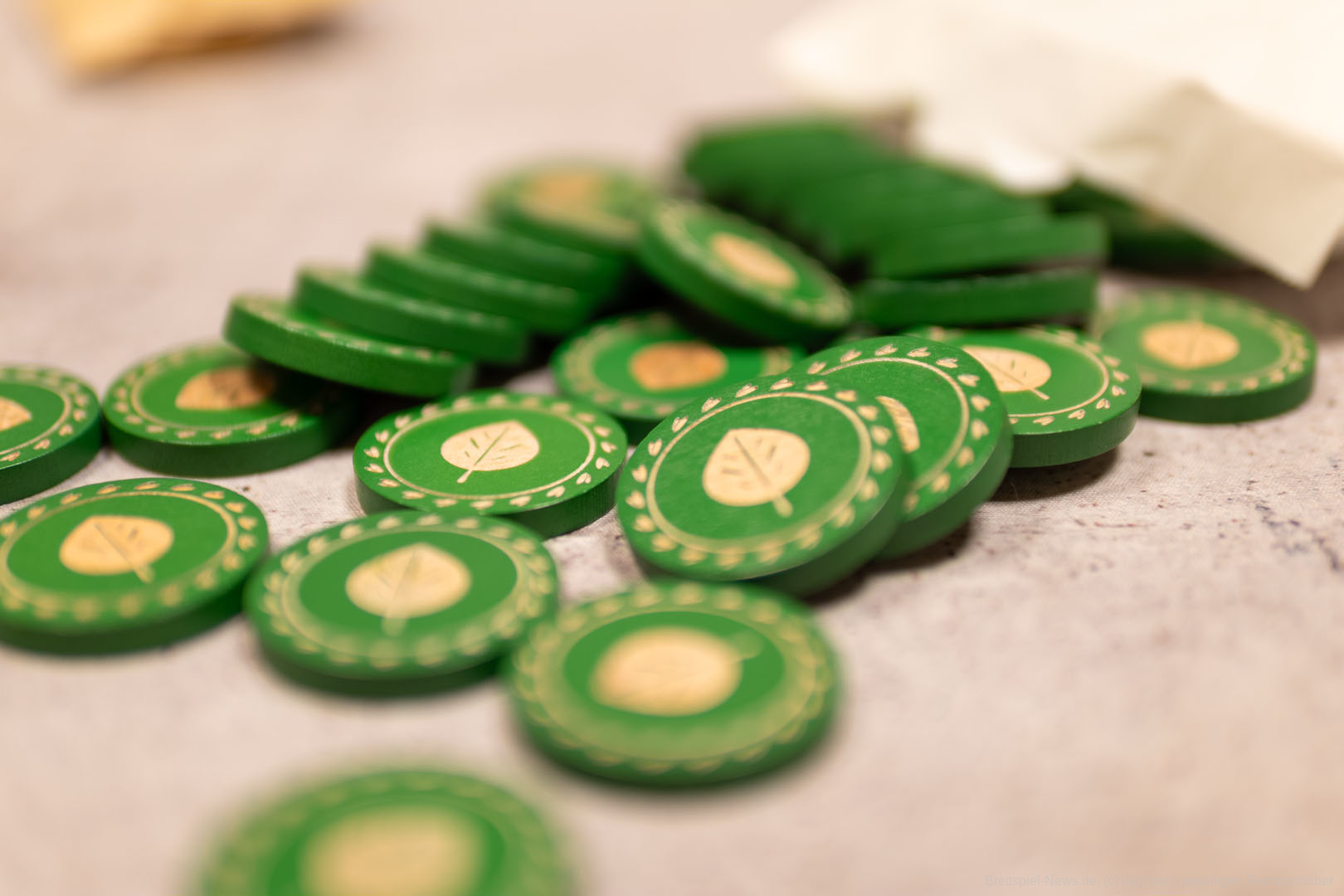 Leider wurde dieses aber nur halbherzig umgesetzt. Der Einsatz von Münzen steht im Widerspruch zum beschriebenen Tausch von Früchten. Da hilft es auch nicht, wenn diese grün bemalt sind. So verfliegt die thematische Tiefe dann leider doch wieder schnell und es bleibt der Eindruck, dass jedes Thema hätte verwendet werden können. Das ist natürlich ein Problem sehr vieler Spiele, und im vorliegenden Fall schafft zumindest die gelungene Präsentation es doch, einen ansprechenden Gesamteindruck zu hinterlassen.