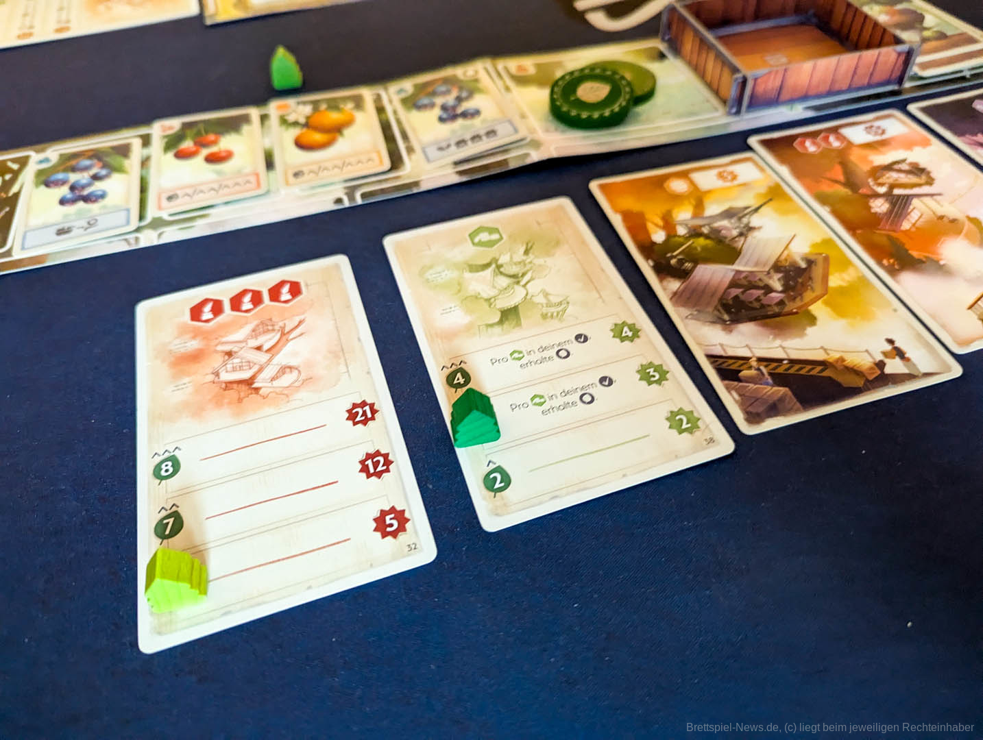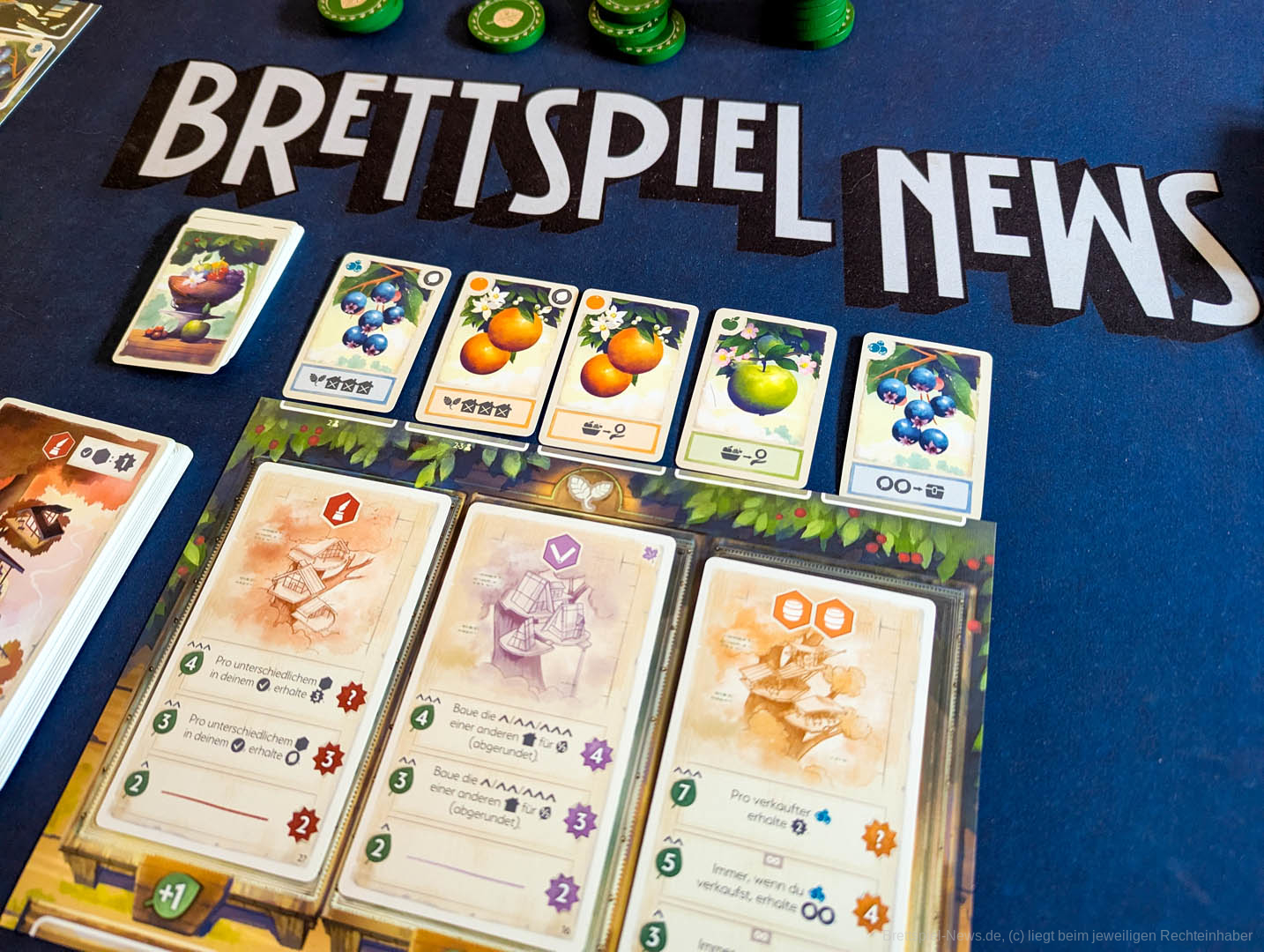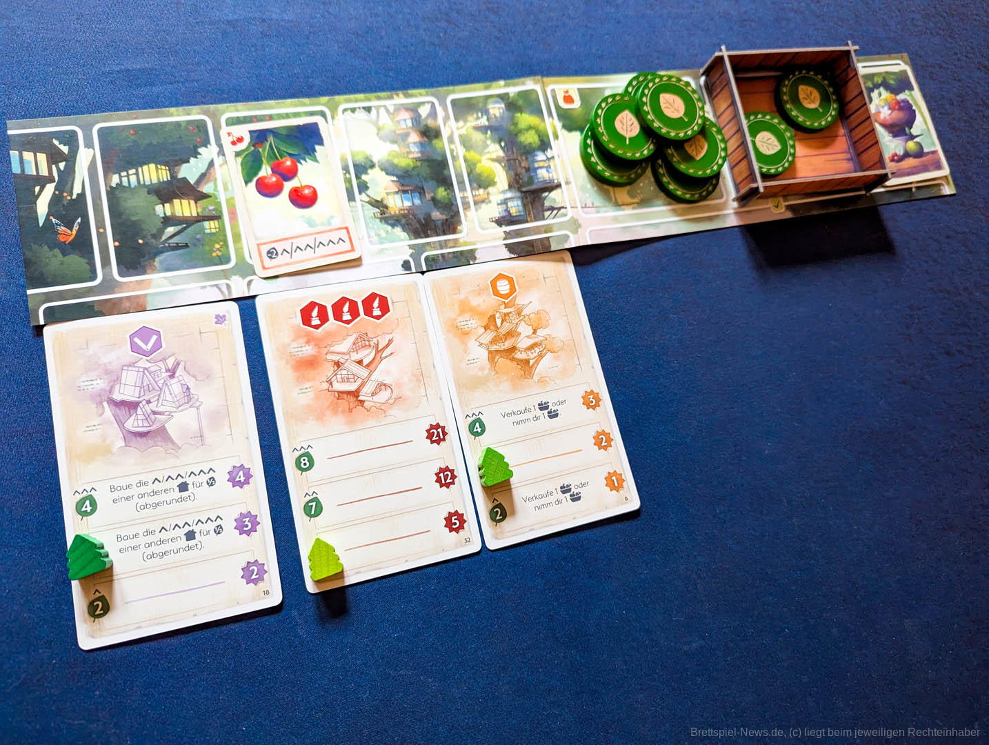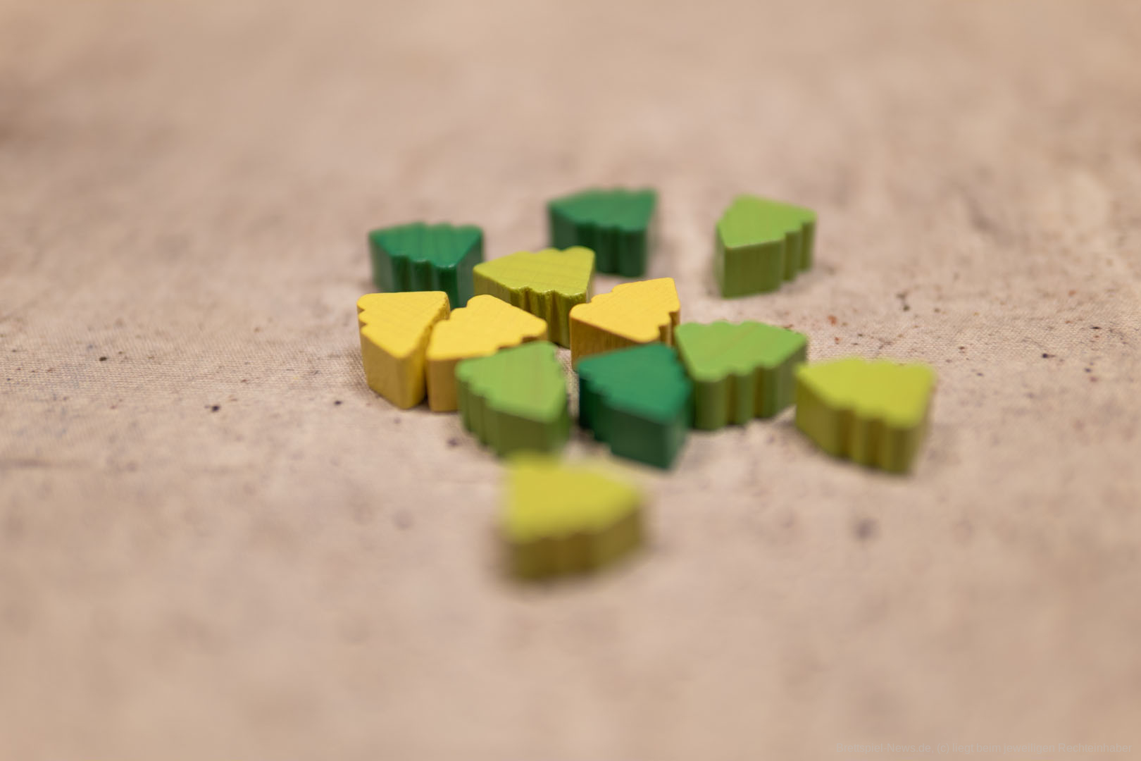 Leider wurde dieses aber nur halbherzig umgesetzt. Der Einsatz von Münzen steht im Widerspruch zum beschriebenen Tausch von Früchten. Da hilft es auch nicht, wenn diese grün bemalt sind. So verfliegt die thematische Tiefe dann leider doch wieder schnell und es bleibt der Eindruck, dass jedes Thema hätte verwendet werden können. Das ist natürlich ein Problem sehr vieler Spiele, und im vorliegenden Fall schafft zumindest die gelungene Präsentation es doch, einen ansprechenden Gesamteindruck zu hinterlassen.