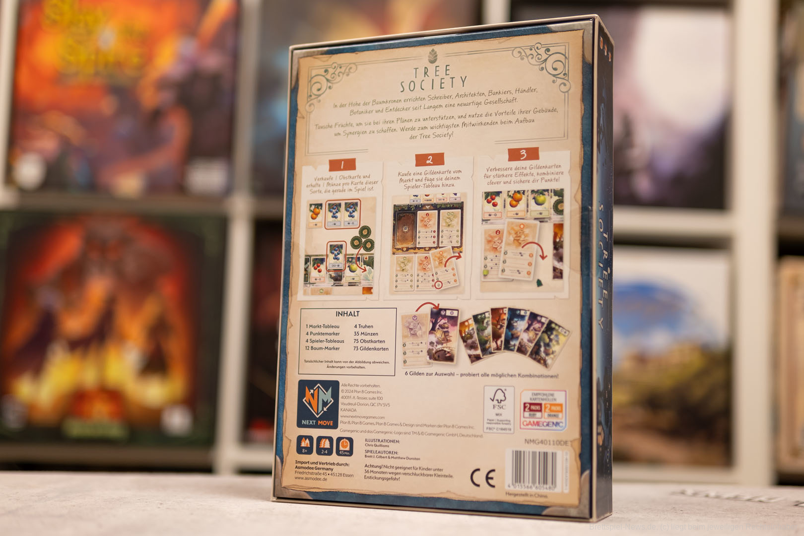 Spielerisch bietet „Tree Society“ zwar keine besonders innovativen Spielmechanismen, kann aber mit geringem Regelumfang, spannenden Entscheidungen und belohnenden Spielzügen überzeugen. Die Herausforderung ist, die Effekte der Gildenkarten möglichst gut aufeinander abzustimmen und so effektive Kettenzüge zu ermöglichen. Besonders gut gefallen hat uns, dass alle Handkarten offen ausliegen und somit stets ersichtlich ist, wer von Entscheidungen profitieren wird. Der Wert des Obstes verändert sich dabei dynamisch. Es kann durchaus sein, dass andere vor uns die wertvollen Äpfel ausspielen und beim eigenen Zug sind sie schon deutlich weniger wert, da nun weniger im Spiel sind. Hier ist etwas Voraussicht wichtig.