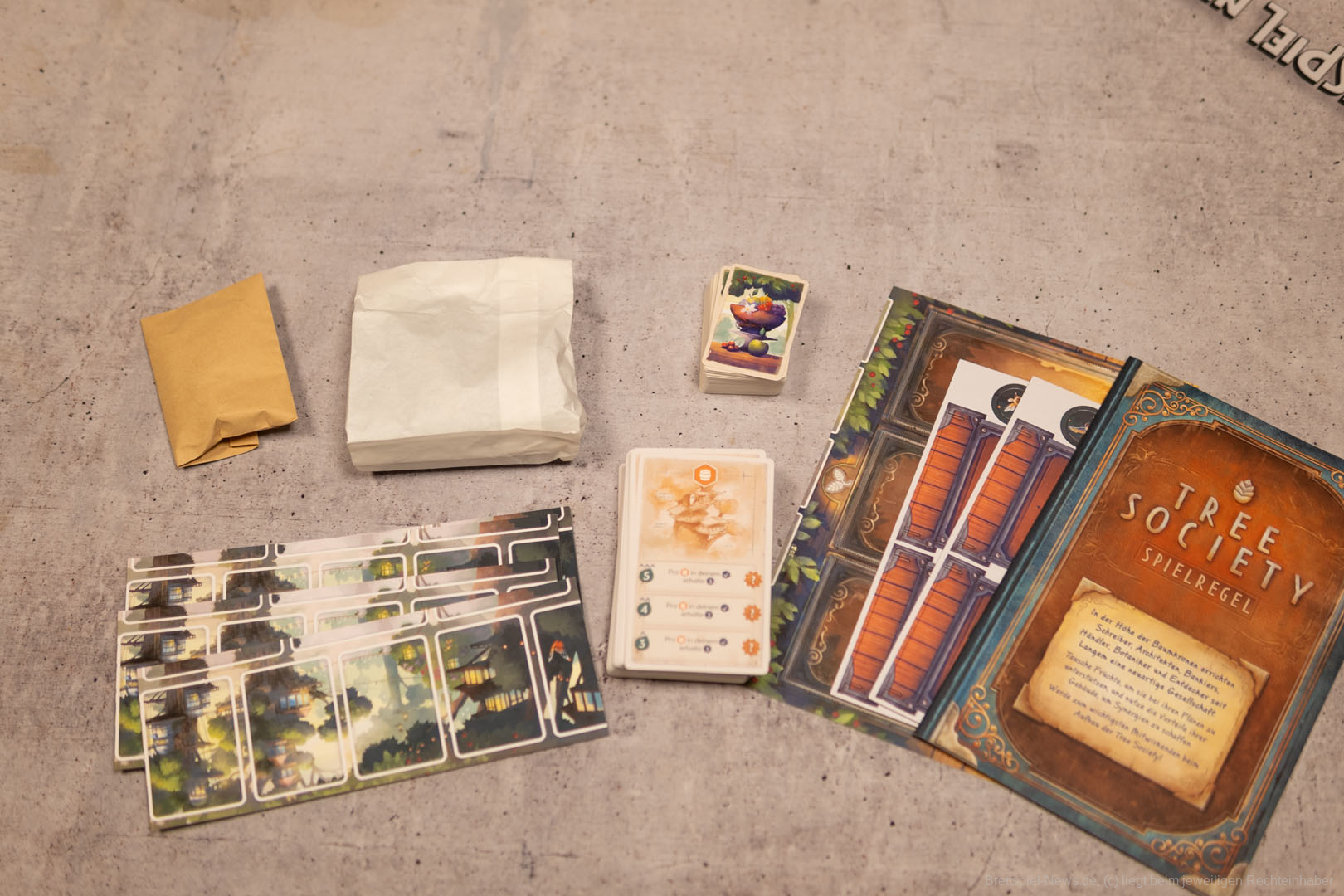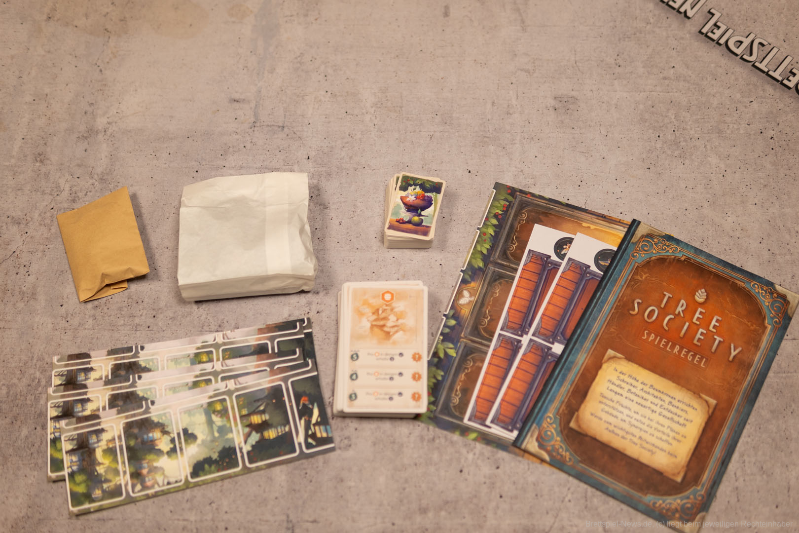 Der erste Eindruck von „Tree Society“ ist durchaus ansprechend. Ein hübsches Titelbild, der Einsatz von Holz beim Spielmaterial sowie ein interessantes Thema mit einer alternativen Lebensweise machen uns gleich neugierig.