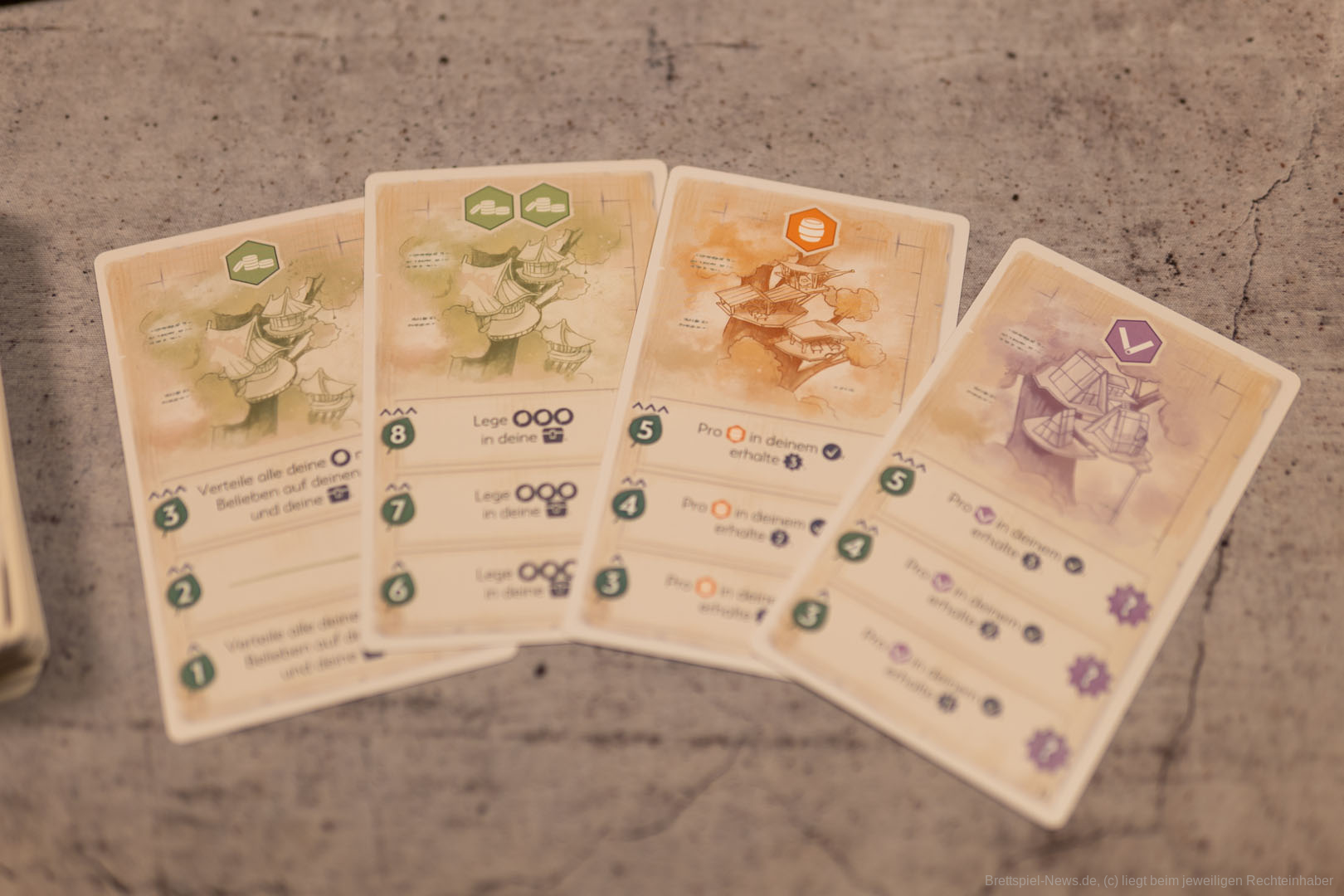 Die Gildenkarten sind den einzelnen Berufen zugeordnet und unterscheiden sich etwas in der Funktionsweise. Ihnen ist aber die Mechanik gleich, dass sie alle drei Stufen haben und jede Aufwertung Münzen kostet. Wird die dritte Stufe erreicht, so gilt die Karte als abgeschlossen und wird in ein separaten Bereich gelegt.