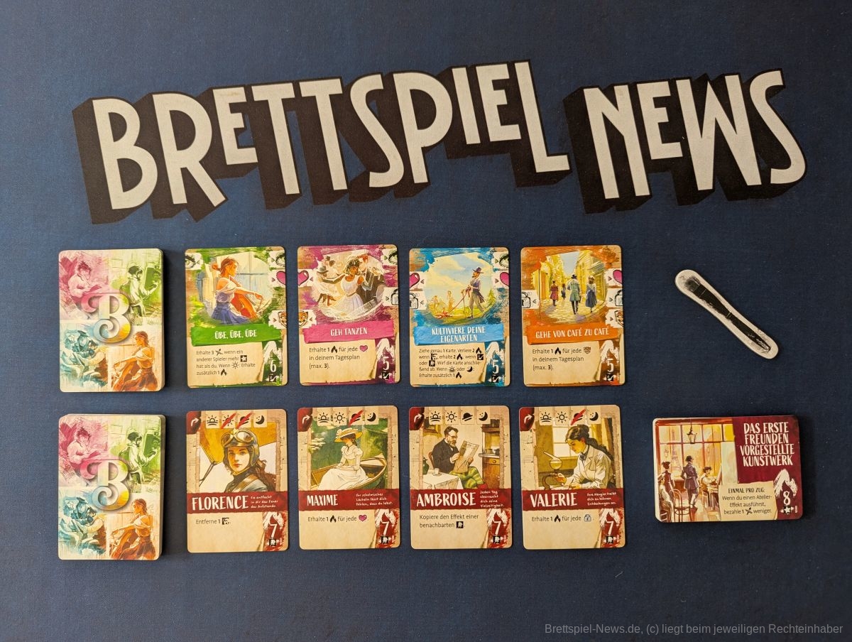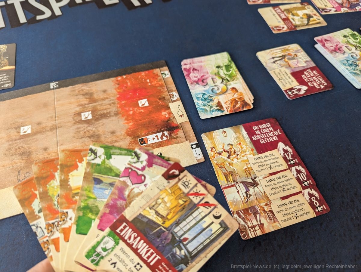 Die thematische Umsetzung ist hier durchaus gelungen. Als angehende Künstler konzentrieren wir uns auf das Erschaffen von Kunstwerken. Vernachlässigen wir unsere normale Arbeit, um unsere Grundbedürfnisse zu decken, hat das negative Folgen in Form von Leiden. Diese Karten haben spürbar negative Auswirkungen auf das eigene Spiel, und wir versuchen, sie gar nicht erst zu erhalten oder sie, falls doch geschehen, möglichst schnell wieder loszuwerden. Stets gilt, das Risiko gut abzuwägen. Dieses Element hat uns gut gefallen, allerdings sind die Karten unterschiedlich störend im weiteren Spiel, wodurch auch ein wenig Glück oder eben Pech beim Ziehen der Karten vorkommen kann.
