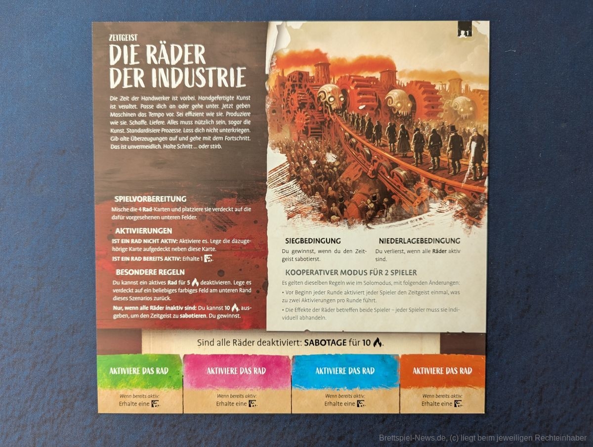 Neben den Basis-Regeln, gibt es noch andere Varianten, wie beispielsweise „Zeitgeist“, die uns gleich angesprochen hat. Sie kann als Solomodus oder als kooperativer Modus für zwei Personen gespielt werden. Dabei gibt es drei verschiedene Szenarien mit einzigartigen Siegbedingungen und speziellen Regeln. So kann etwa gegen die Räder der Industrie gespielt werden, ein Szenario, in dem sich die Künstlerseele von der Inspiration abwendet und sich der Gesellschaft anpassen soll.