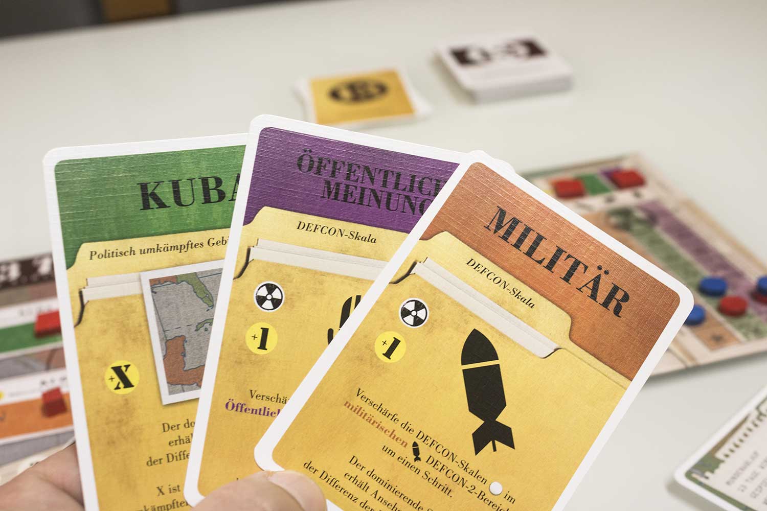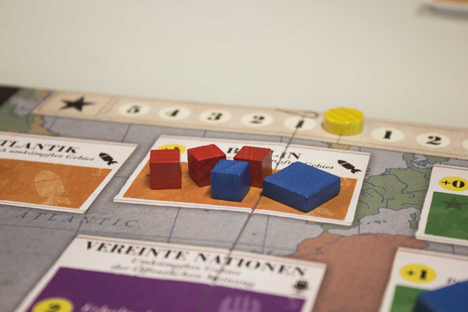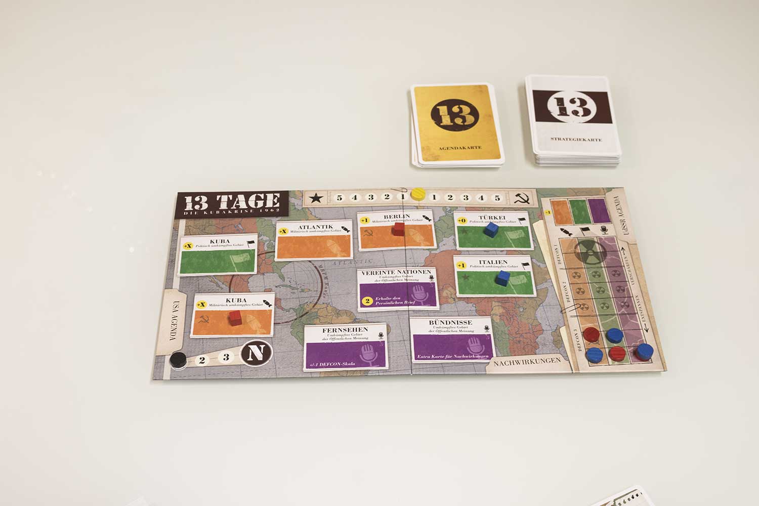 7. Nuklearkrieg: Nun wird noch geschaut, ob ein Spieler einen Nuklearkrieg beginnt und damit das Spiel verliert. Das passiert, wenn drei Marker einer Nation in der Defcon-Zone 2 liegen, oder ein Marker in Defcon 3.