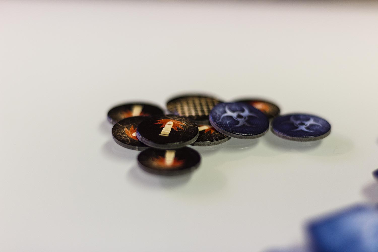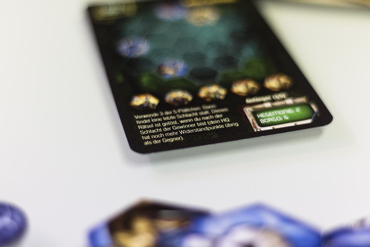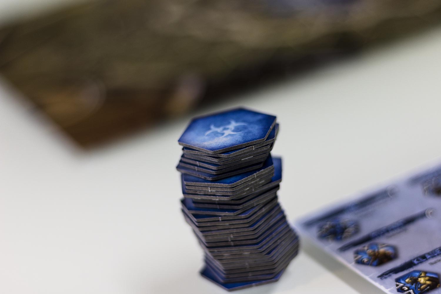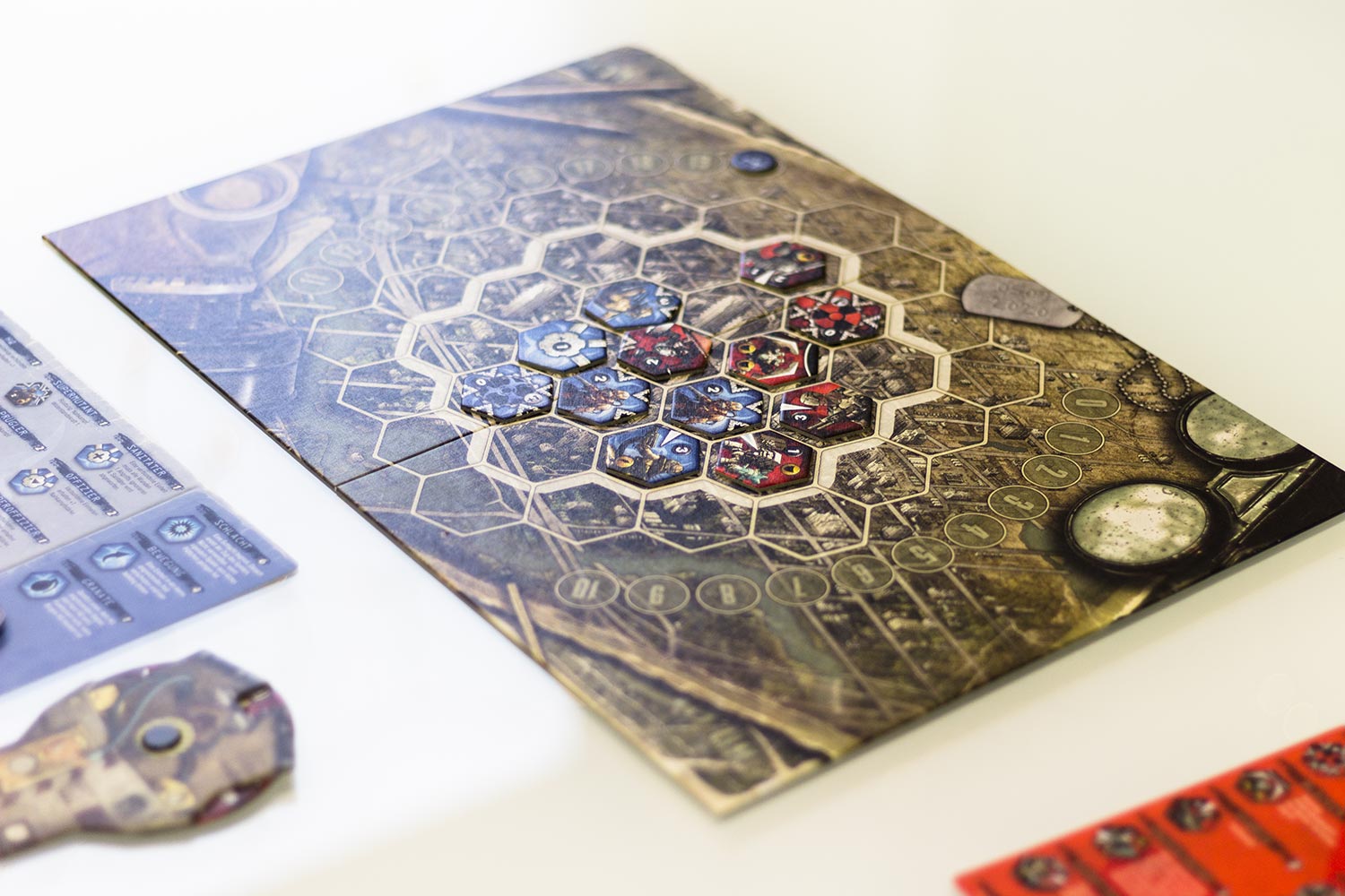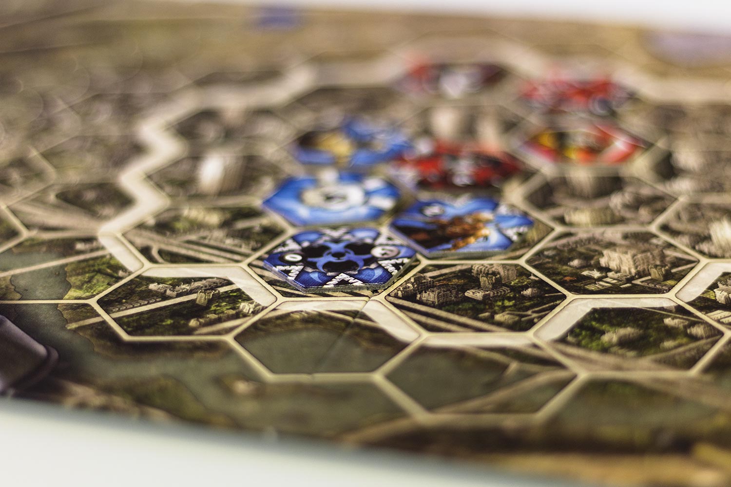 Es gibt dabei unterschiedliche Typen von Plättchen. Einmal gibt es die Krieger, die unterstützenden Module und die Aktionsplättchen. Die Einheiten werden auf den in Hexfelder unterteilten Spielplan gelegt.