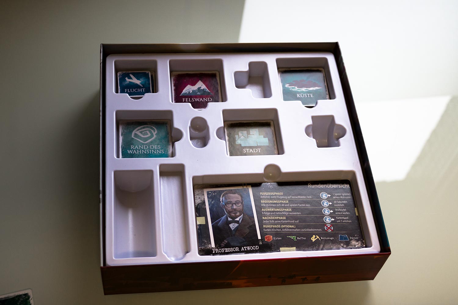Das Spielmaterial Das Spiel ist sehr hochwertig produziert. Fast alle Teile des Spiels sind bereits vorbereitet und in einer Plastikeinlage perfekt verstaut. So kommt auch beim Transport nichts durcheinander. Der positive Nebeneffekt, es lässt sich fast sofort losspielen. Auch der Druck der Materialien ist sehr gut gelungen und die Box sieht dank partiellen Lackdruck sehr edel aus. Natürlich sind die verwendeten Zeichnungen stimmig und passen sehr gut zu dem Setting des Spiels.