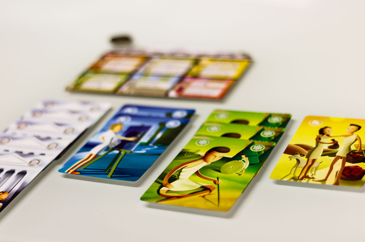 Das ist schnell erklärt und schnell verstanden. Nun muss noch verinnerlicht werden, was die Karten bringen, wenn sie in der Auslage liegen. Sie können von dort entweder abgeworfen werden und einen Sofort Effekt bringen, oder sie werden gesammelt und bringen bei einer gewissen Anzahl einen dauerhaften Effekt. Es gibt die Bereiche Militär, Religion, Wirtschaft, Wissenschaft, Utopia und Kultur. Jeder Bereich und die damit verbundene Kartenfarbe hat einen anderen Effekt.