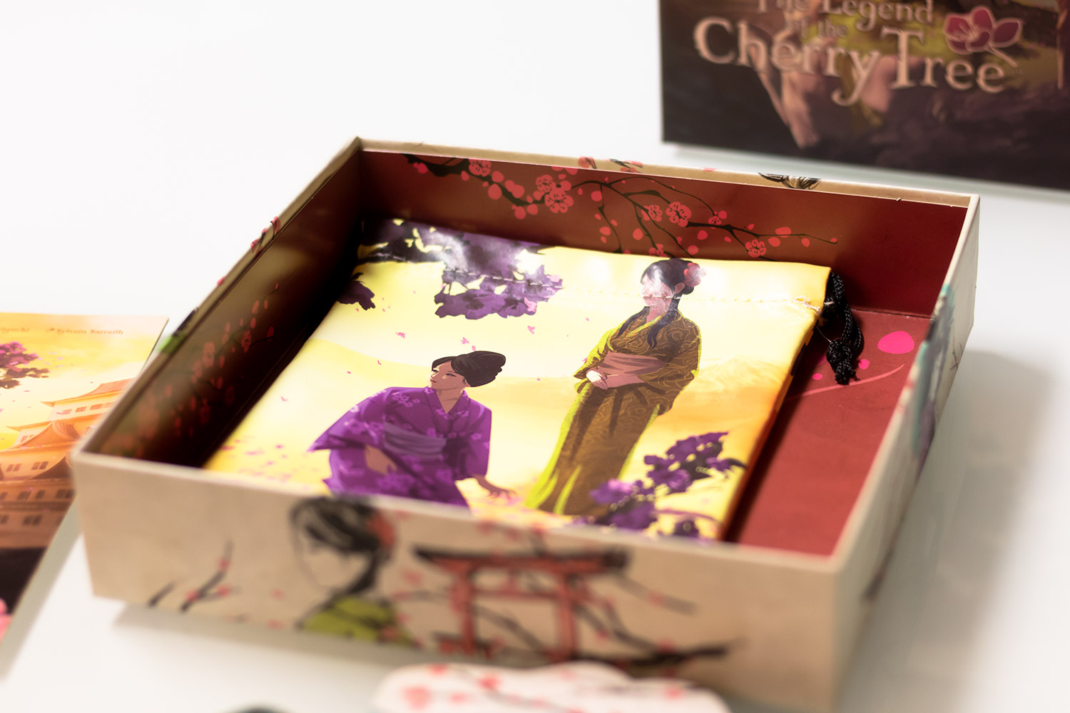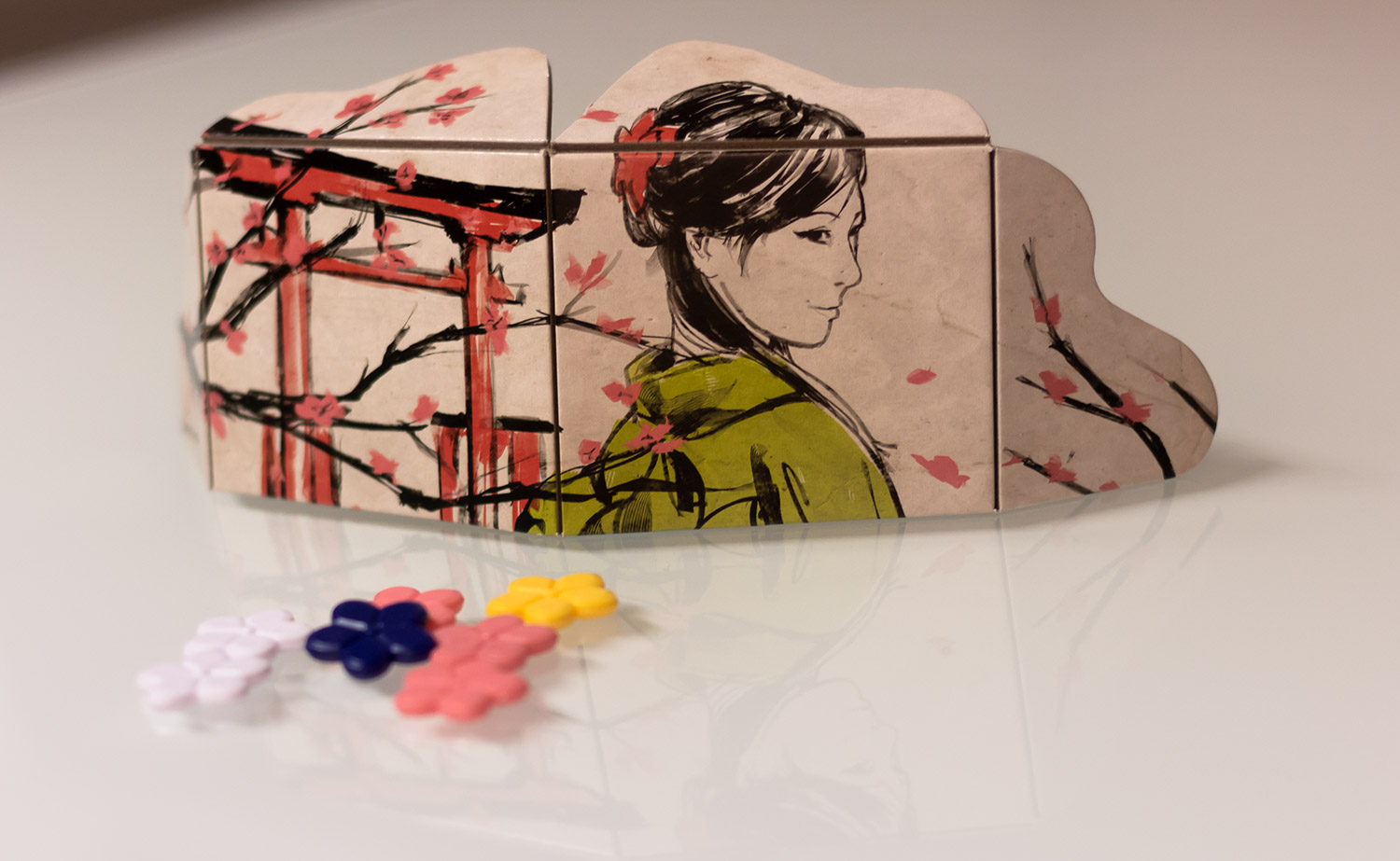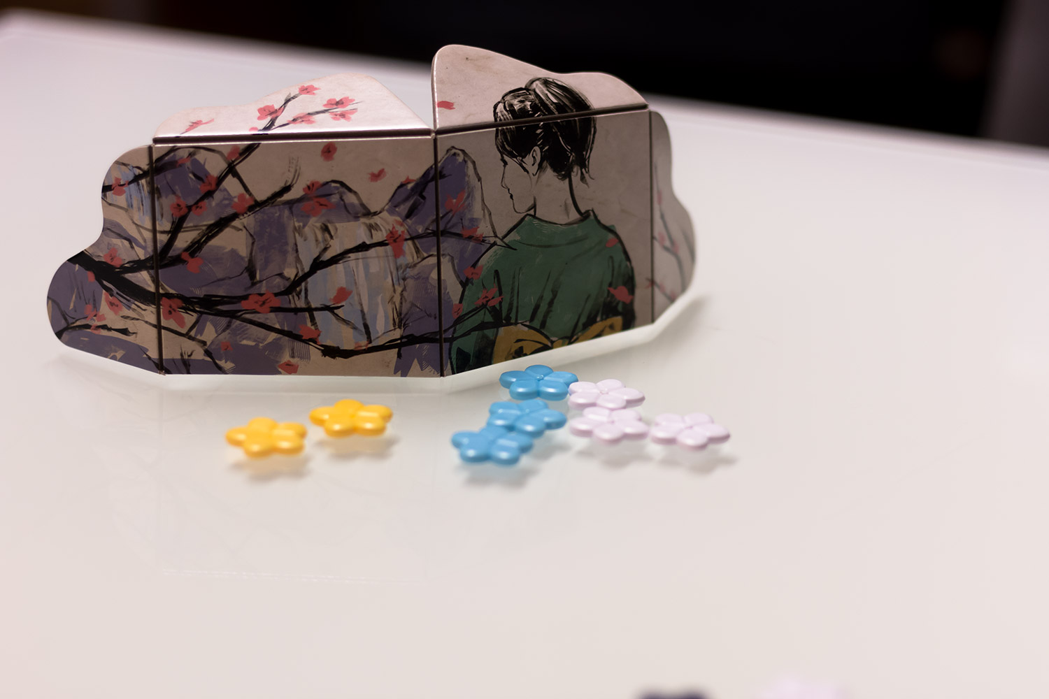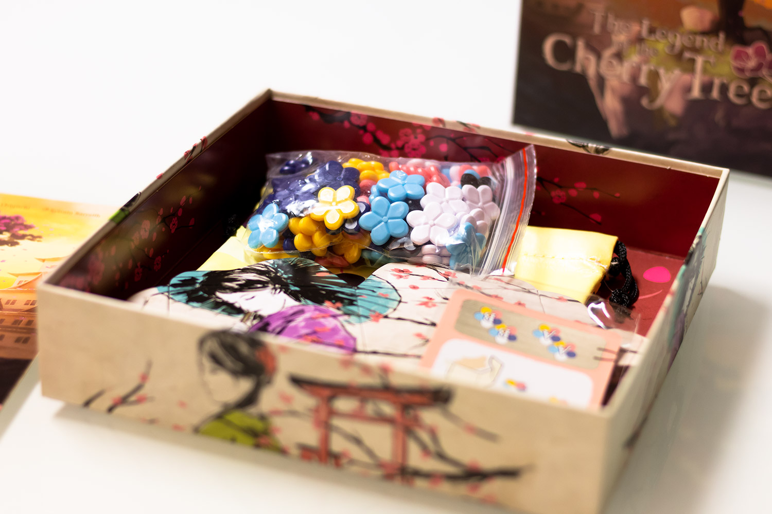 „The Legend of the Cherry Tree“ ist ein sehr hübsch produziertes Spiel. Wer die Packung das erste Mal öffnet und nicht weiß, was zu erwarten ist, wird erstaunt sein. Die kleine Box ist liebevoll produziert. Die Blüten sind aus Plastik und in kräftigen unterscheidbaren Farben hergestellt. Die Sichtschirme fallen nicht direkt um, wenn man sie zu streng anschaut, wie bei manchem anderen Spiel. Auch der farbenfrohe Beutel mit bedruckter Außenseite macht etwas her. Die Anleitung ist verständlich geschrieben und lässt keine Fragen offen.