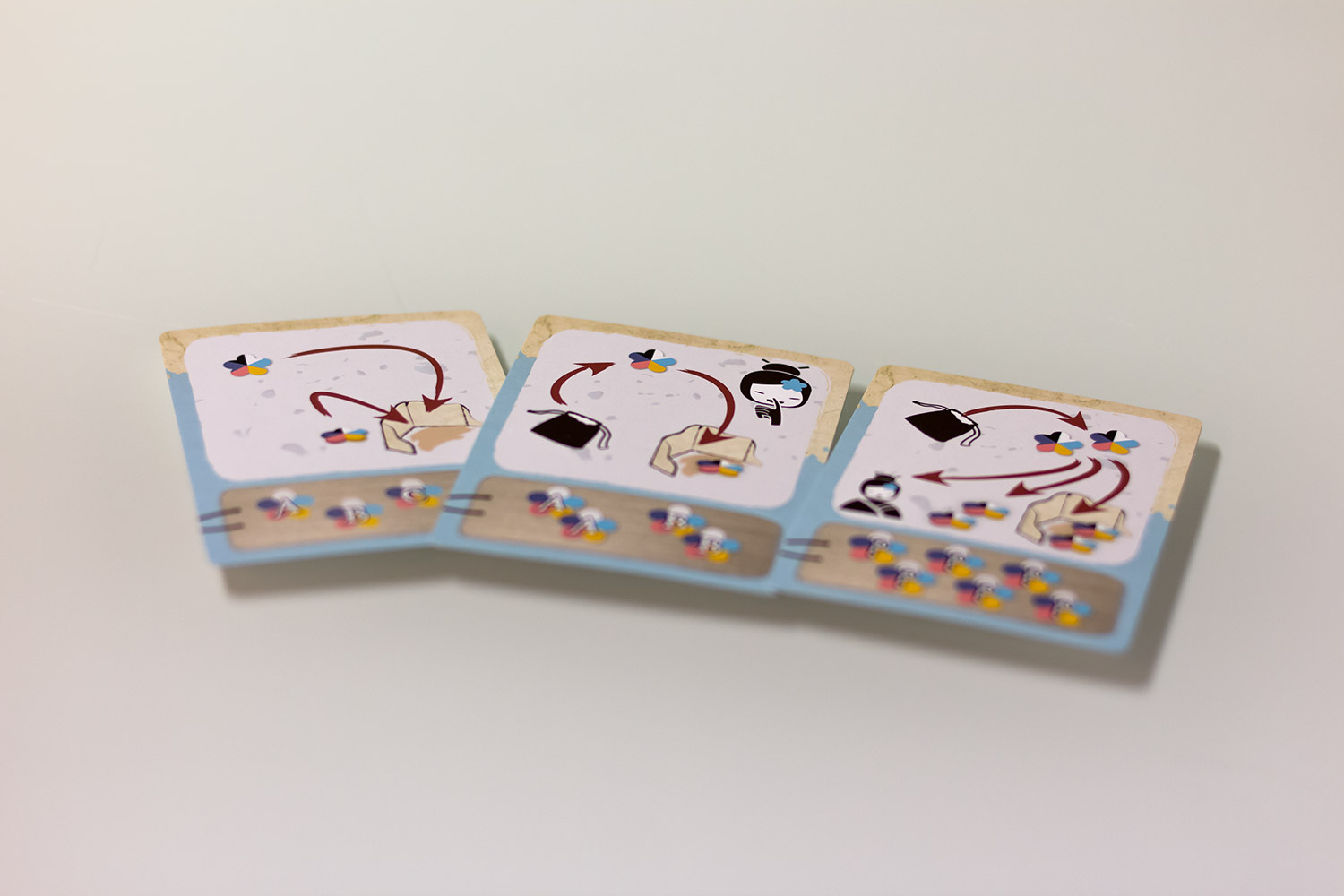 Dieser ist schnell erledigt. Jeder Spieler erhält einen Sichtschirm und der Beutel mit den Blüten wird parat gelegt. Nun müssen noch die drei Meisterkarten ausgelegt werden und das Spiel kann beginnen.