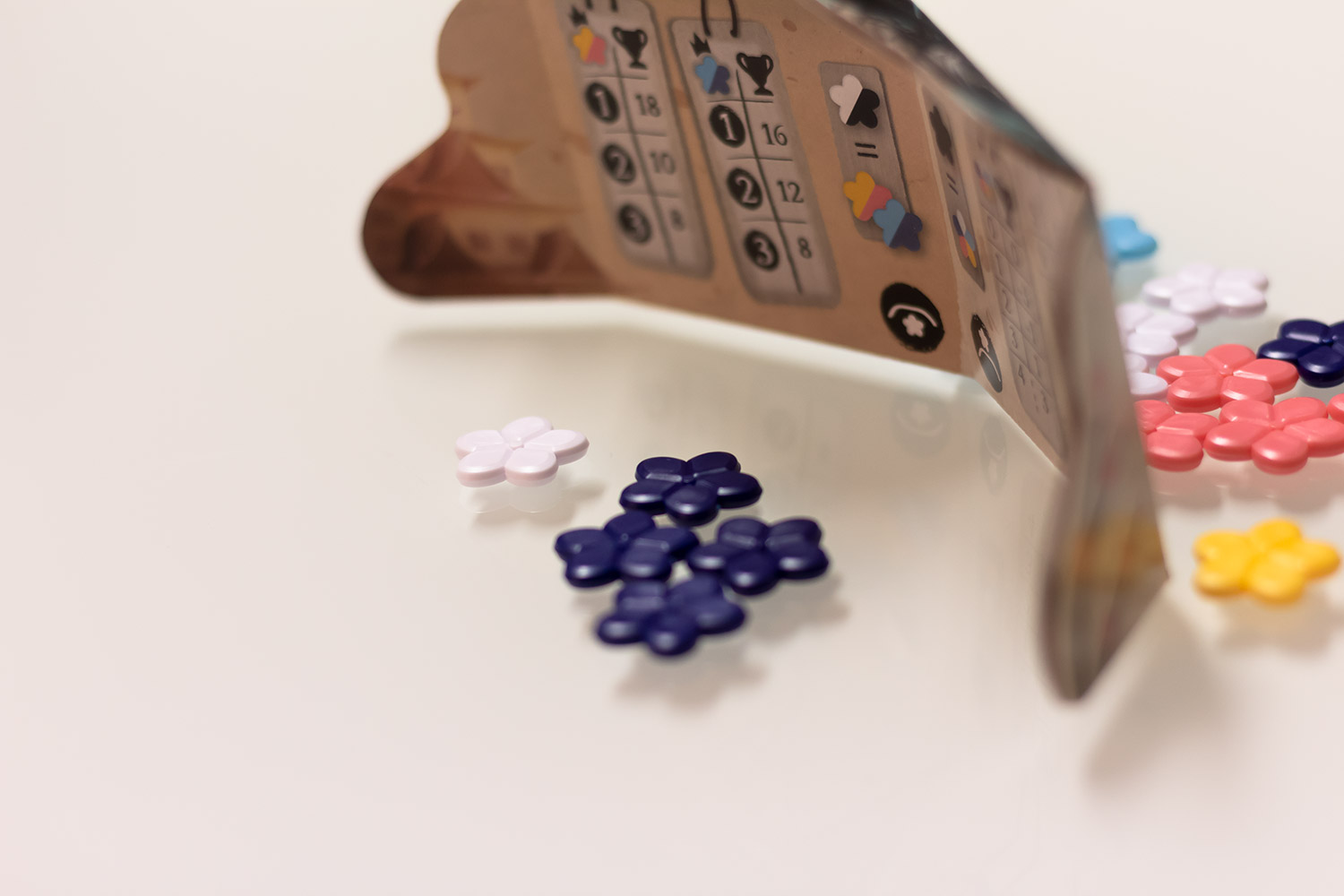 Dieser ist schnell erklärt. Jeder Spieler darf bis zu drei Mal in den Beutel greifen. Insgesamt dürfen maximal acht Blüten herausgezogen werden. Sind es mehr als acht, wandern diese in den Beutel zurück und der Spieler darf diese Runde nichts mehr machen. Auch sonst lohnt es sich nicht zu gierig zu sein. Sobald ein Spieler drei Blüten der gleichen Farbe oder alle fünf Farben mindestens einmal gezogen hat, darf er nicht mehr ziehen. War das ziehen hingegen erfolgreich, nimmt der entsprechende Spieler die Blüten vor seinen Sichtschirm und darf nun entscheiden, welche Blütenfarbe er hinter seinen Sichtschirm nehmen will.