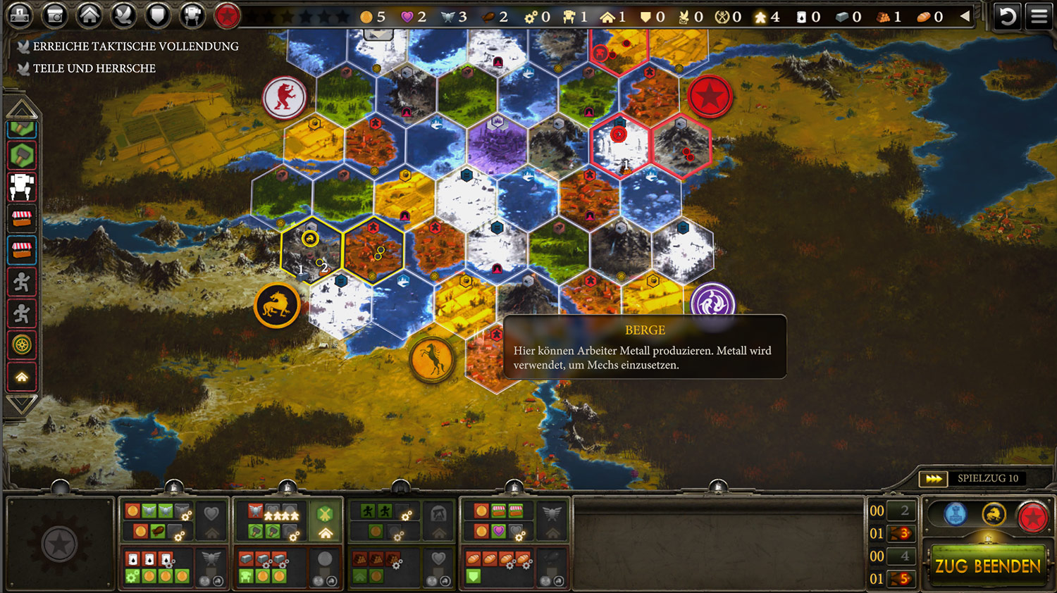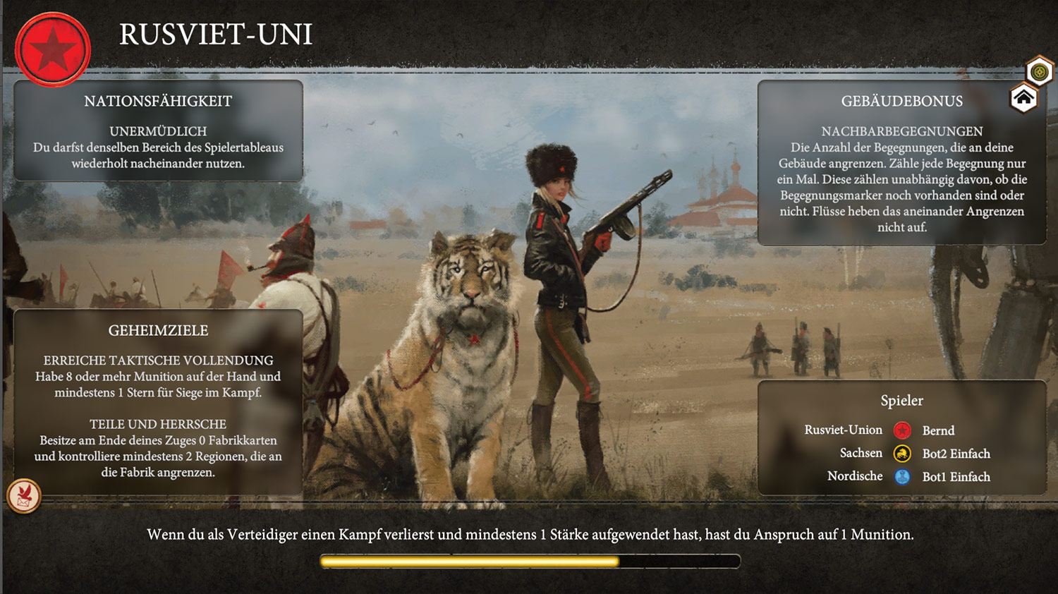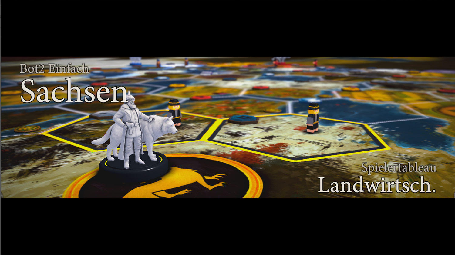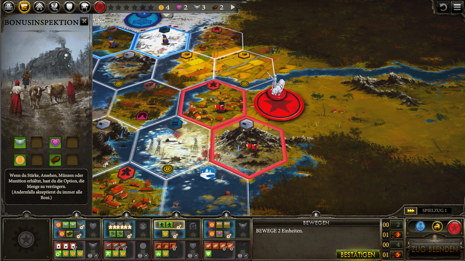 Ich habe schon viele digitale Spiele mit analoger Vorlage gespielt. Doch bei Scythe, das wohlgemerkt noch nicht fertig ist, fehlt mir aktuell etwas Liebe zum Detail. Alle Funktionen aus der Vorlage sind enthalten. Wer mag, kann auch das Material der Kickstarter Version aktivieren. Doch wenn es den eigenen Übersichtsplan nicht gibt und er nur als minimierte Ansicht am unteren Bildschirmrand existiert, dann fehlt es eindeutig an Übersicht. Man gewöhnt sich zwar im Laufe des Spiels an die Minimierung, aber zufrieden bin ich damit nicht. Vor allem Neulingen wird es so fast unmöglich gemacht, den Kernmechanismus des Spiels zu verstehen. Etwas oben wegnehmen und unten etwas verbessern und von beidem zu profitieren. Als Spieler der analogen Vorlage ist das schnell möglich und es kann mit der Übersicht gespielt werden, aber schön ist etwas anderes.