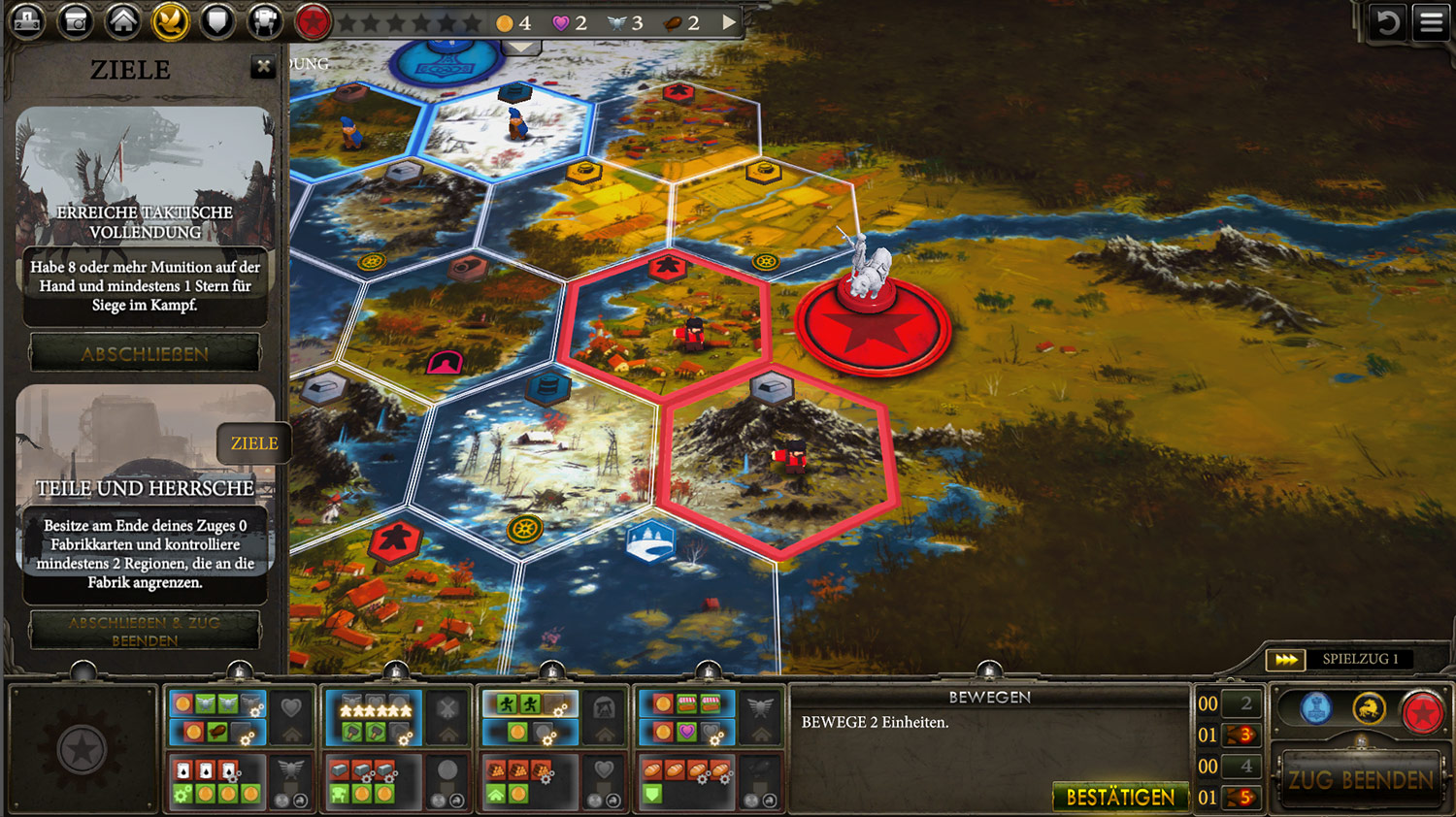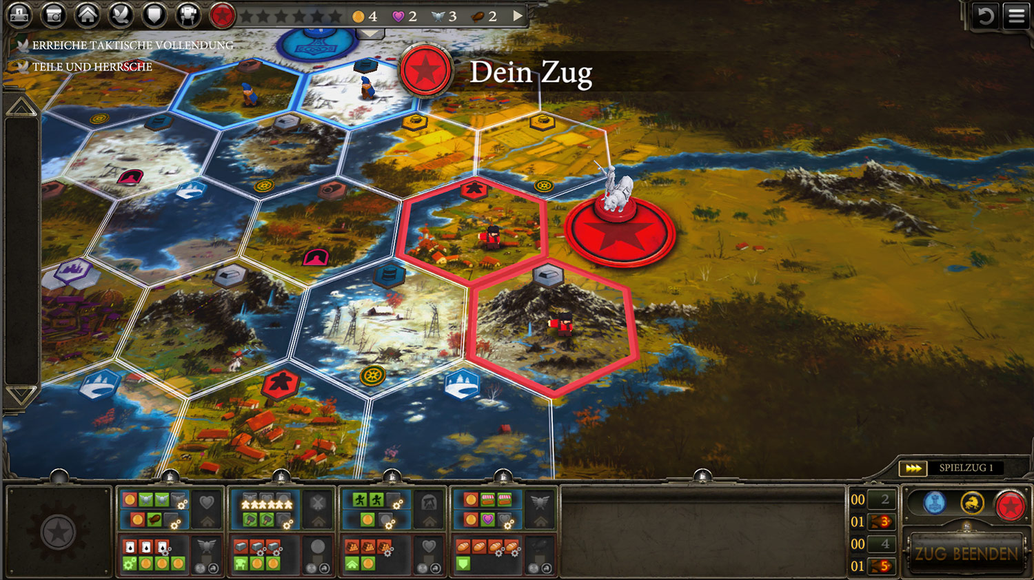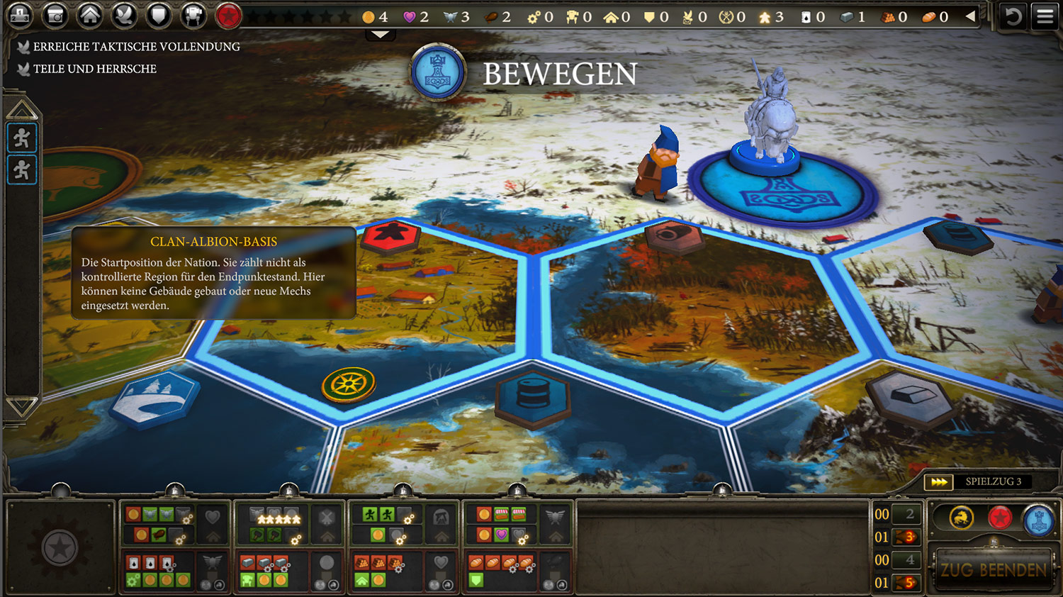 Spielerisch hingegen kann nicht gemeckert werden. Die Partie geht schnell von der Hand und dank Beschleunigung ist der Single-Spieler schnell wieder an der Reihe. Alternativ kann online oder lokal gegen Freunde und Bekannte gespielt werden. Das ist für Brettspielfans sicher eine tolle Möglichkeit. Gut ist auch die Option alleine die verschiedenen Völker zu trainieren und deren Starbedingungen zu optimieren.