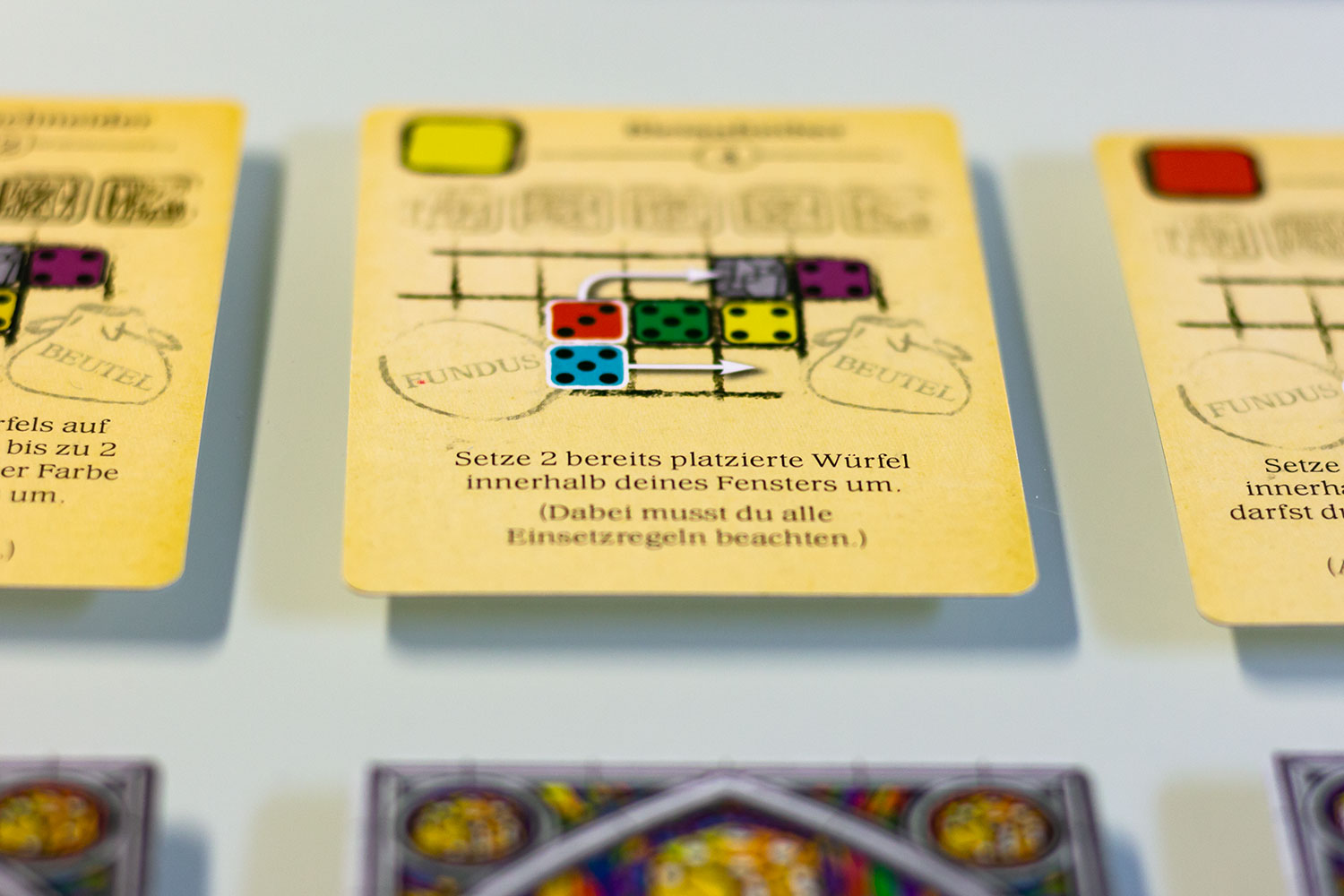 Der Startspieler nimmt für jeden Mitspieler zwei zufällige Würfel aus dem Beutel und am Schluss noch einen zusätzlichen. Diese werden gewürfelt und bilden die Auslage. Nun wird reihum jeweils ein Würfel genommen und in das eigene Fenster eingebaut. Das einbauen erfolgt nach simpel klingenden Regeln: Die Würfel dürfen angrenzend weder die gleiche Farbe, noch die gleich Zahl haben. Diagonal ist es jedoch in Ordnung. Würfel dürfen nur angrenzend oder diagonal ausgelegt werden und sie müssen die Vorgabe der Musterkarte einhalten. Nach der ersten Runde wird in umgekehrter Reihenfolge gespielt. Das hat zur Folge, dass der letzte Spieler gleich zweimal an der Reihe ist.