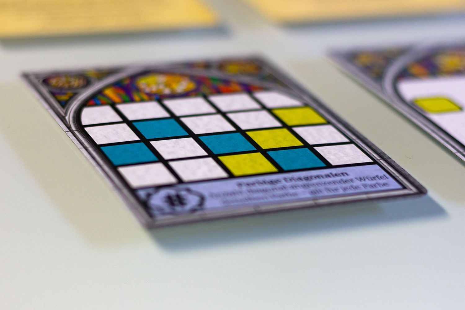 Die Spielregeln sind mit vier A4 Seiten recht knappgehalten und im Prinzip ist die Regel sehr einfach. Jeder Spieler hat ein Kirchenfenster vor sich liegen, in das eine von zwei doppelseitigen Musterkarten, nach eigener Wahl eingesteckt wird. Diese Karte zeigt an, wie viele Gunststeine der Spieler erhält. Sie werden neben das Kirchenfenster gelegt. Unterhalb der kleinen Rundanzeige werden drei von 12 Werkzeugkarten ausgelegt und darunter noch drei von 10 öffentlichen Auftragskarten. Jeder Spieler erhält noch eine eigene Auftragskarte und schon wird gestartet.