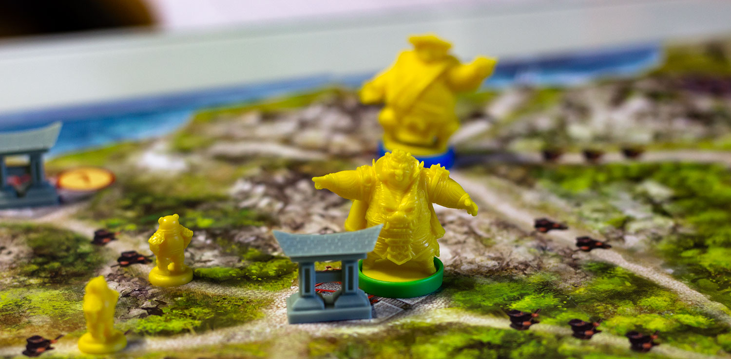 - Bewegung: Einer der Helden wird bewegt. Es dürfen nur Wege passiert werden, für die genug Stärke vorhanden ist. Es gibt Abschnitte mit 1-4 Ninjas. Alle Helden haben am Anfang eine Stärke von eins. Wird ein Held von einem Ort zu einen Nachbarort bewegt, so erledigt er immer gemäß seiner Stärke Ninjas und ersetzt diese mit eigenen Wächtern. Ist die Straße komplett befriedet, darf der Clan mit den meisten Wächtern sein Wegplättchen auslegen (alternativ ein neutrales, falls kein passendes mehr im Vorrat ist).