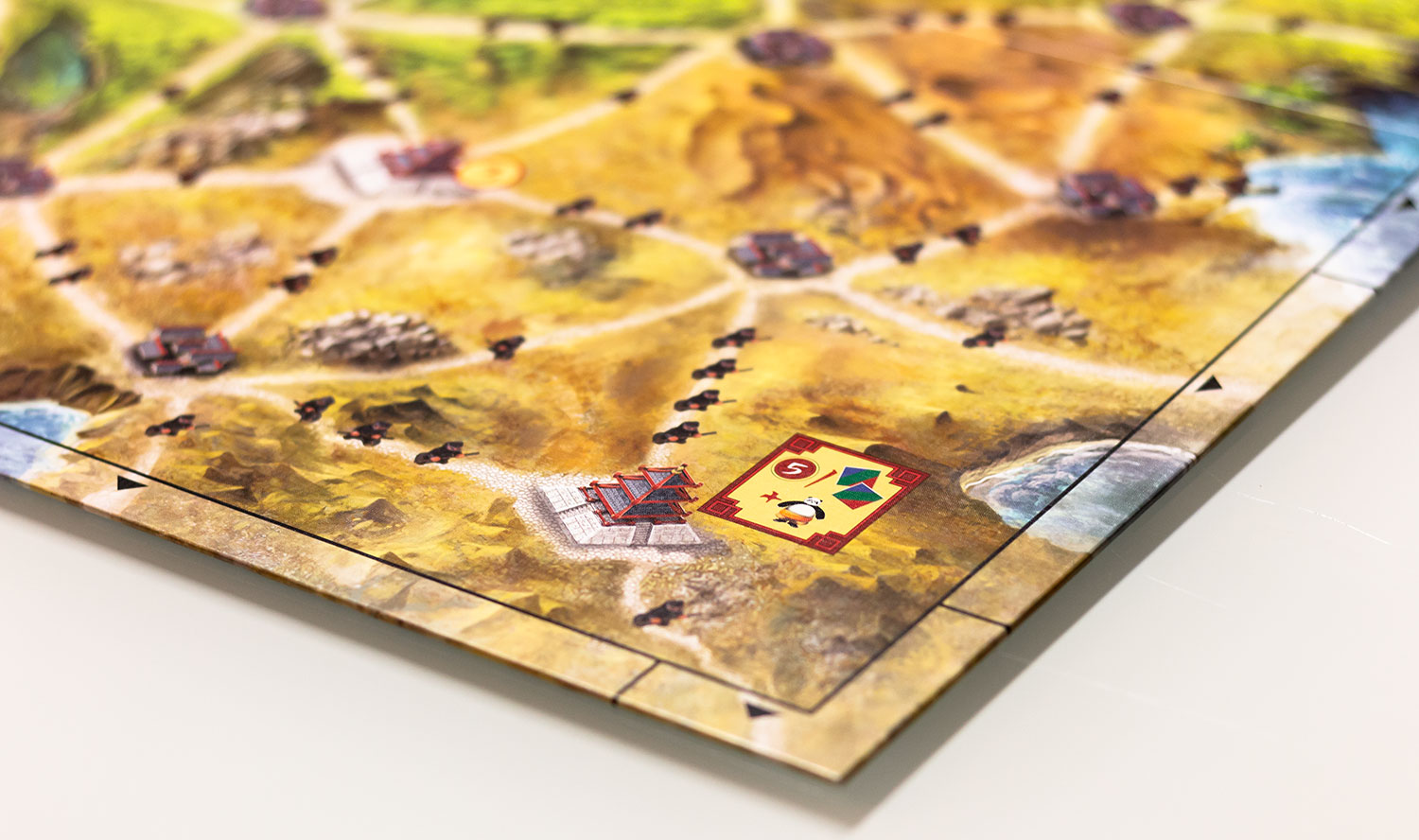 Das Spielfeld und der Aktionsplan wird nebeneinander ausgelegt. Nun werden die Startgebäudekarten gemischt und auf dem Plan an die Startorte ausgelegt, umgedreht und um die entsprechenden Gebäude (Markt, Torbögen und Pagoden) ersetzt. Die überzähligen Gebäude werden am Spielfeldrand bereitgelegt. Dort landen auch die Stärke und Missionsplättchen. Die sechs Stadtkarten werden offen in eine Reihe gelegt.