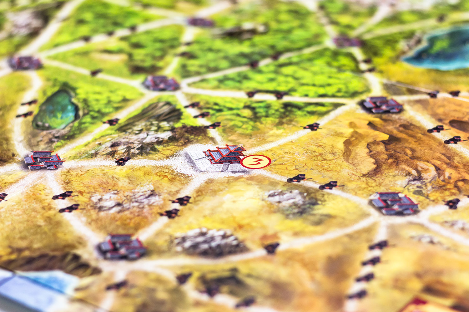 - Gebäude errichten: um eine Gebäude errichten zu dürfen, müssen sich genug Wachen auf den angrenzenden Straßen befinden. Sobald an einem Ort drei Gebäude errichtet worden sind, wandelt sich das Dorf in eine Stadt. Der Spieler, der das auslöst, dar sich eine Stadtkarte (links oder rechts von außen) aus der Auslage aussuchen und den Bonus nehmen. Werden noch einmal drei Gebäude in einer Stadt errichtet, ist es eine Hauptstadt. Zum Gebäude errichten muss der passende Held an einem Ort stehen und die benötigten Aktionspunkte müssen vorhanden sein.