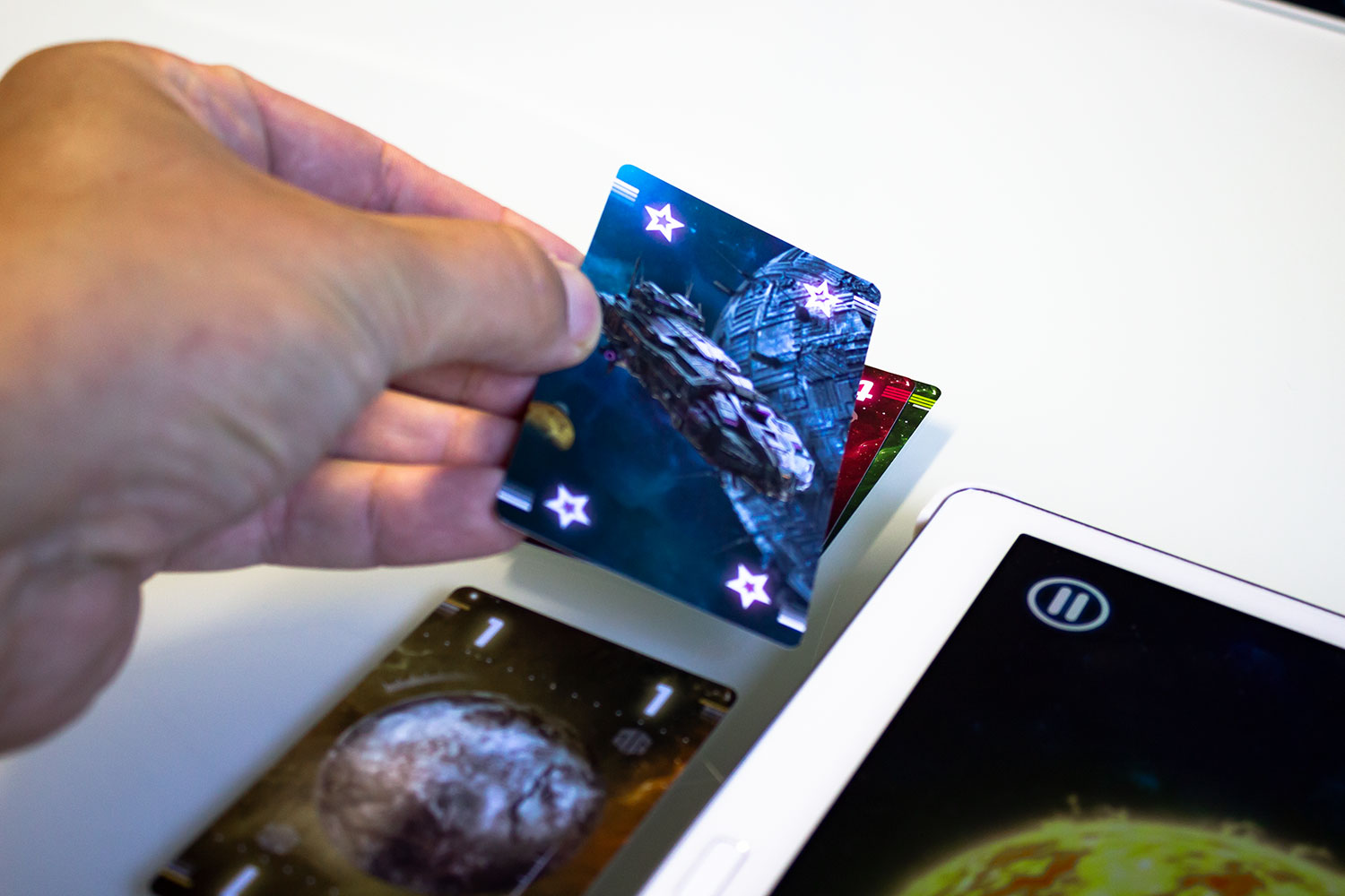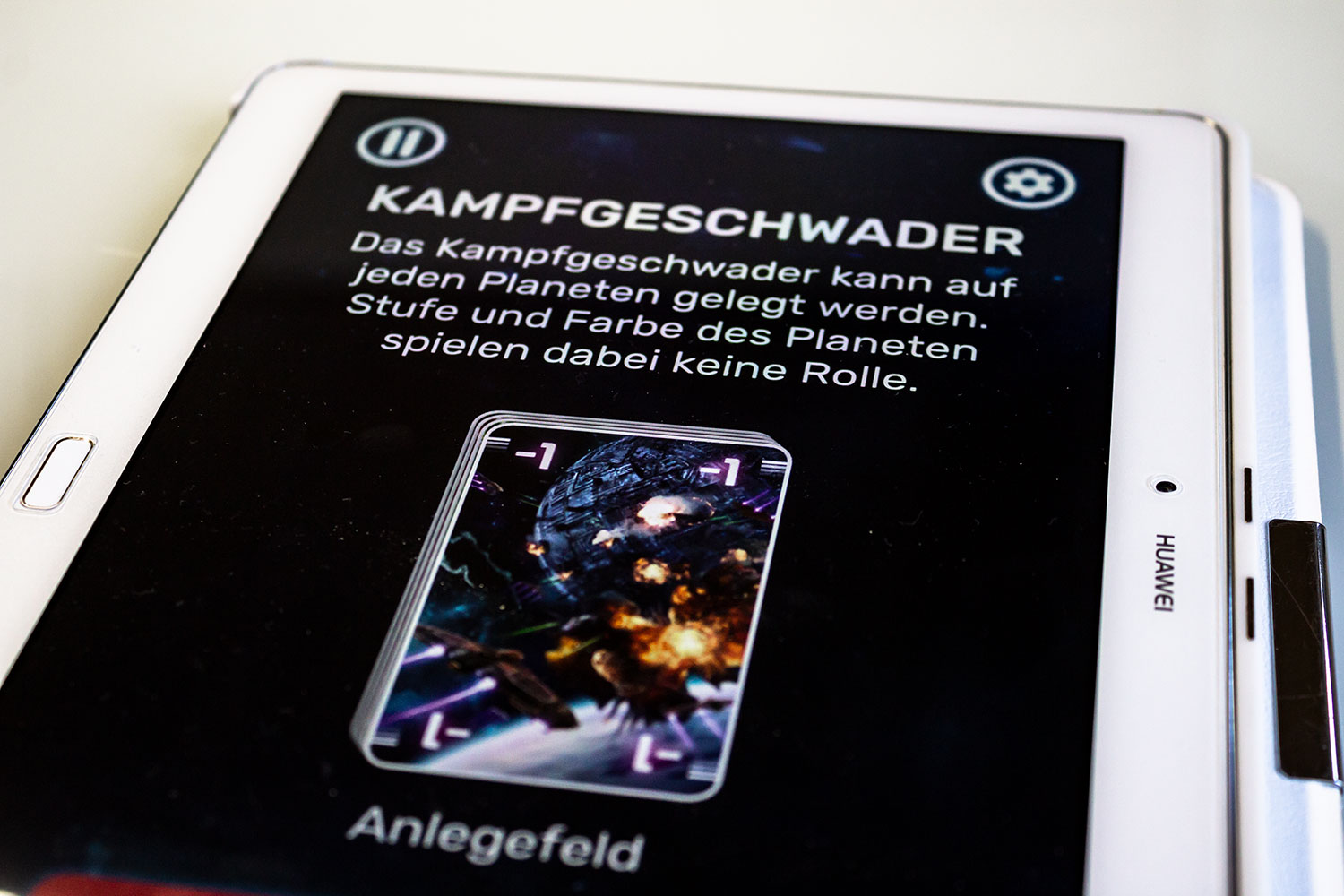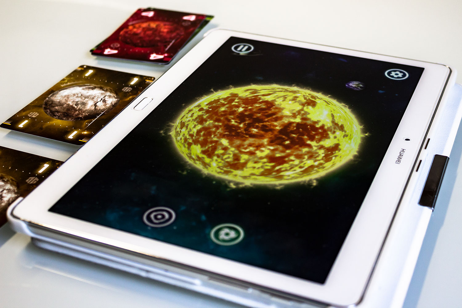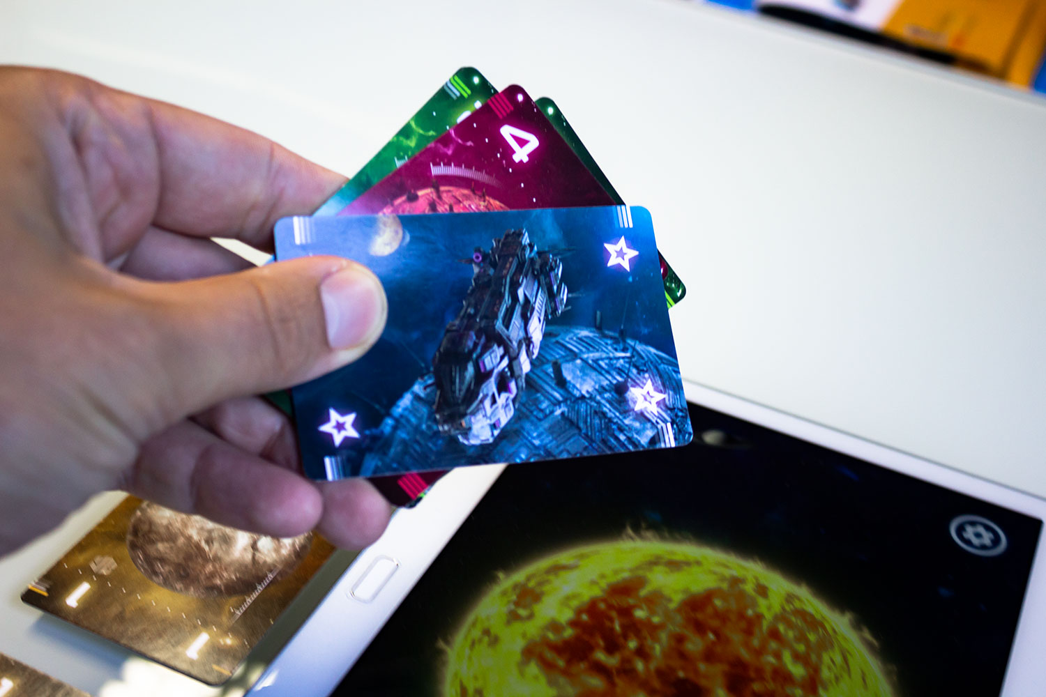 Die Karten bestehen aus Planeten, die Zahlen von 1 bis 4 aufgedruckt haben. Startend mit einer 1er Karte kann eines der acht möglichen „Kartenslots“ rund um das Tablet/Handy eröffnet werden. Nun können dort beliebig viele Karten in aufsteigender oder absteigender Reihenfolge abgelegt werden. Sobald eine 4 ausgelegt ist, kann ein Spieler eine Raumschiffkarte spielen, um die ganzen Planeten eines Stapels zu sich zu nehmen. Gewertet werden am Spielende nur die Karten, die der Farbe der eigenen Fraktion entsprechen und die Raumschiffe, die jeweils 5 Punkte einbringen. Kann keine Karte gespielt werden, werden sie komplett abgeworfen und neue Karten gezogen.